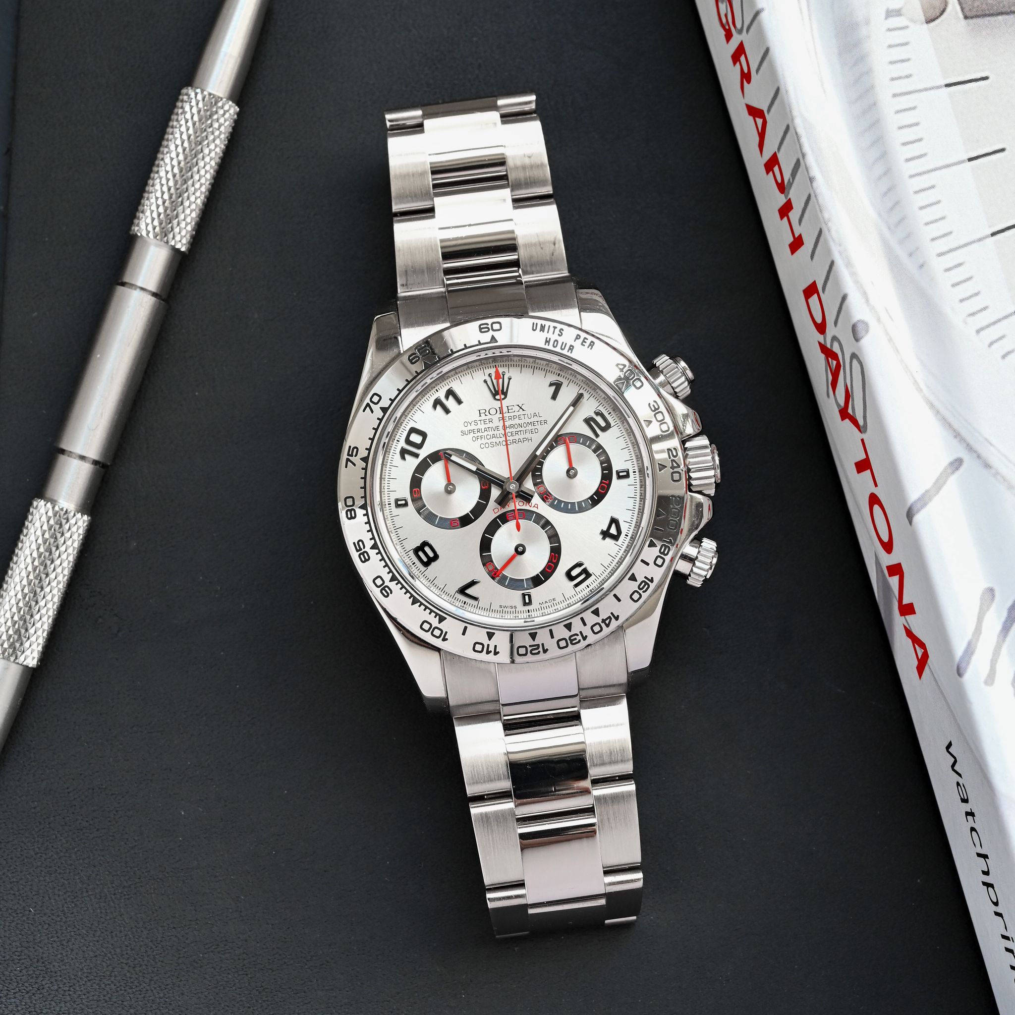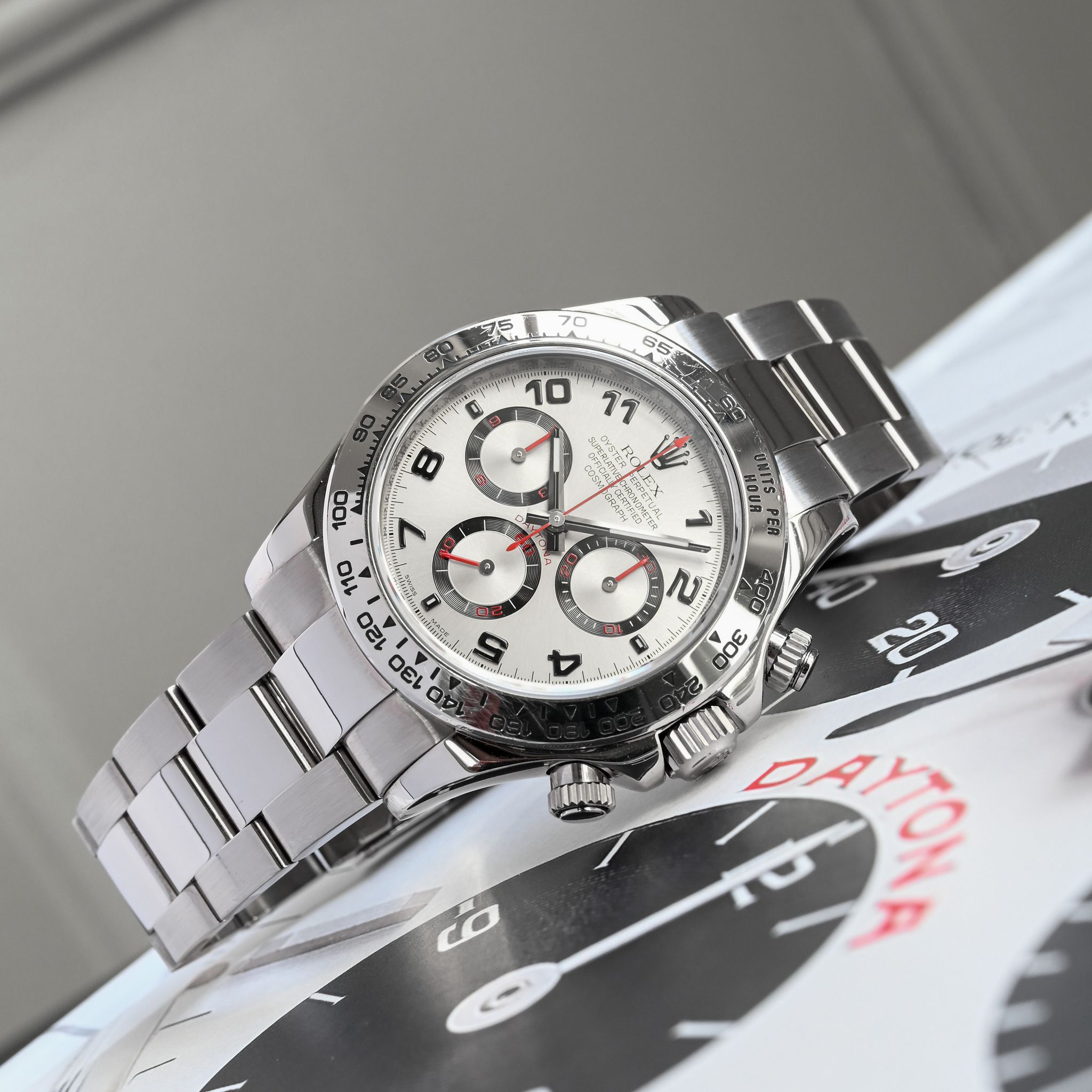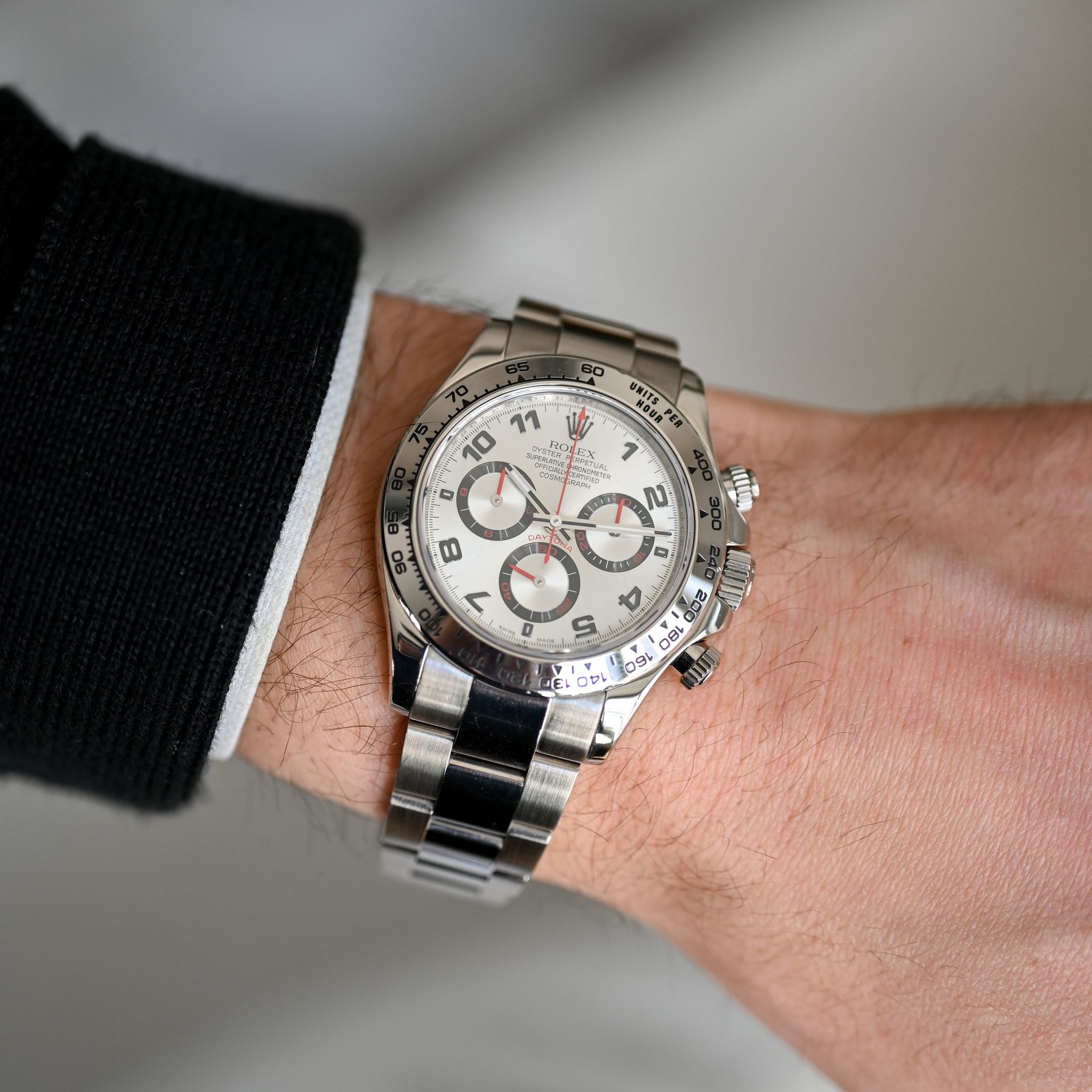 The case has been repolished in the past, is in very good condition and shows some light marks and scratches from use. The case back is in very good condition, with a few light scratches from use.