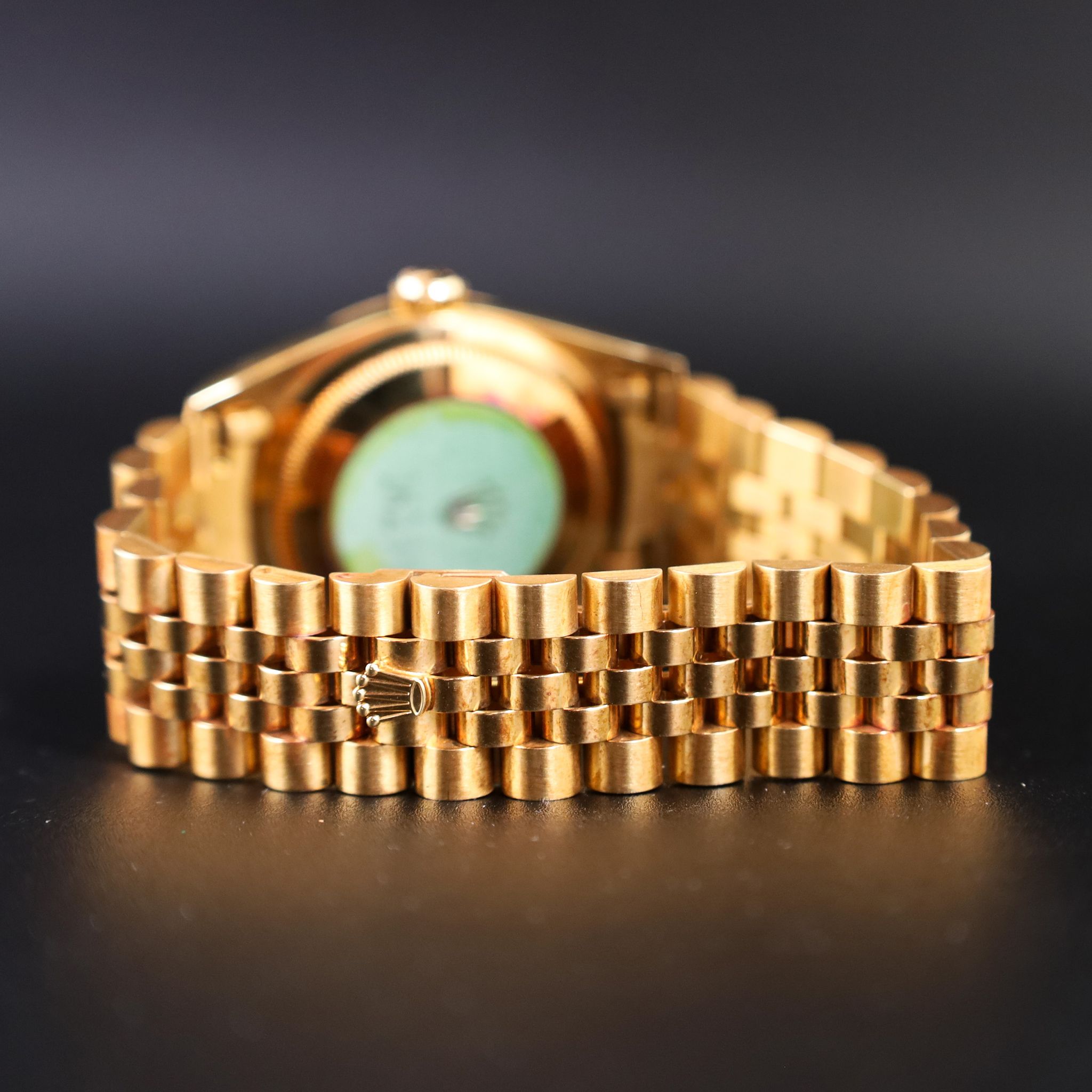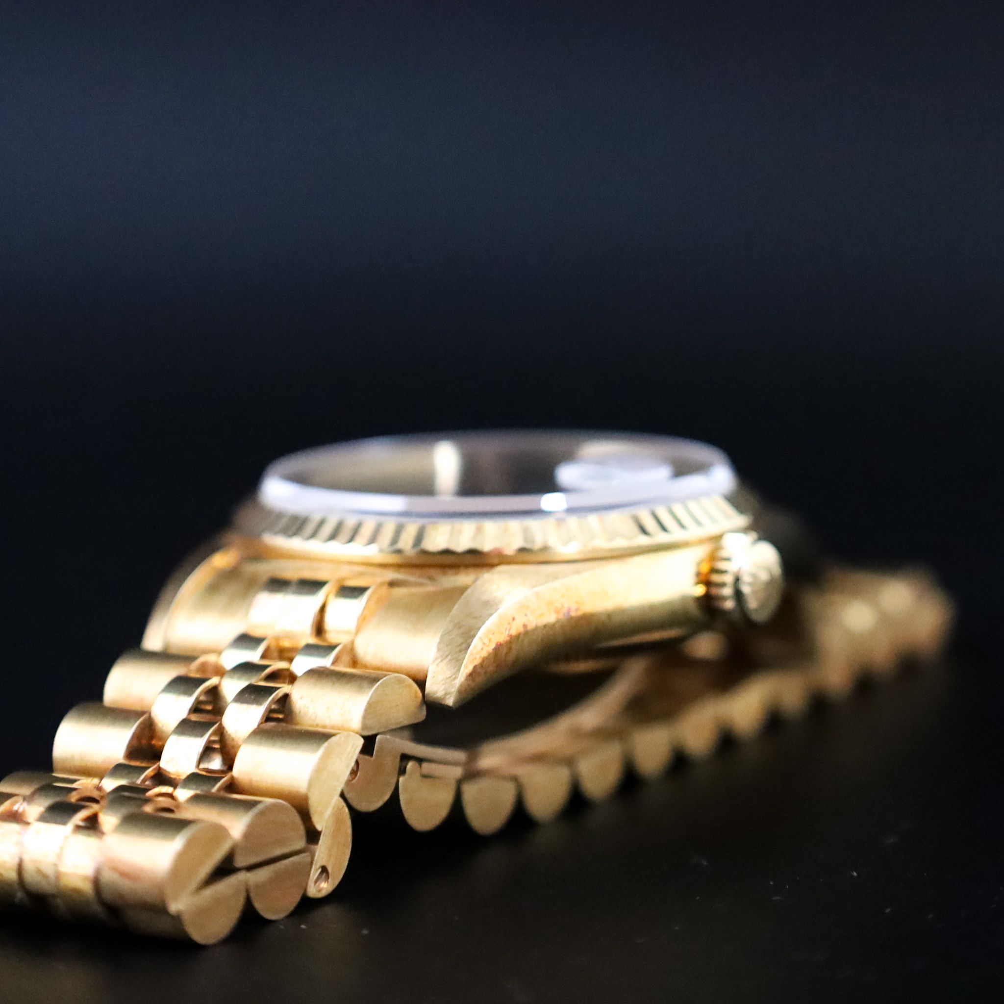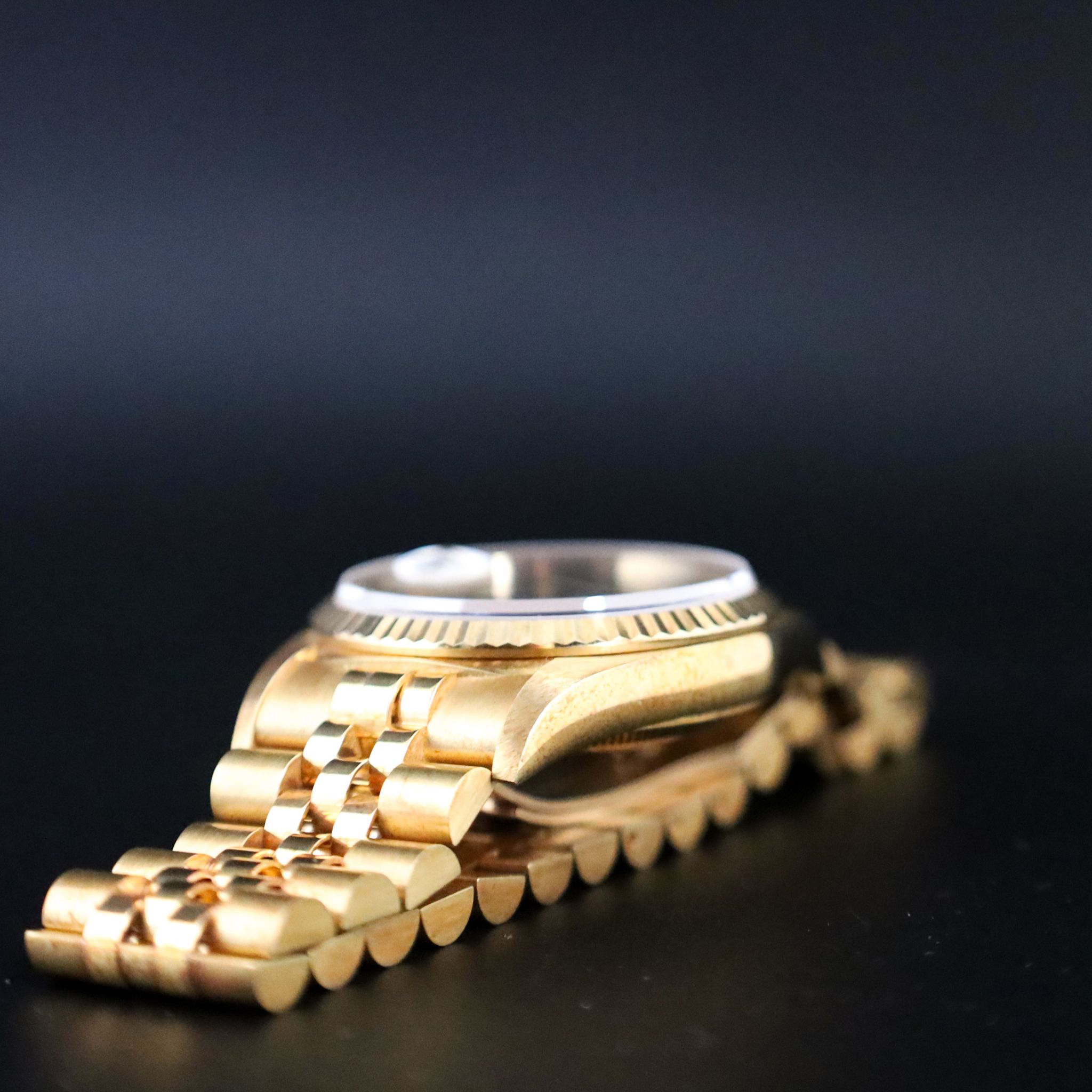 The condition of this piece is out of this world. There is no stretch on the bracelet. The watch is entirely unpolished and retains all original finishing. The dial is spotless. The yellow gold has gorgeous patina/aging all over it indicating how much of its life was spent sitting in a safe somewhere.