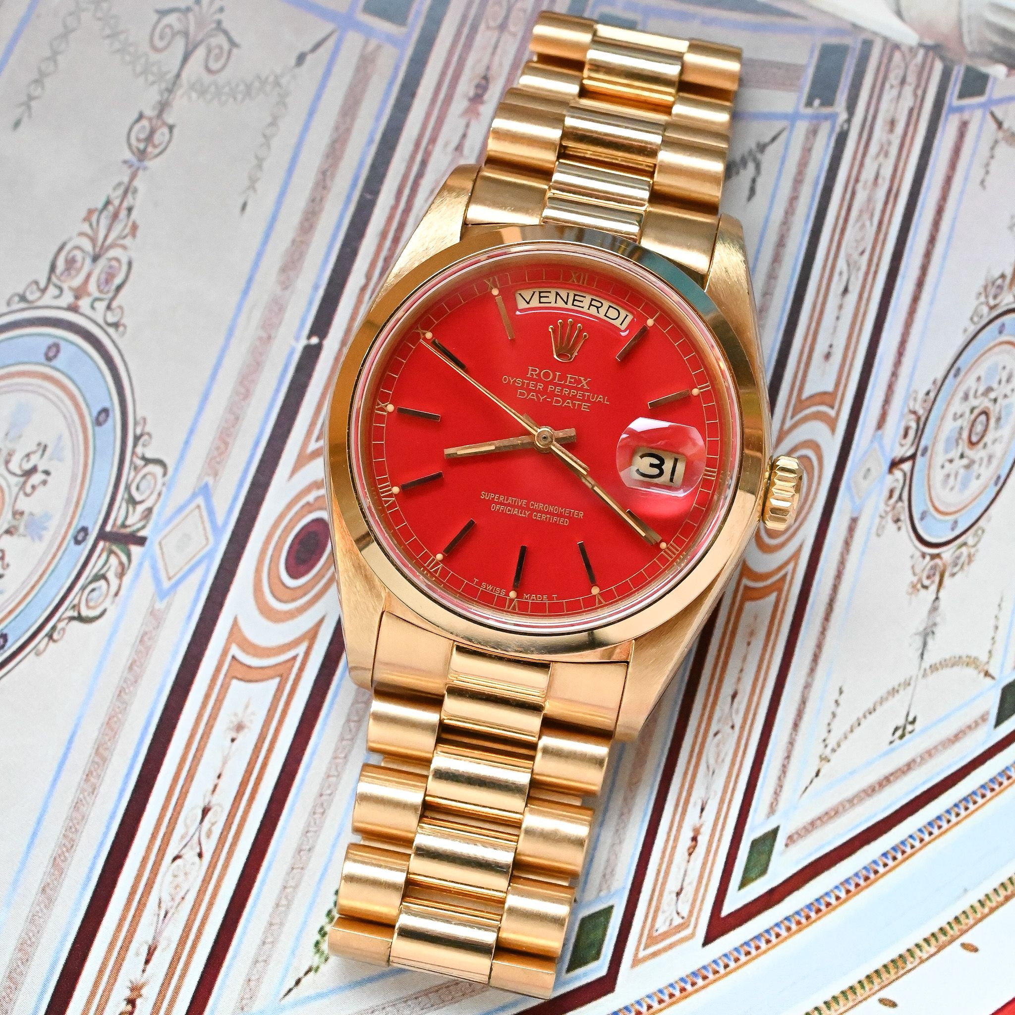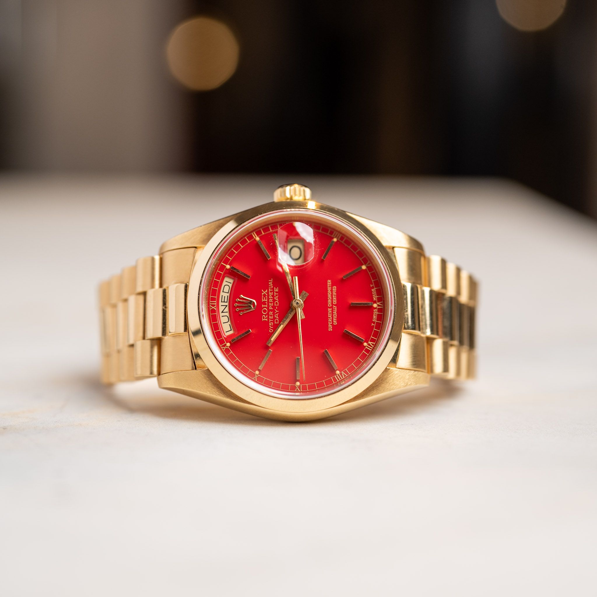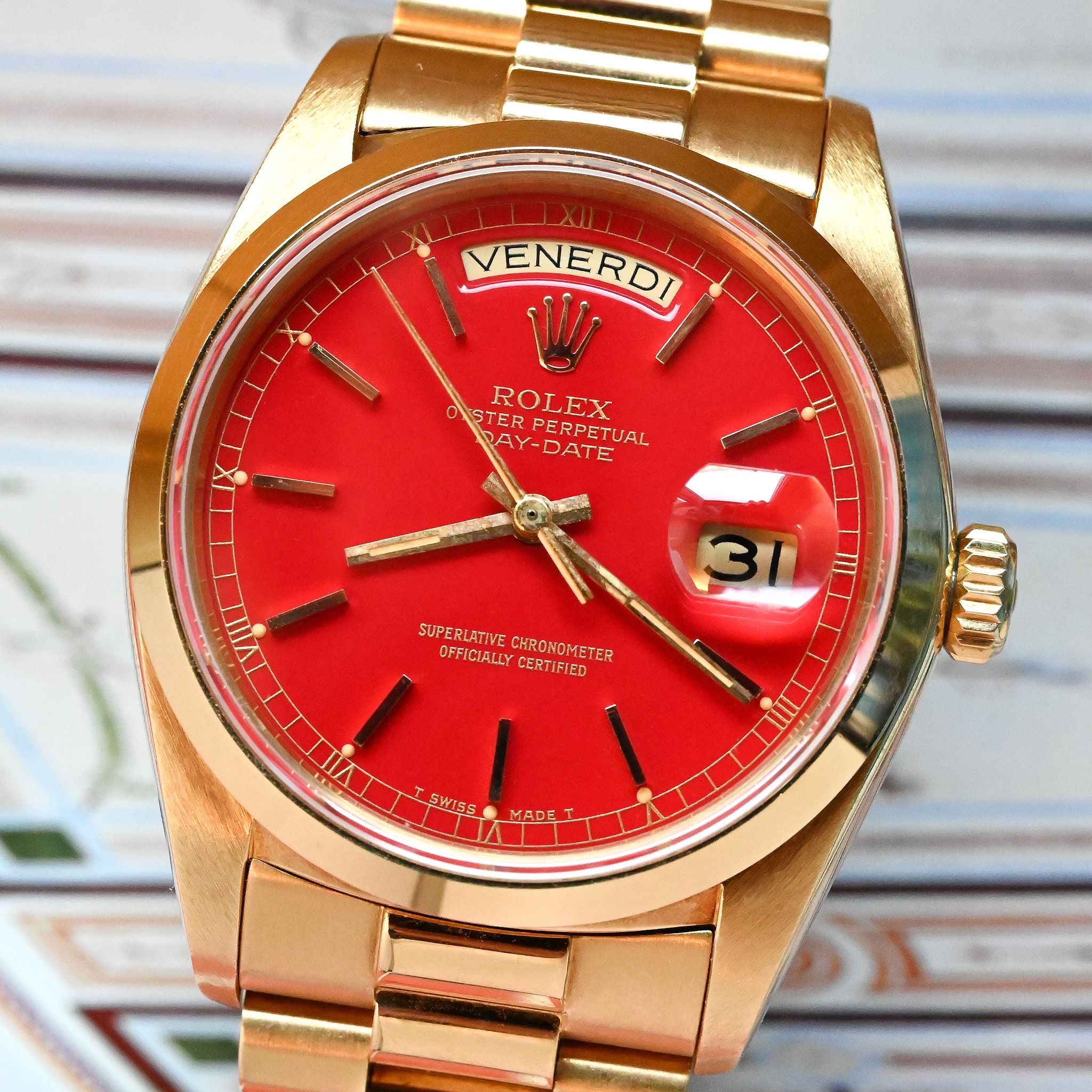 The name comes from a company called Stella, which supplied Rolex dialmakers with the special lacquer and gloss pigment used to make these dials. As these dials were produced over several decades, the colors and shades vary considerably. The example we have is bright red, creating a superb contrast with the yellow gold case.