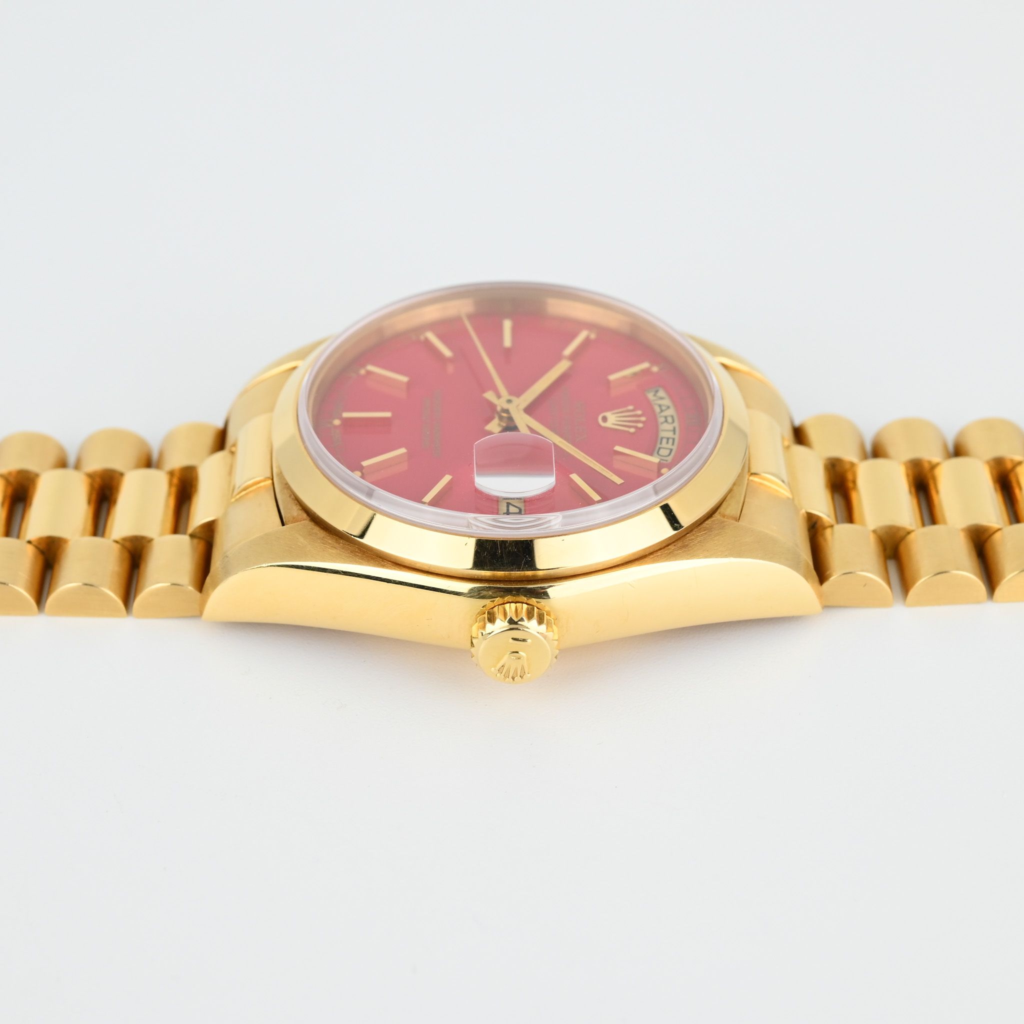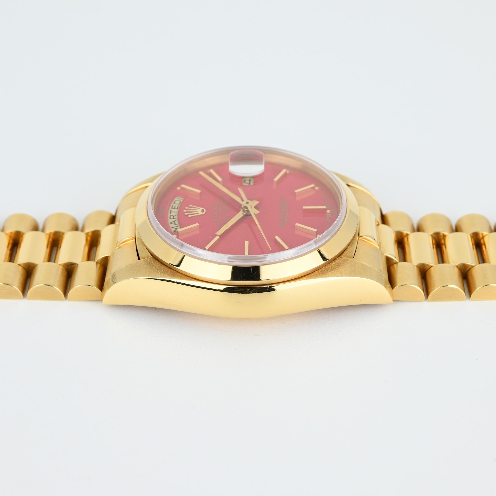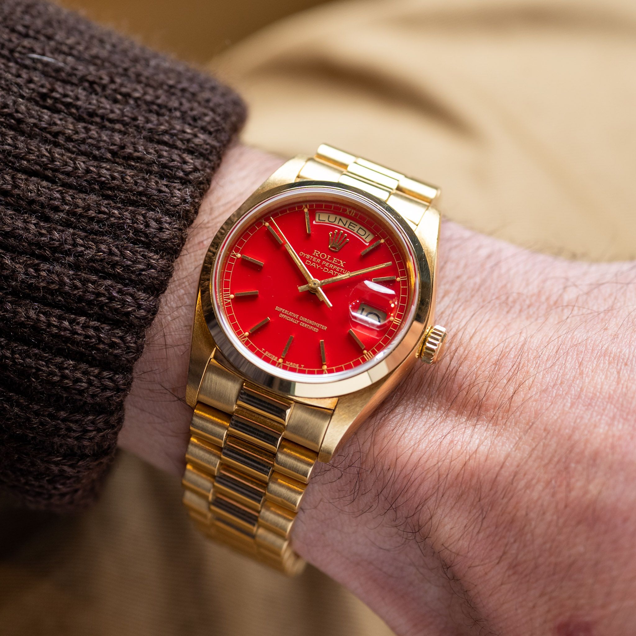 The name comes from a company called Stella, which supplied Rolex dialmakers with the special lacquer and gloss pigment used to make these dials. As these dials were produced over several decades, the colors and shades vary considerably. The example we have is bright red, creating a superb contrast with the yellow gold case.