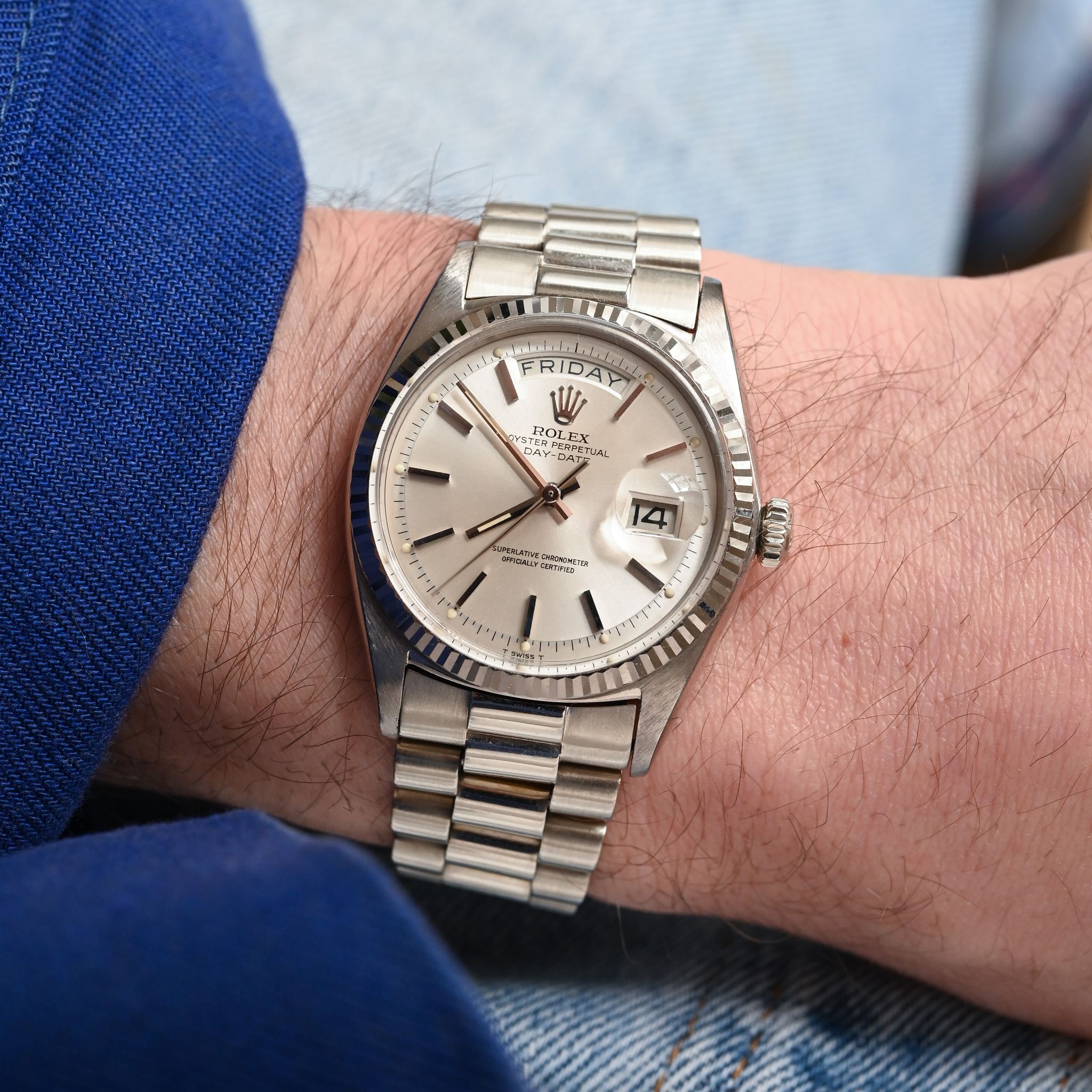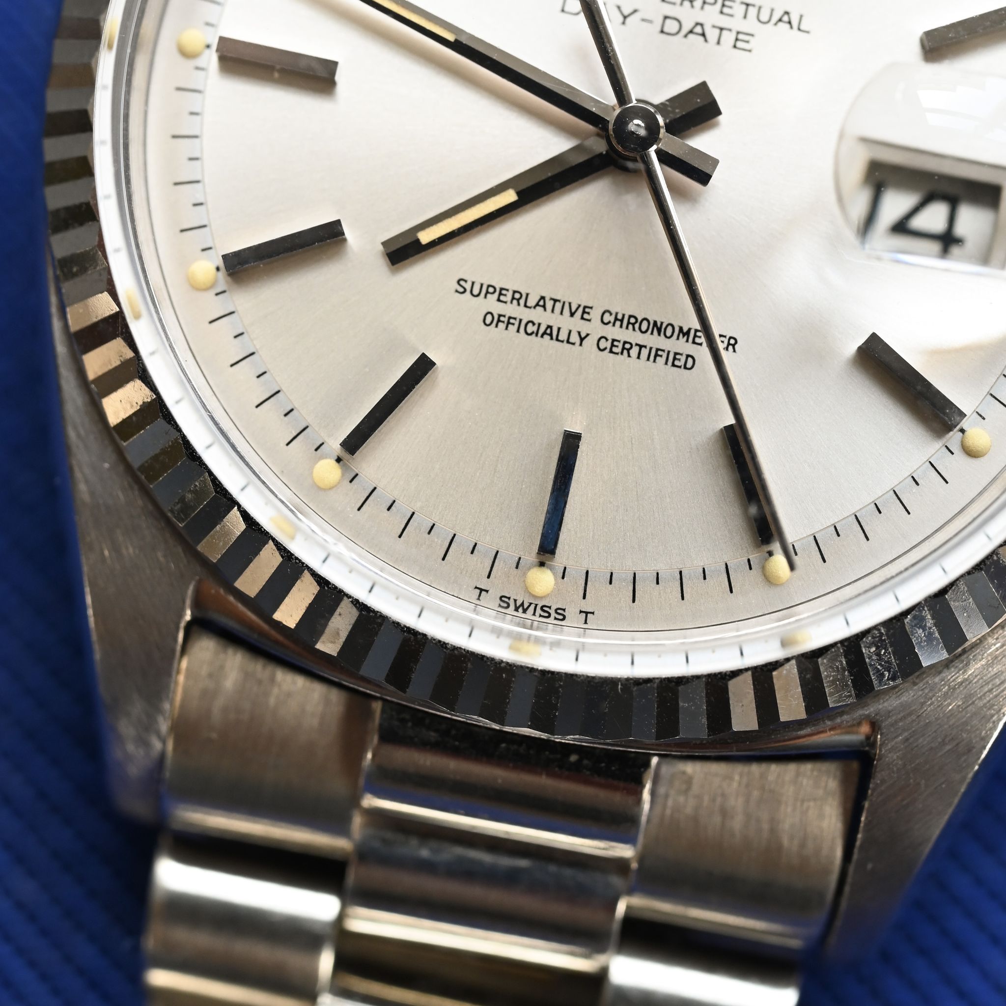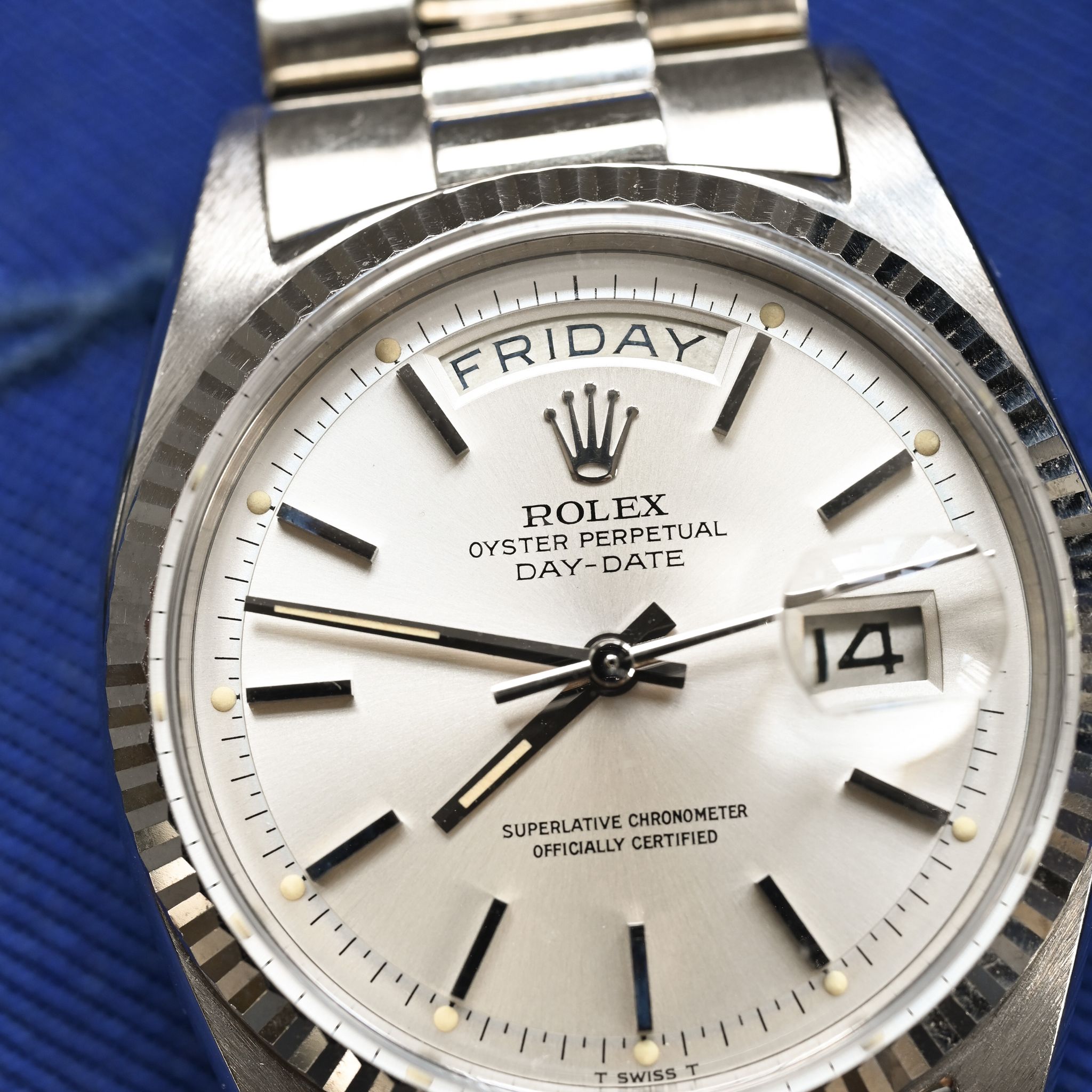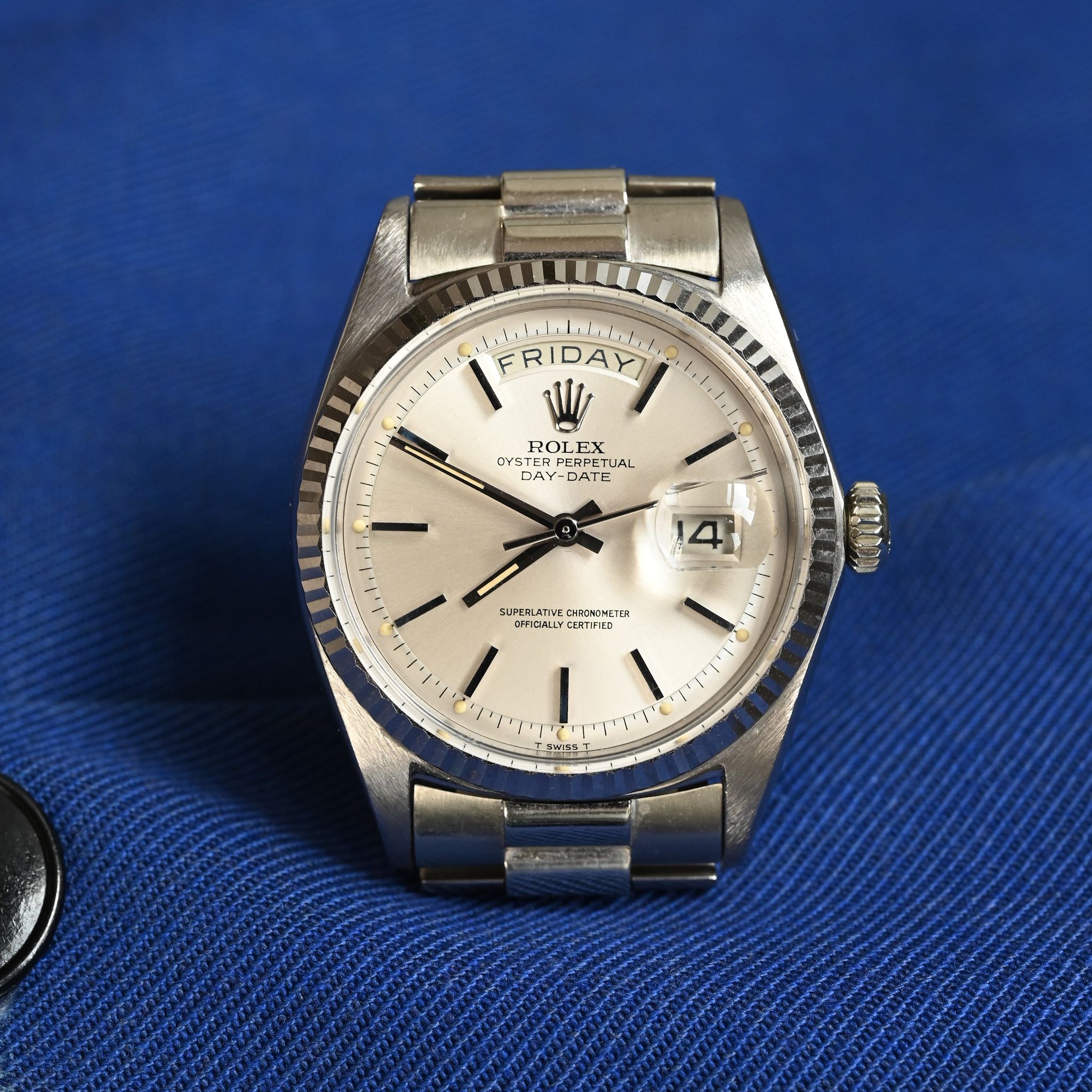 With a diameter of 36mm, reference 1803 was produced from the early 1960s to 1977. It was the first generation of Day-Date to be produced for more than 15 years. The main feature of this model is its domed “Pie-pan” dial and domed Plexiglas crystal. On this precise model, the dial features a graduated minute track and a particularly attractive grey/cream matte finish.
