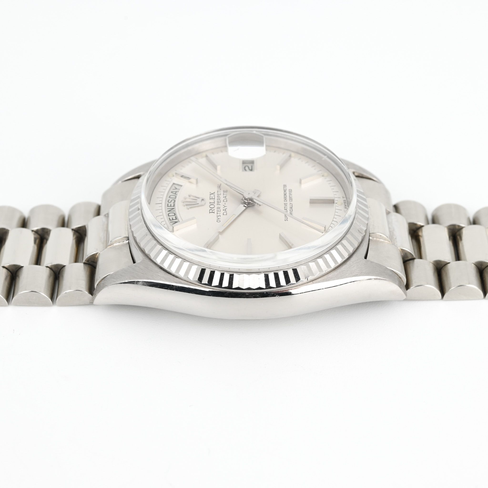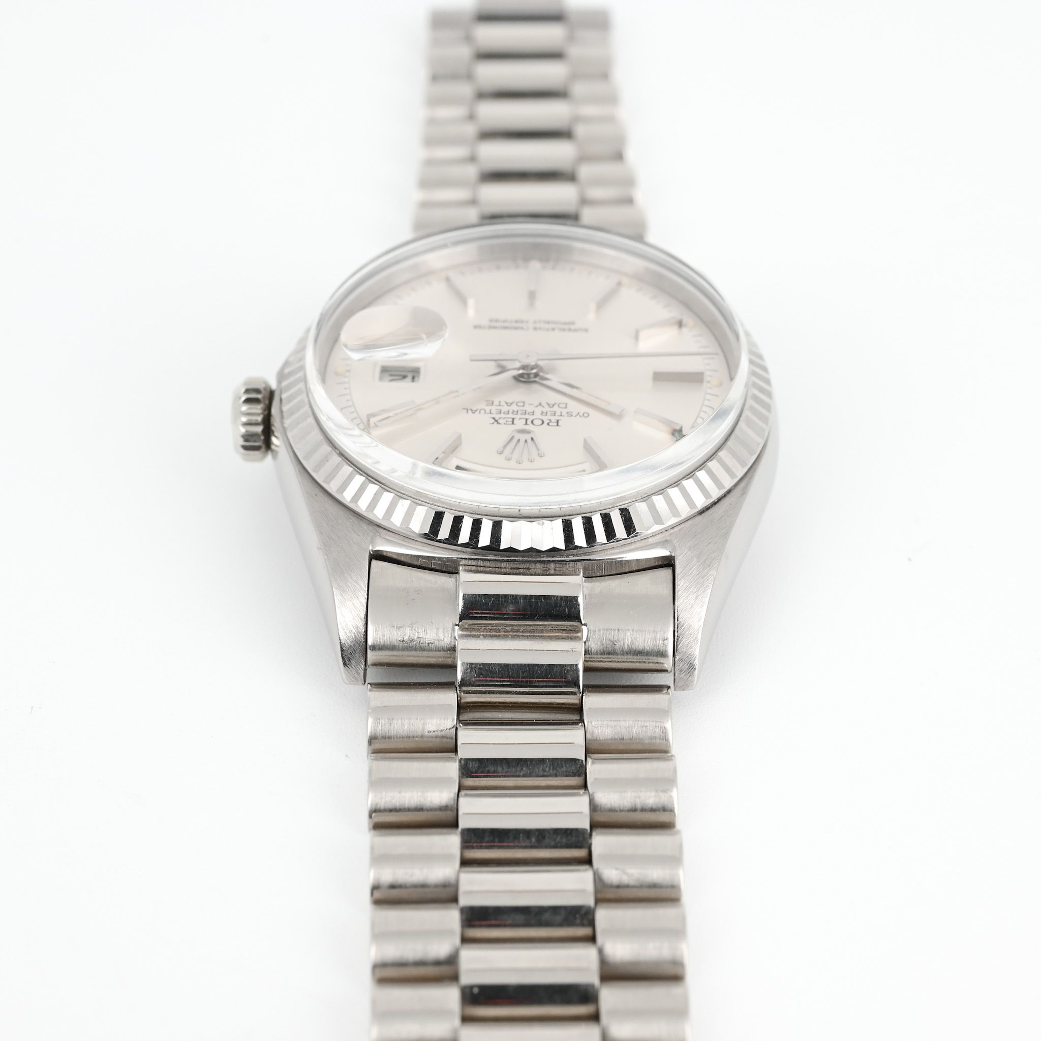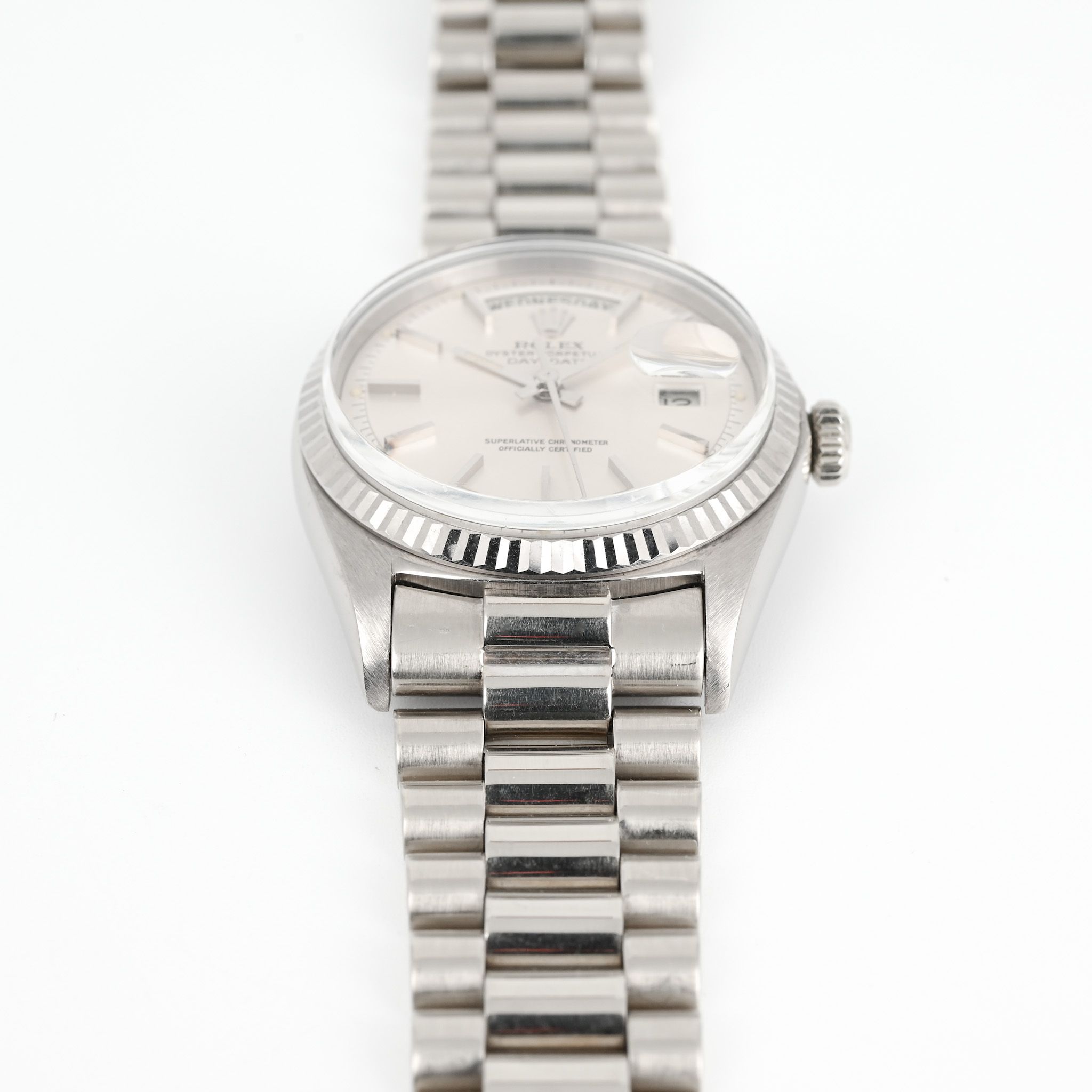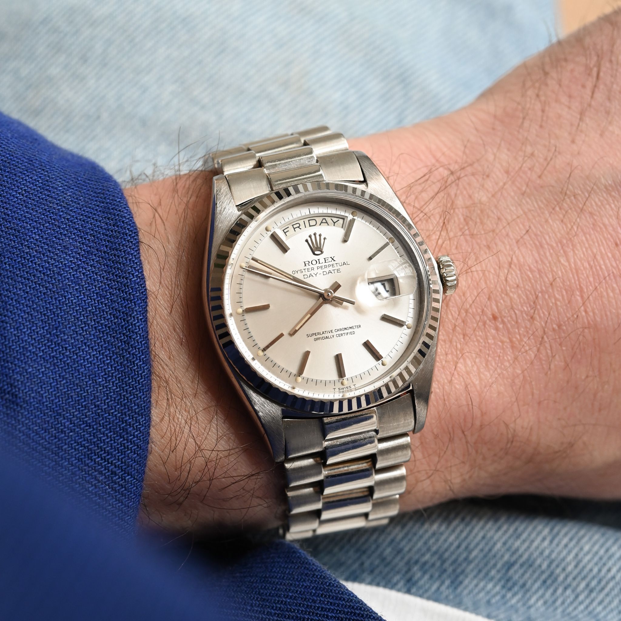 With a diameter of 36mm, reference 1803 was produced from the early 1960s to 1977. It was the first generation of Day-Date to be produced for more than 15 years. The main feature of this model is its domed “Pie-pan” dial and domed Plexiglas crystal. On this precise model, the dial features a graduated minute track and a particularly attractive grey/cream matte finish.