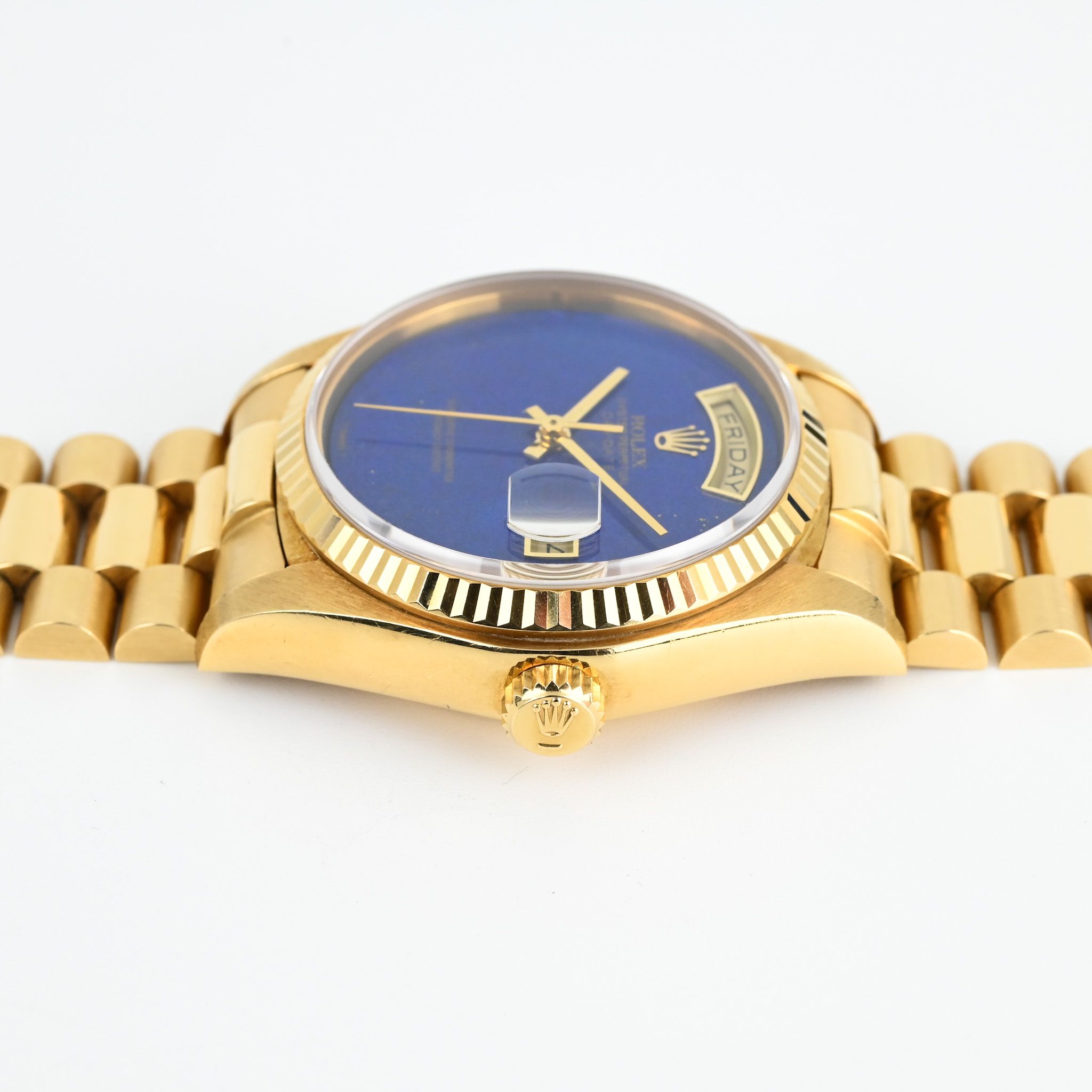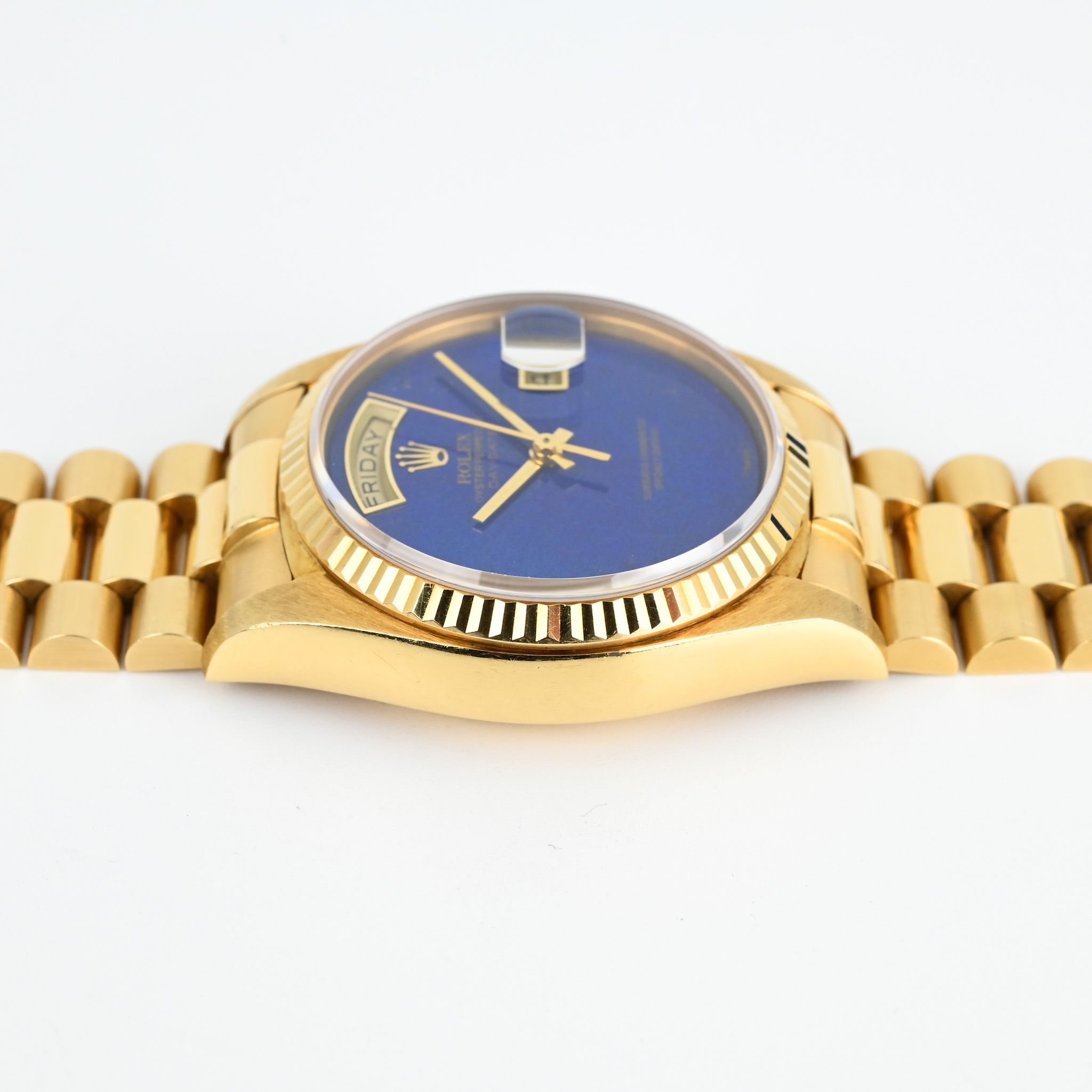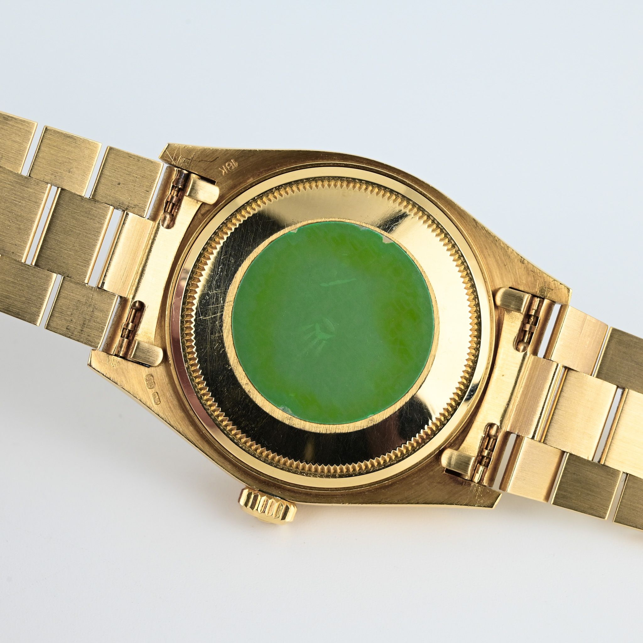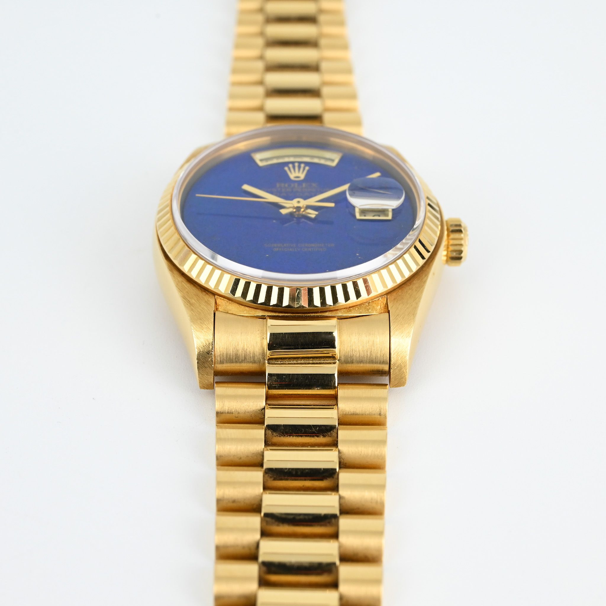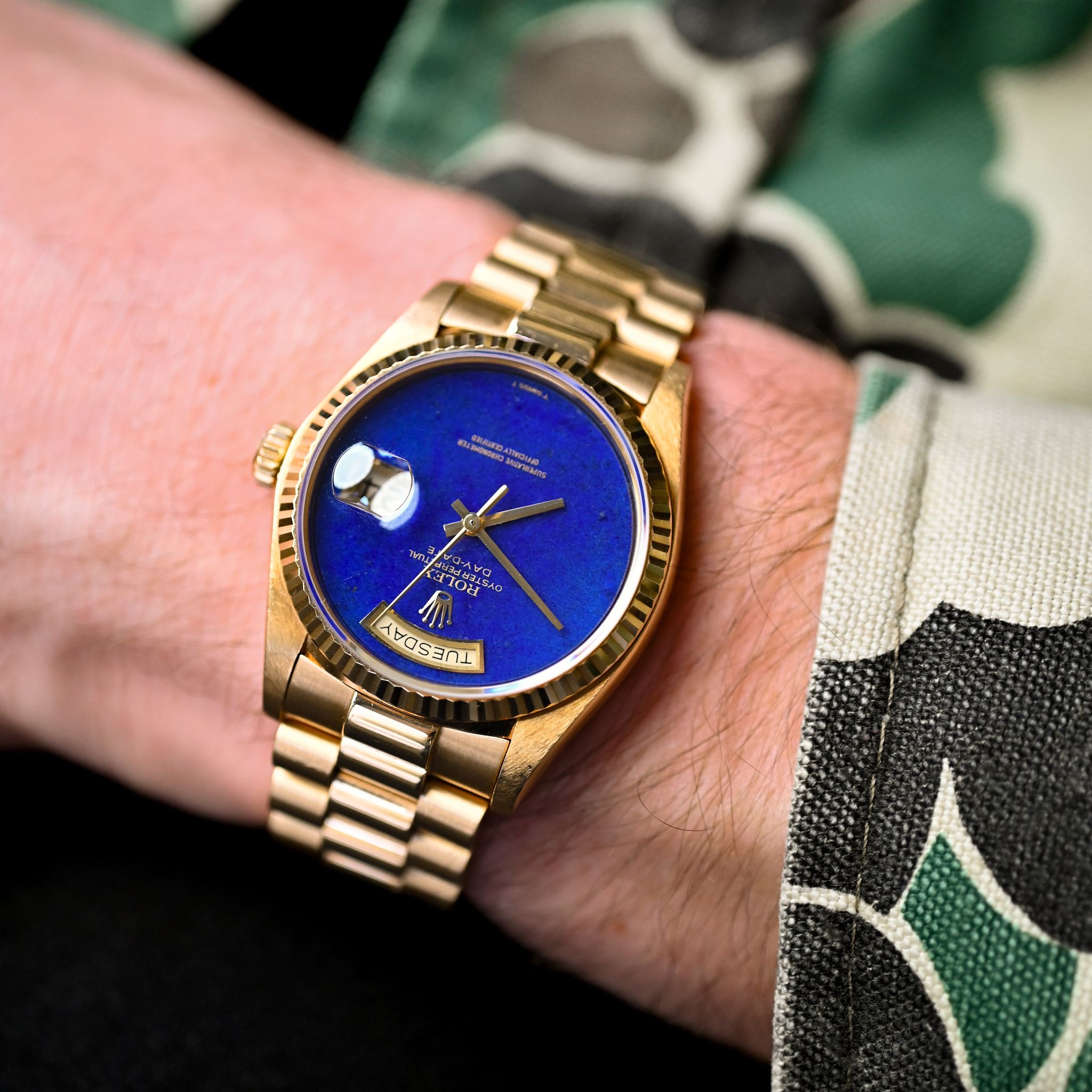 Natural stone dials, such as Lapis lazuli, Onyx or Tiger eye, began to be manufactured by Stern Frères in the early 1970s, thanks to the development of ultrasonic drilling techniques. Rolex, a loyal customer of Stern, was among the first to use these dials in its watches, notably in the Datejust model with four-digit references, and they were later mounted on Day-Dates with the introduction of five-digit references like the 18038 we have here.