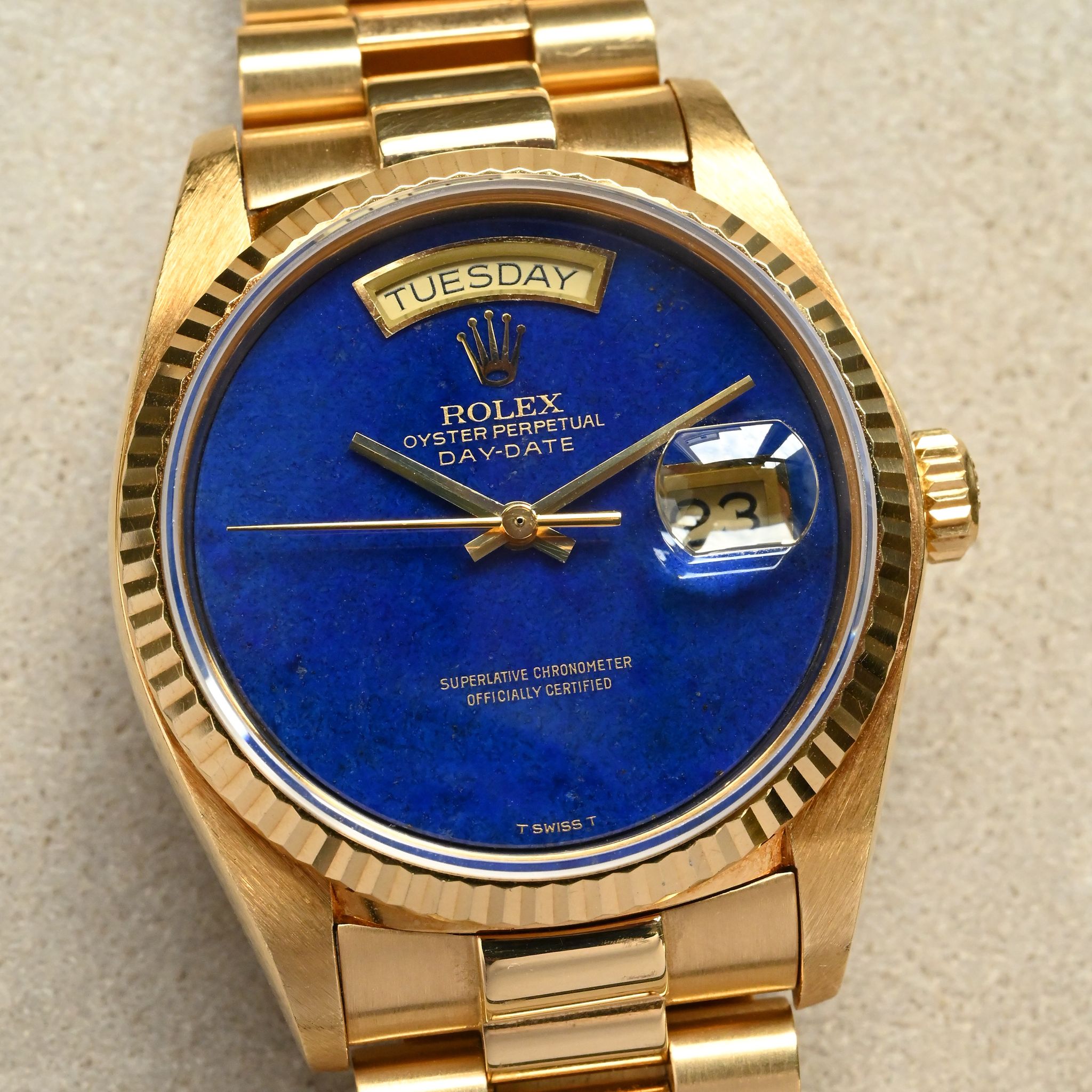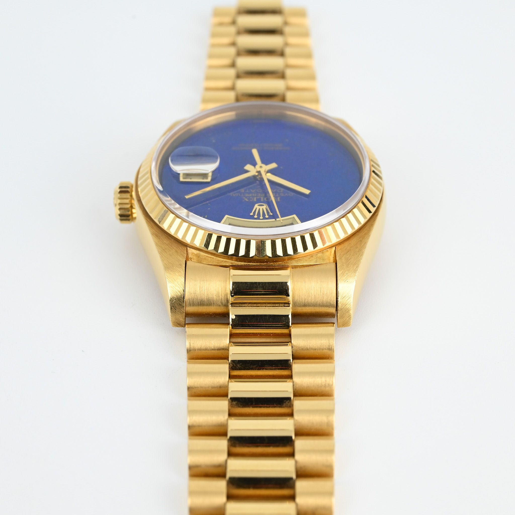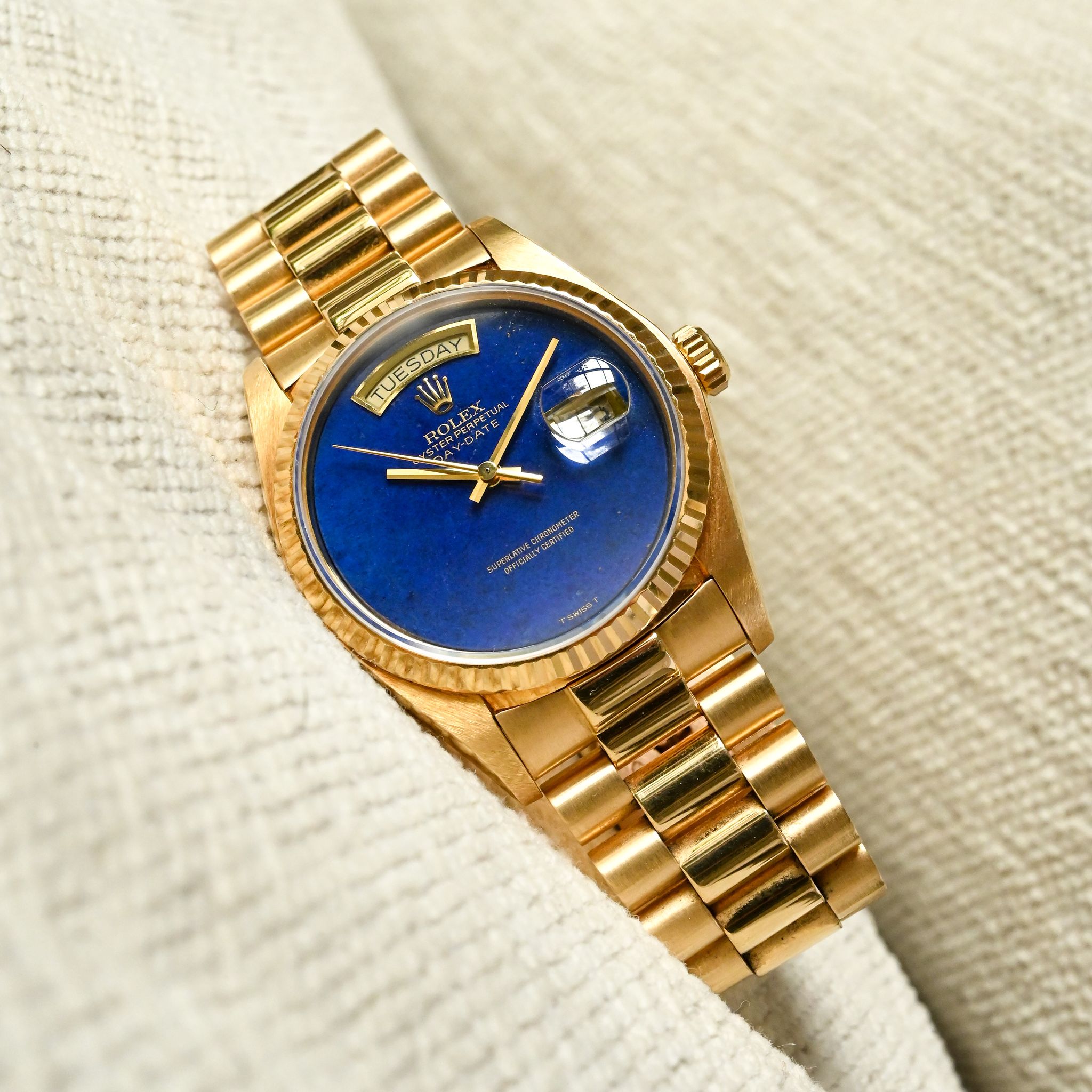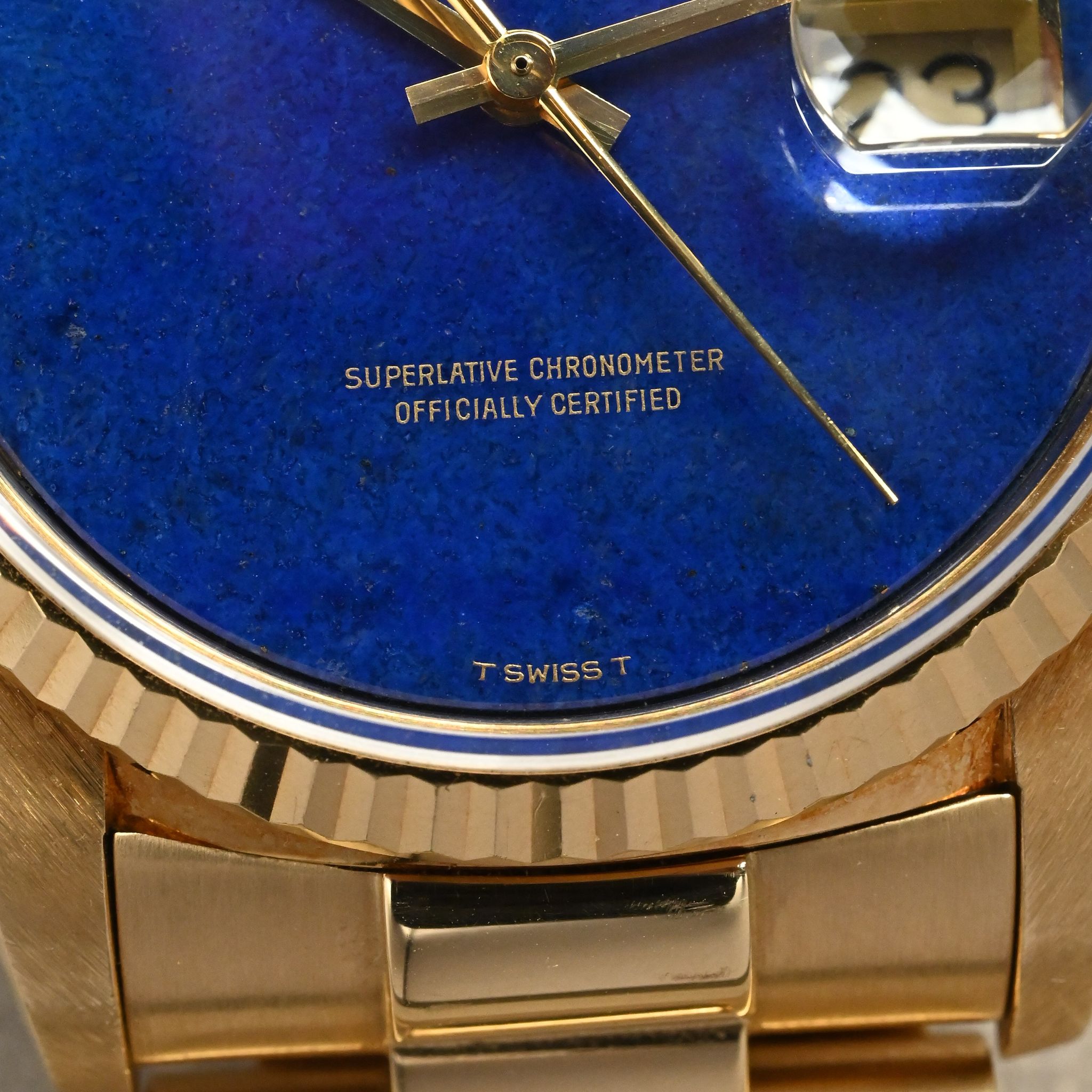 With a diameter of 36mm, reference 18038 was produced between 1978 and 1989. A wide variety of dial configurations were offered at the time, including some in wood or semi-precious stone, as shown here with this superb lapis lazuli dial.
