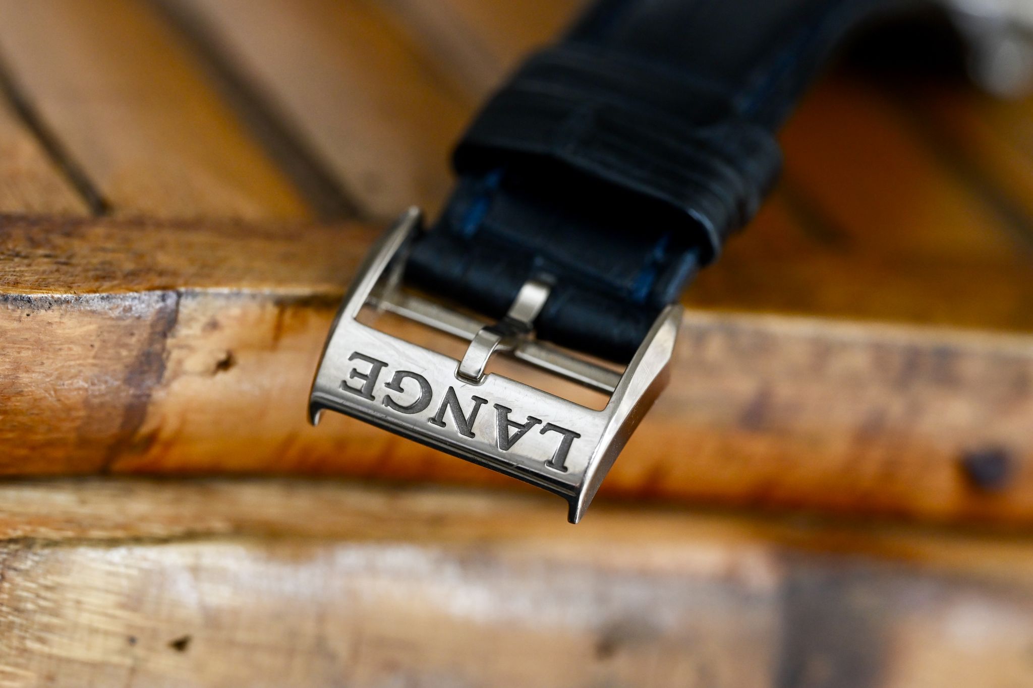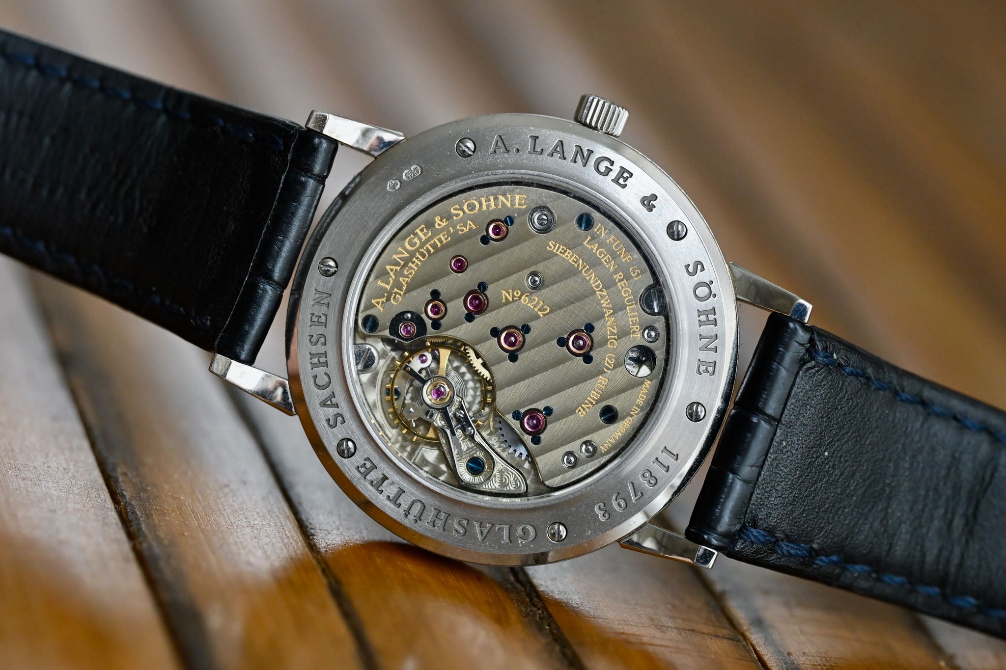 This watch is in very nice condition as you can see showing only small superficial marks from gentle wear. It comes on an oem blue strap with original white gold buckle as well as a Lange presentation box.