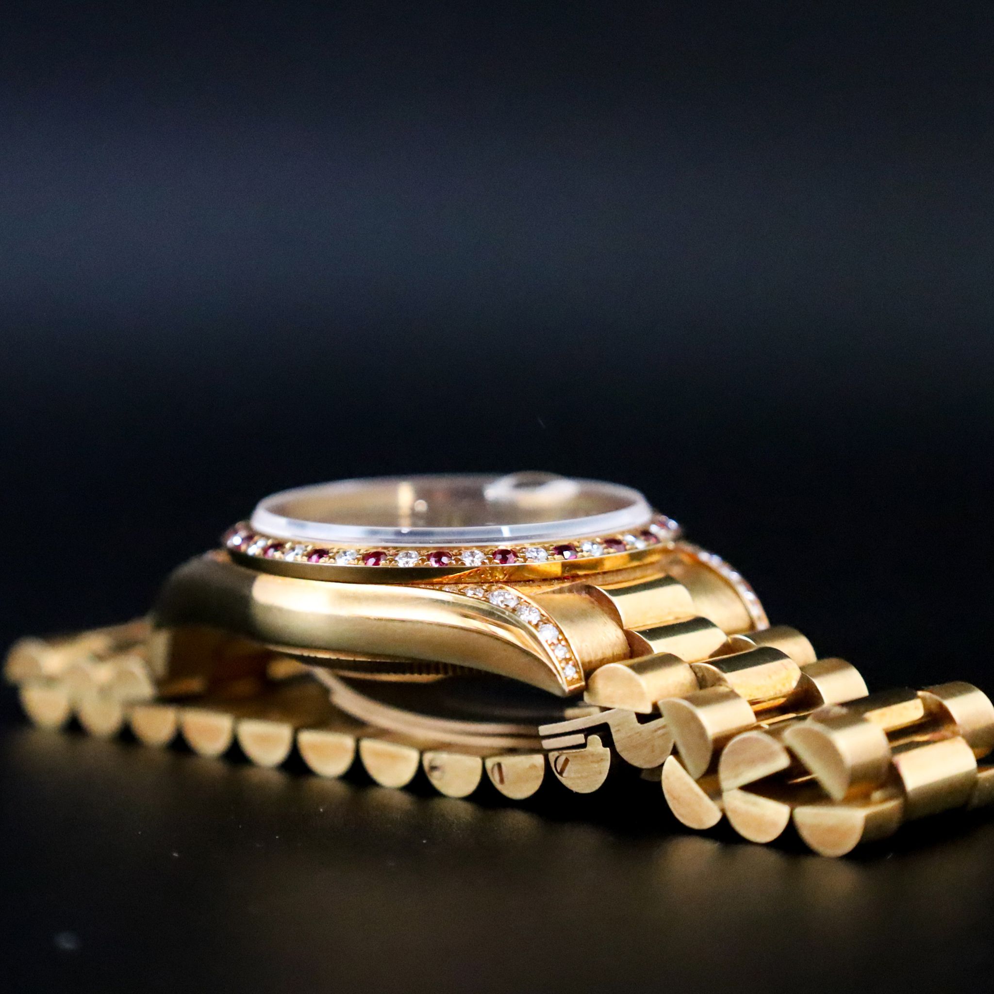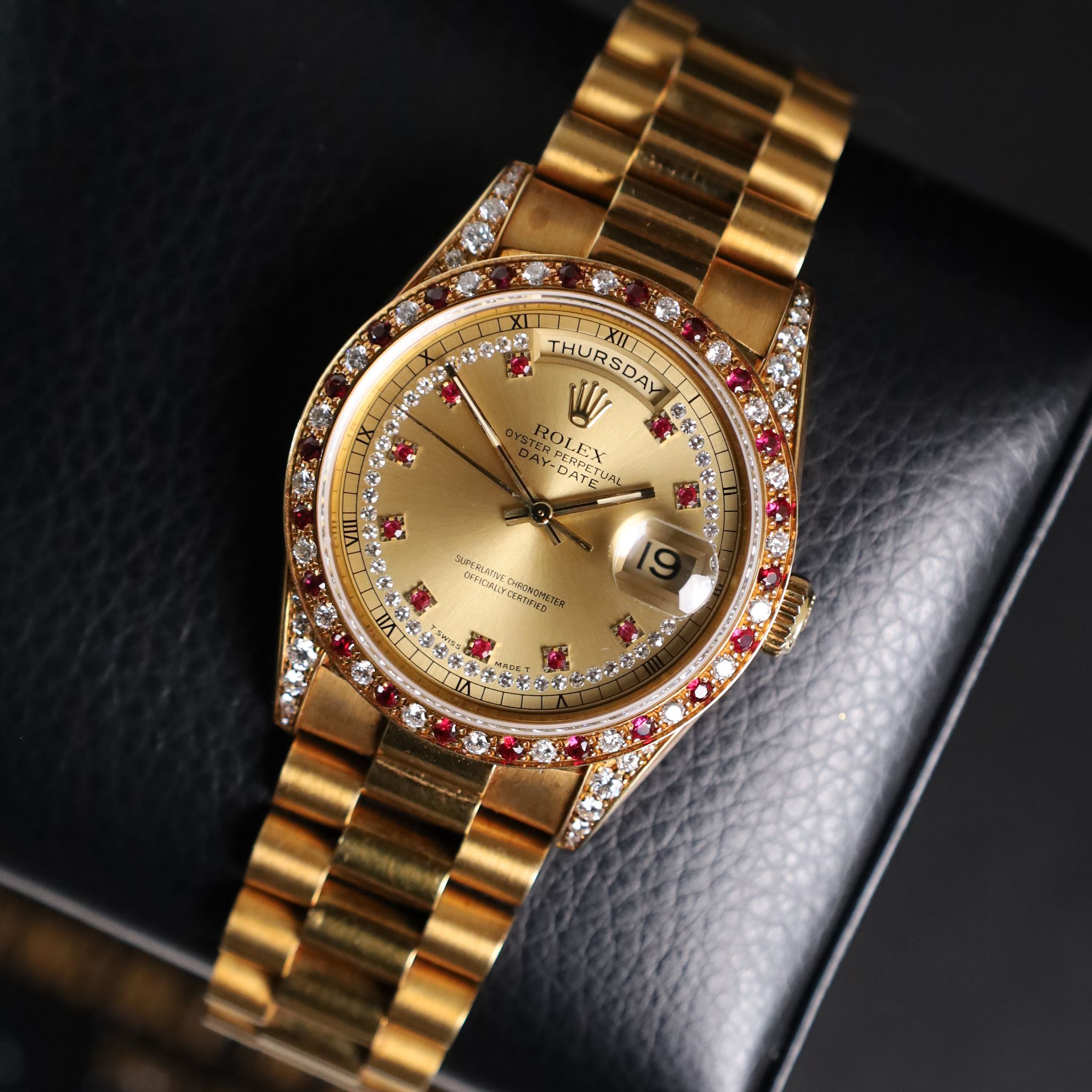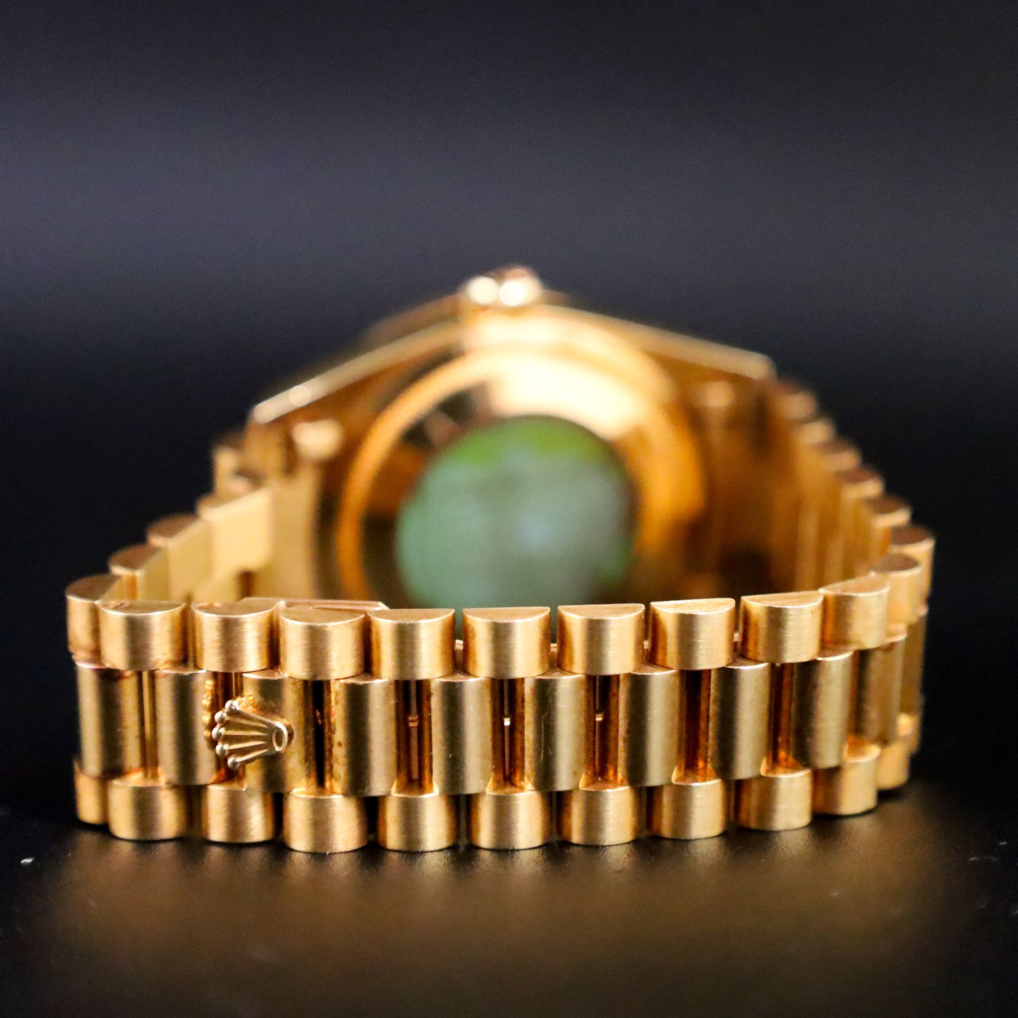 Condition: This piece comes in mint condition. It is unpolished, and the yellow gold is aging nicely. This watch is entirely factory, and is an extremely rare iteration of the 90's daydate. It is very rare to see this variation of this reference, and it I even rarer to see it in this condition with the case back sticker still on. The band is very tight indicating very minimal wear.