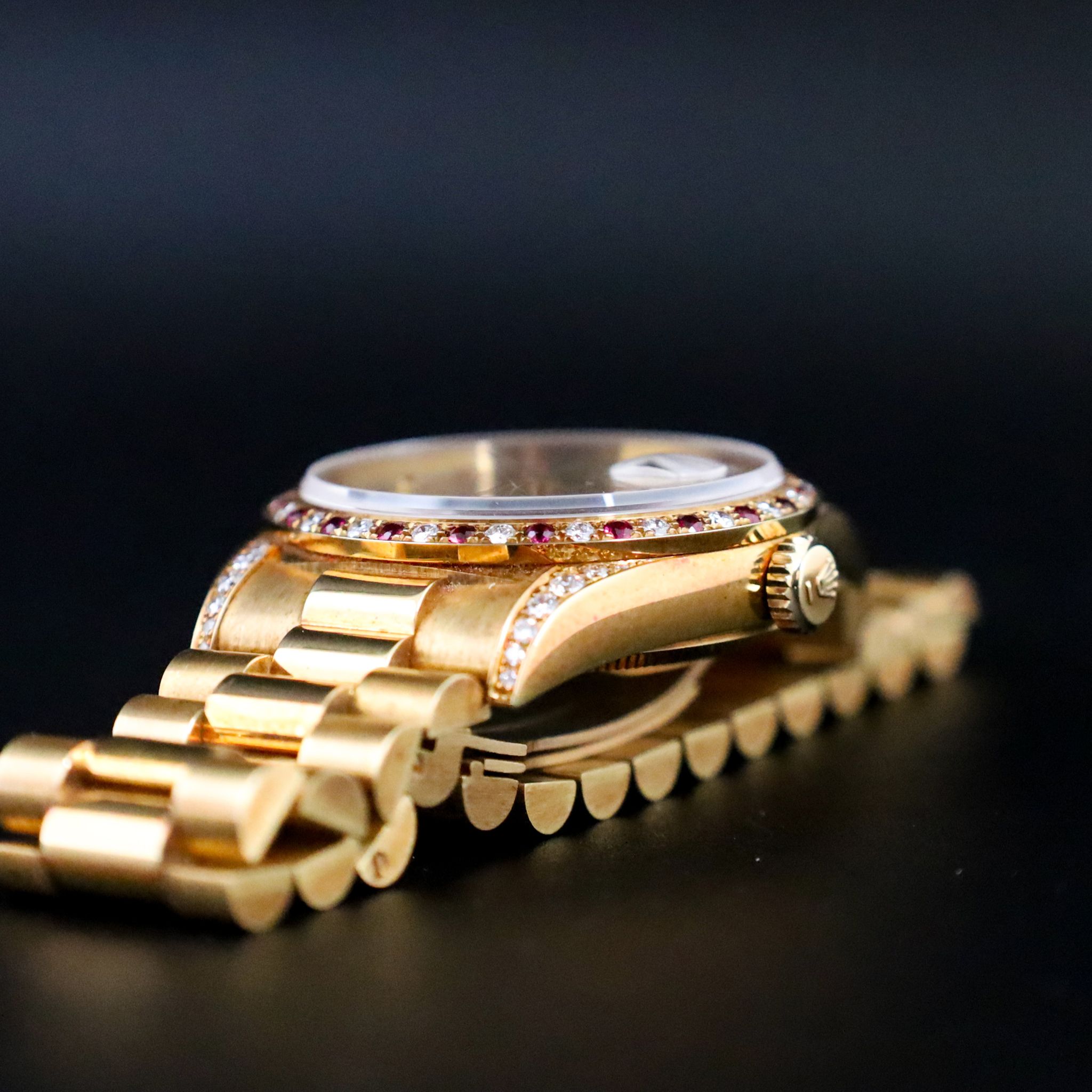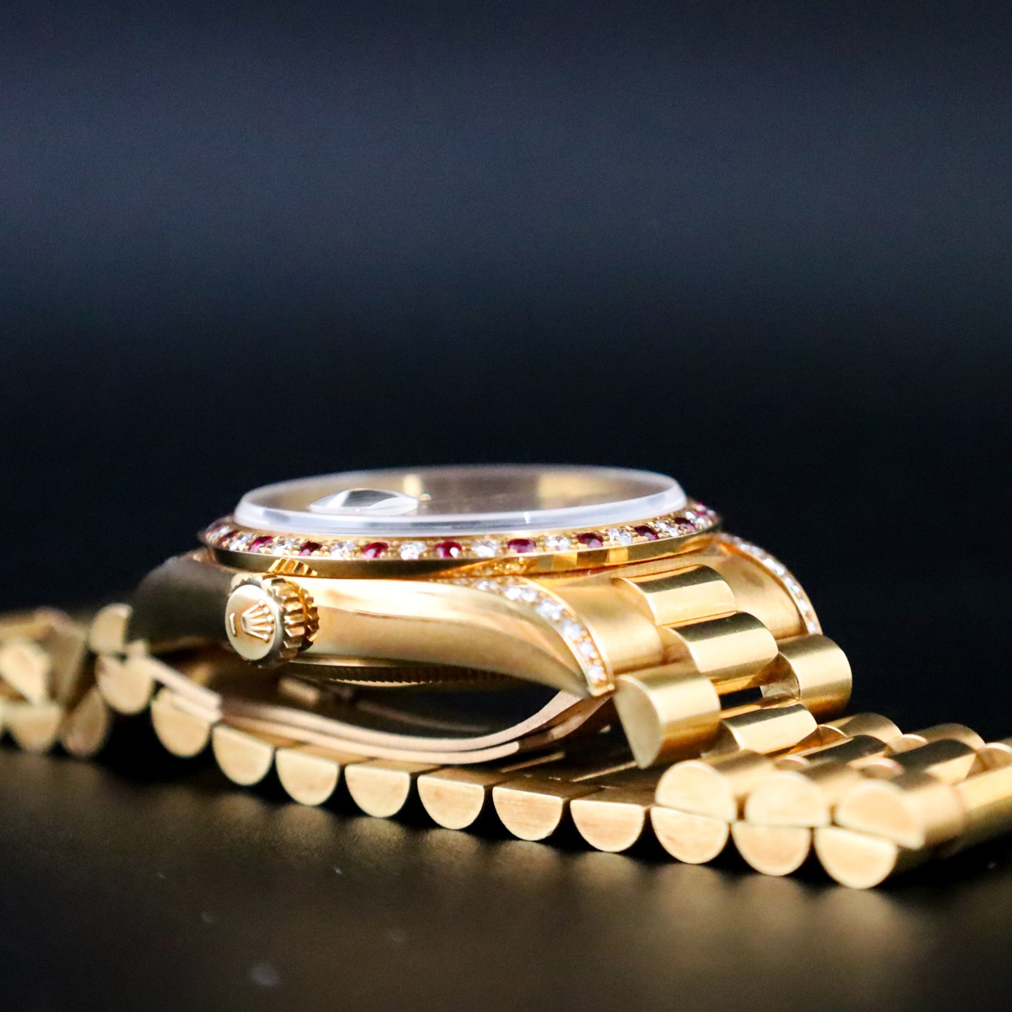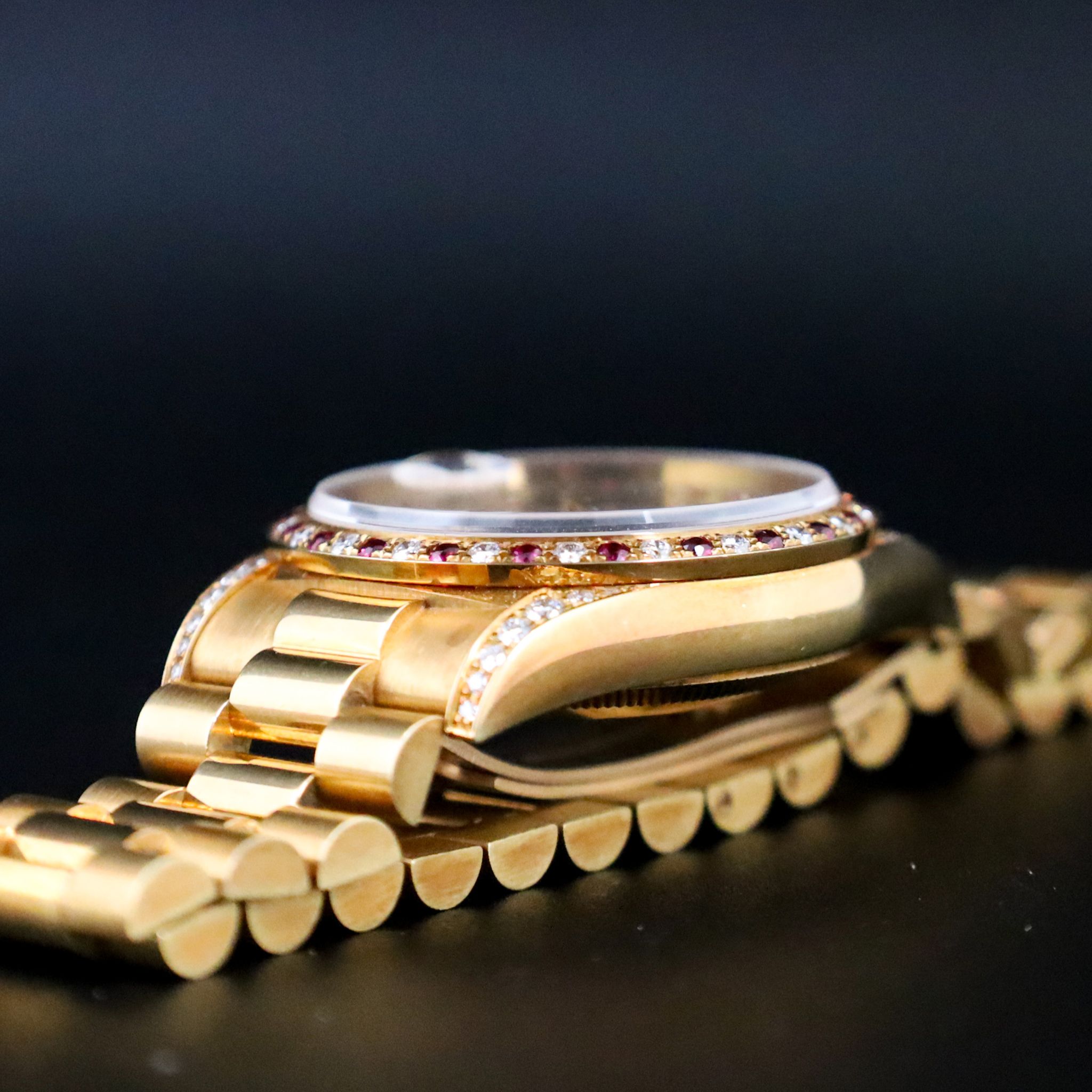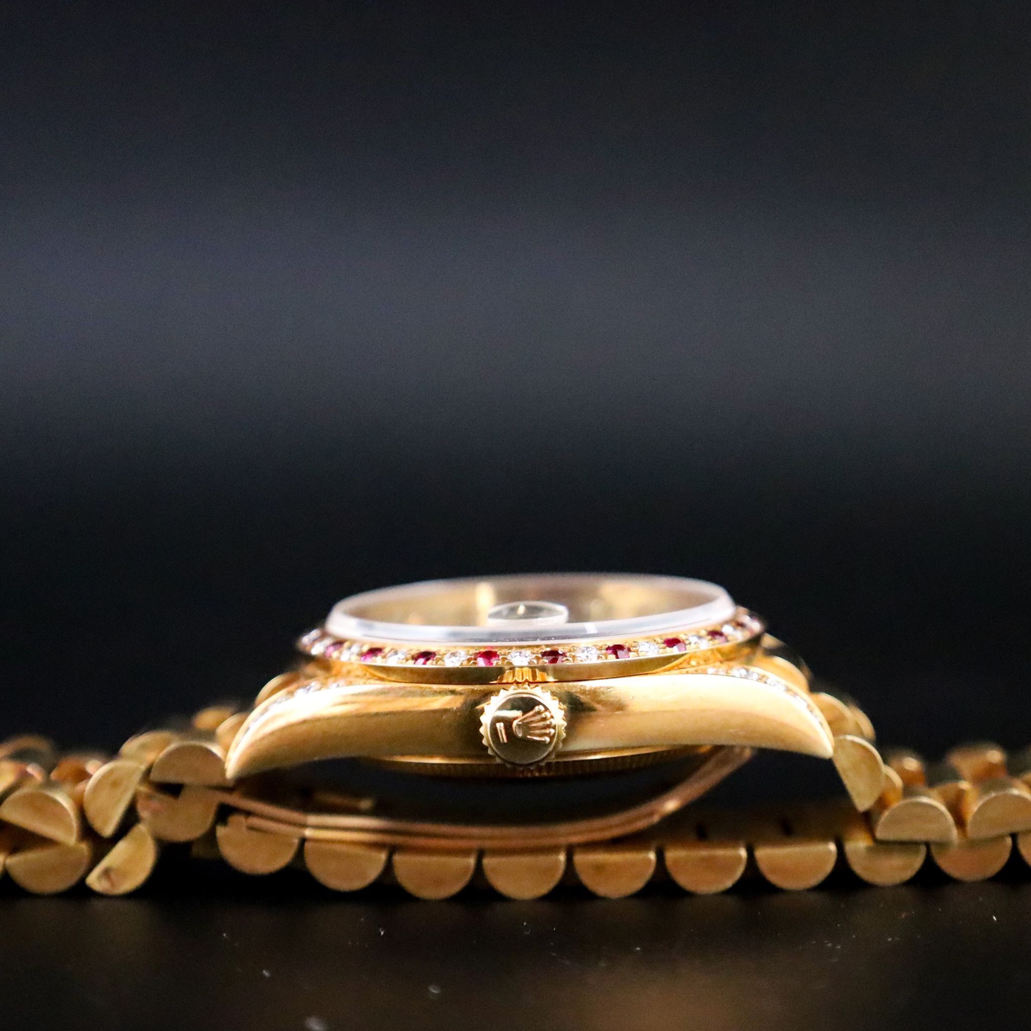 Condition: This piece comes in mint condition. It is unpolished, and the yellow gold is aging nicely. This watch is entirely factory, and is an extremely rare iteration of the 90's daydate. It is very rare to see this variation of this reference, and it I even rarer to see it in this condition with the case back sticker still on. The band is very tight indicating very minimal wear.