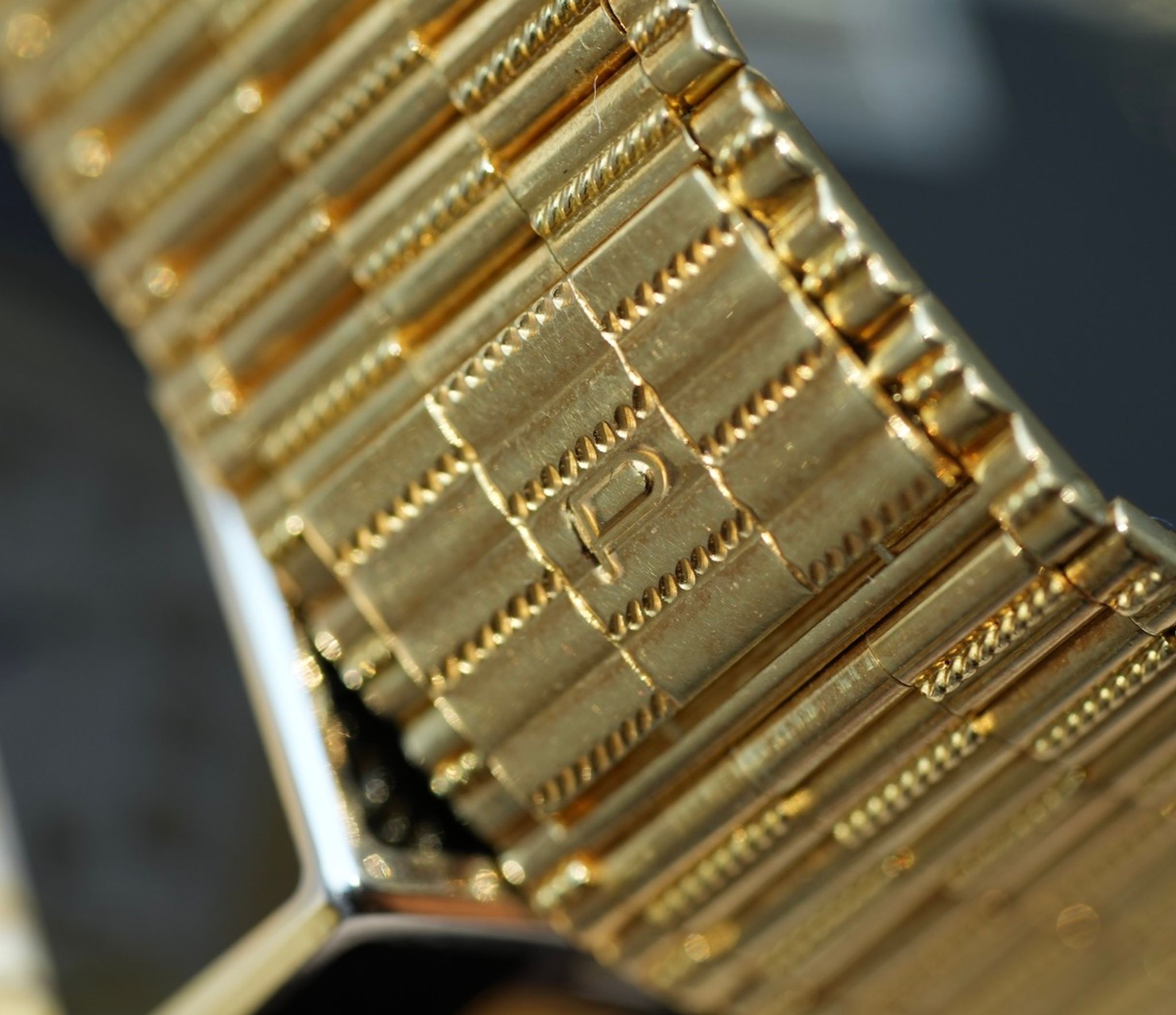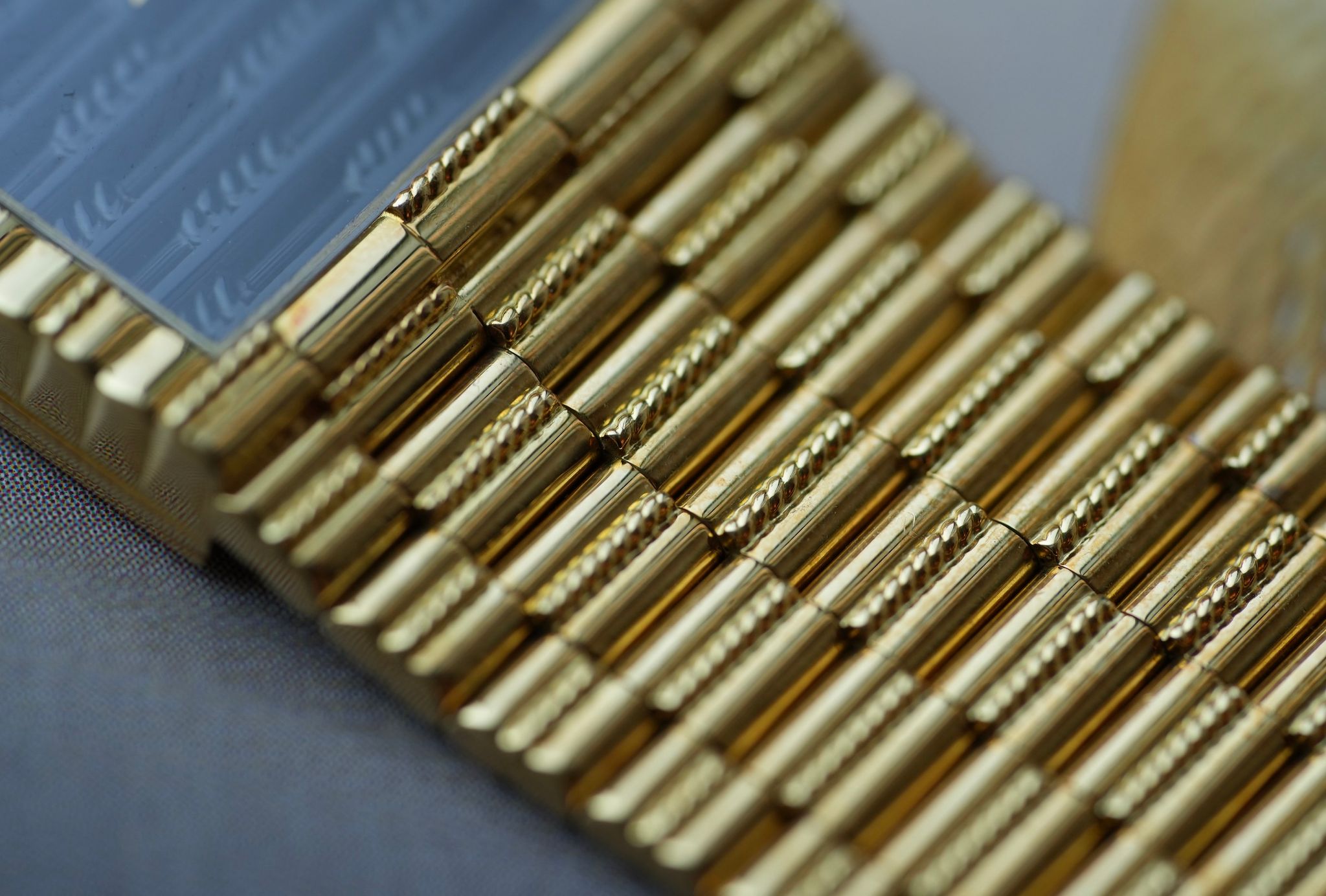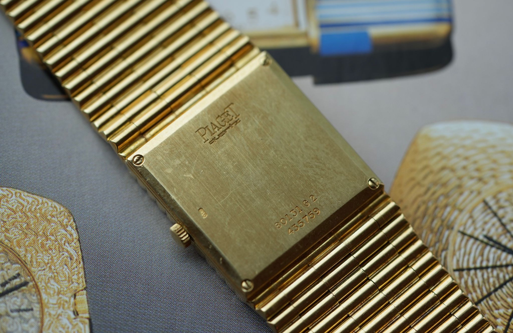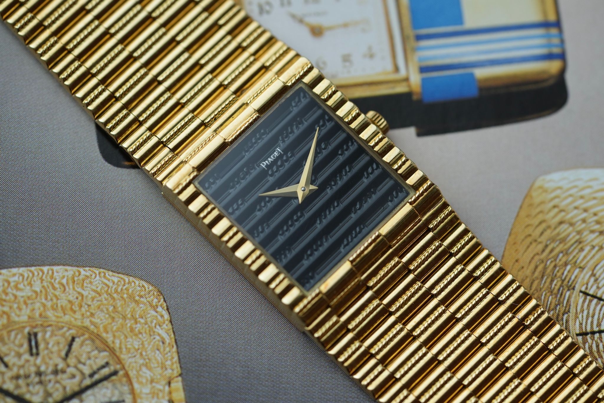 Here we have an unusual Piaget watch in solid 18k yellow gold. This watch features a unique rope pattern to the case and bracelet that adds a gorgeous level of complexity to the design. The rope pattern extends through the black dial which gives the watch further adding true continuity to the motif. The watch weighs a total of 108 g and has quite the wrist presence. The bracelet is long and will currently fit up to a 8 1/2 inch wrist. The bracelet is easily sized via push pins. It is powered by a quartz movement and is ready to be worn and enjoyed.