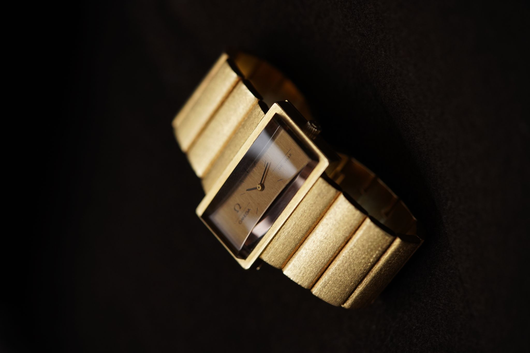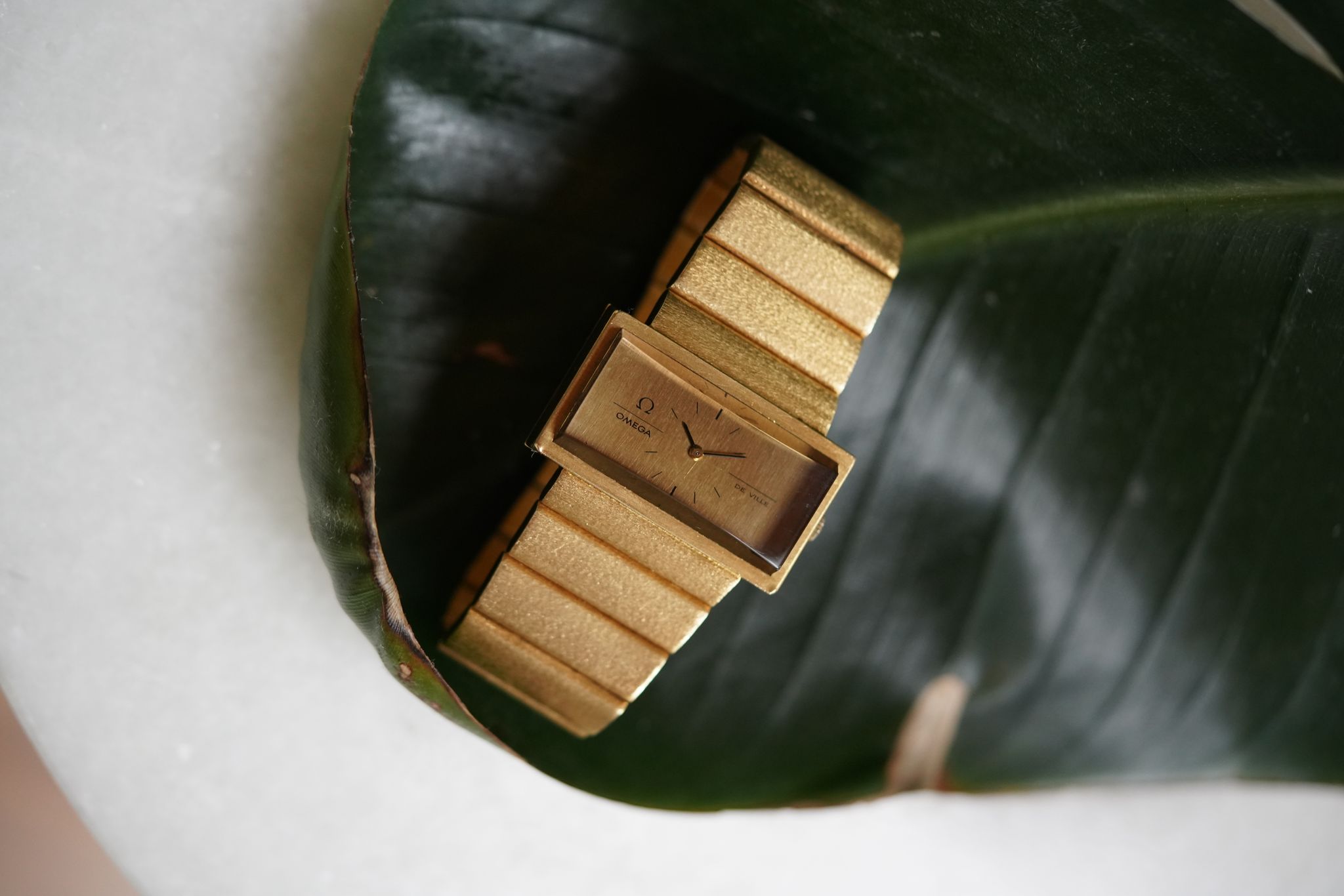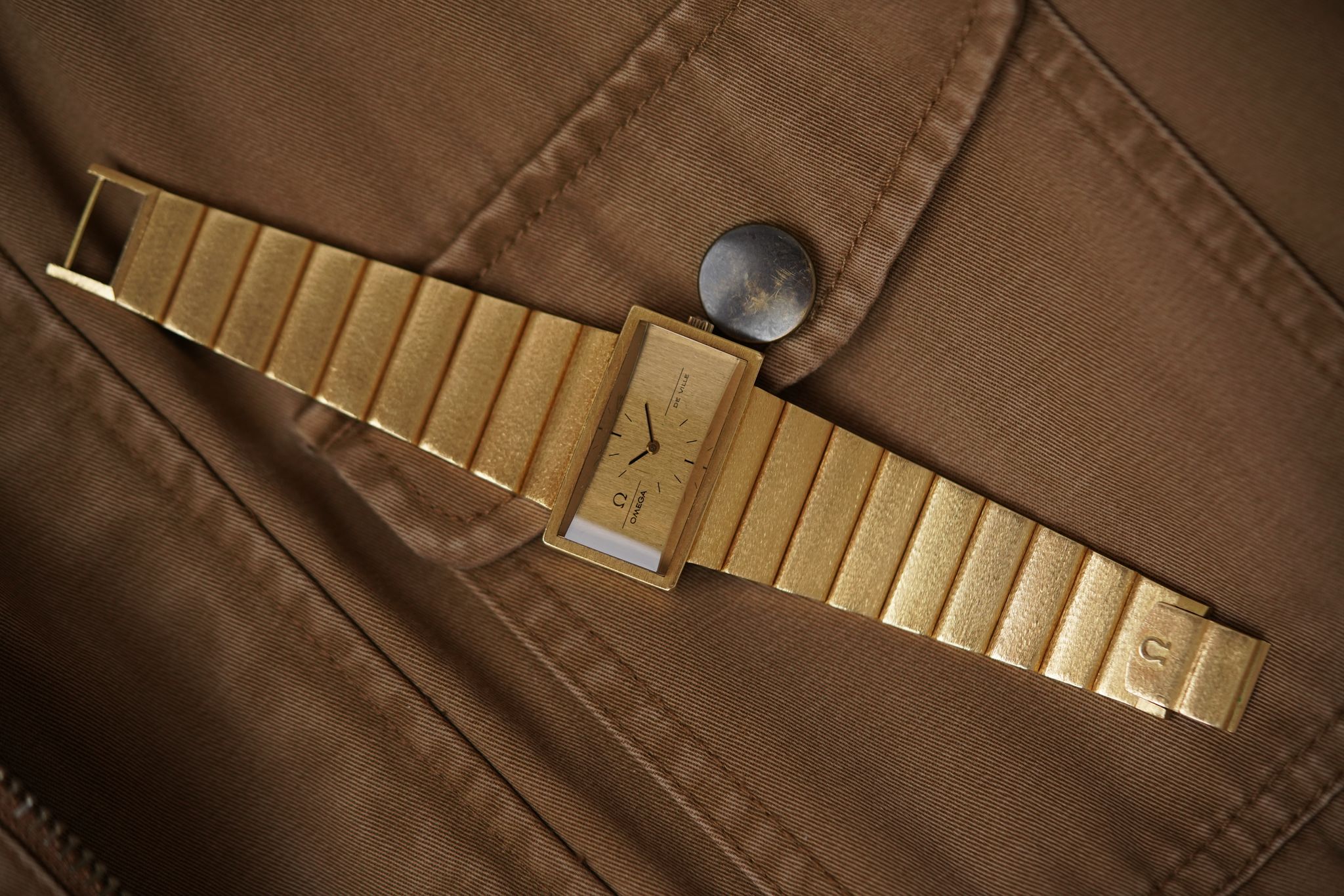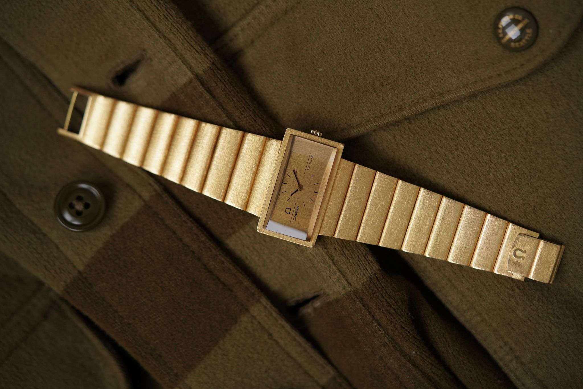A most impressive and opulent of designs: this heavy solid 18k yellow gold Omega is part of the Grima derivèe design family. However it retains some unique features such as a smoky quartz crystal and full gold case and bracelet construction.