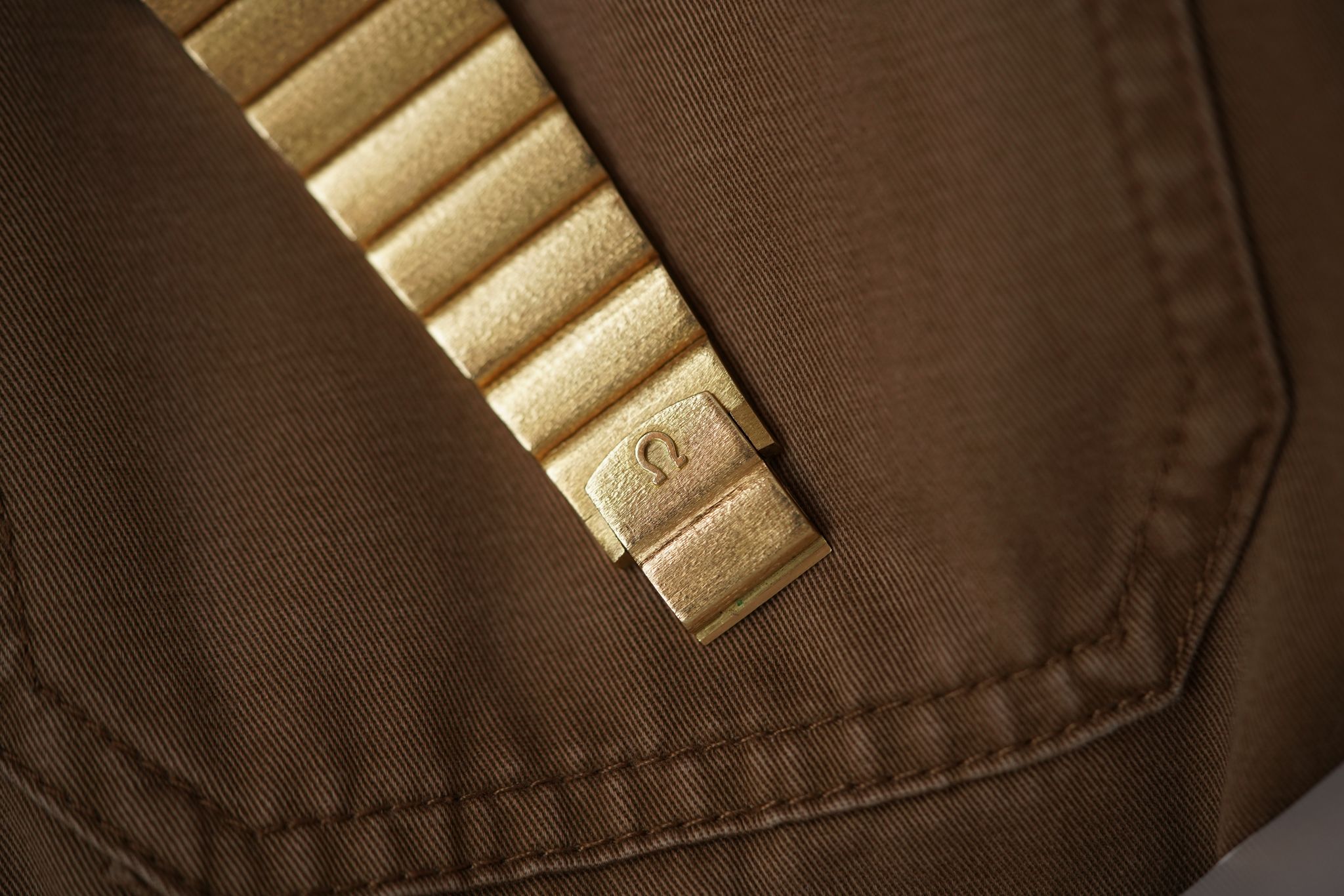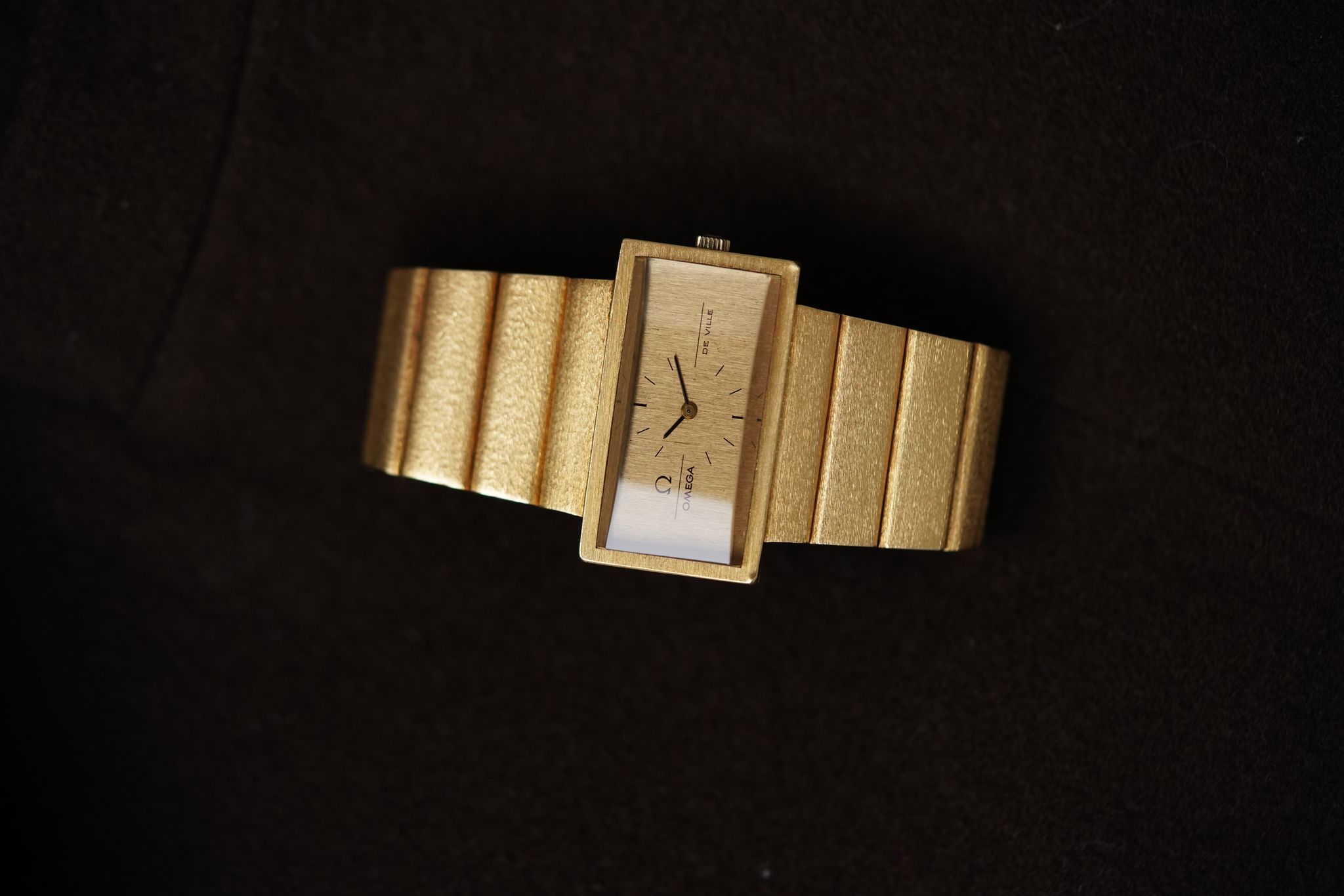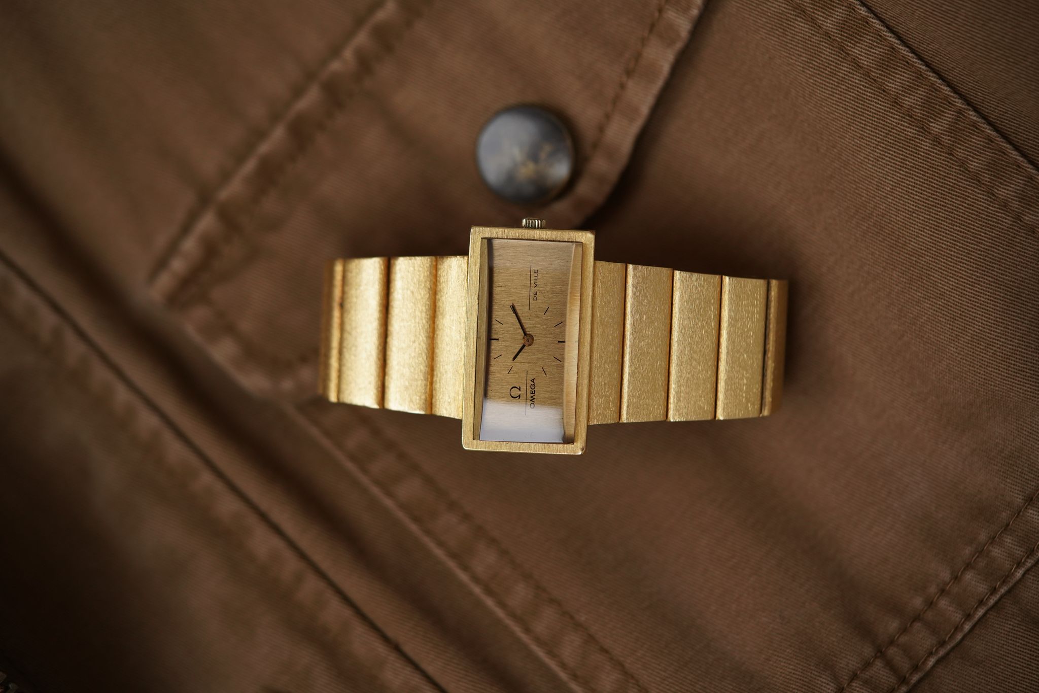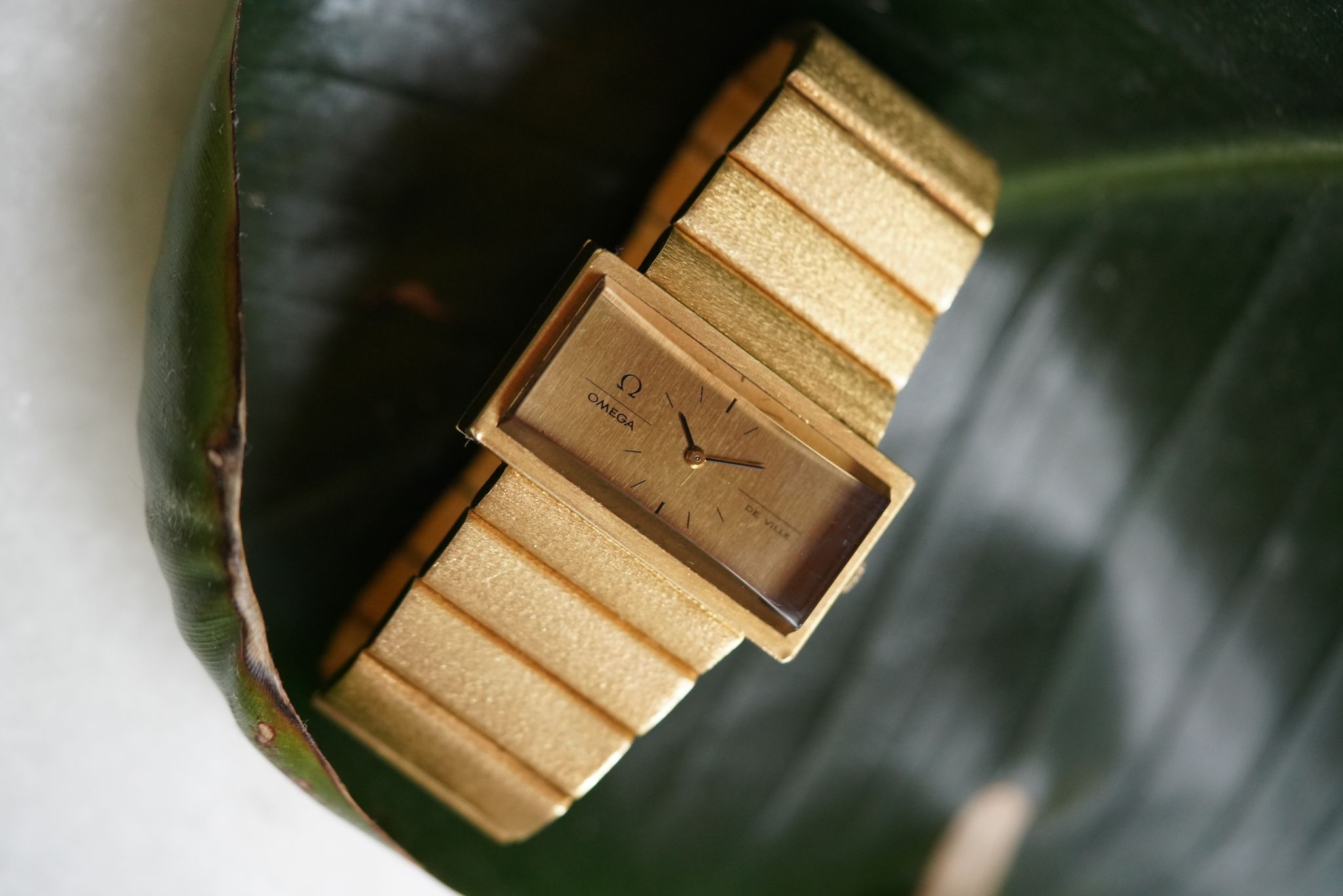 A most impressive and opulent of designs: this heavy solid 18k yellow gold Omega is part of the Grima derivèe design family. However it retains some unique features such as a smoky quartz crystal and full gold case and bracelet construction.
