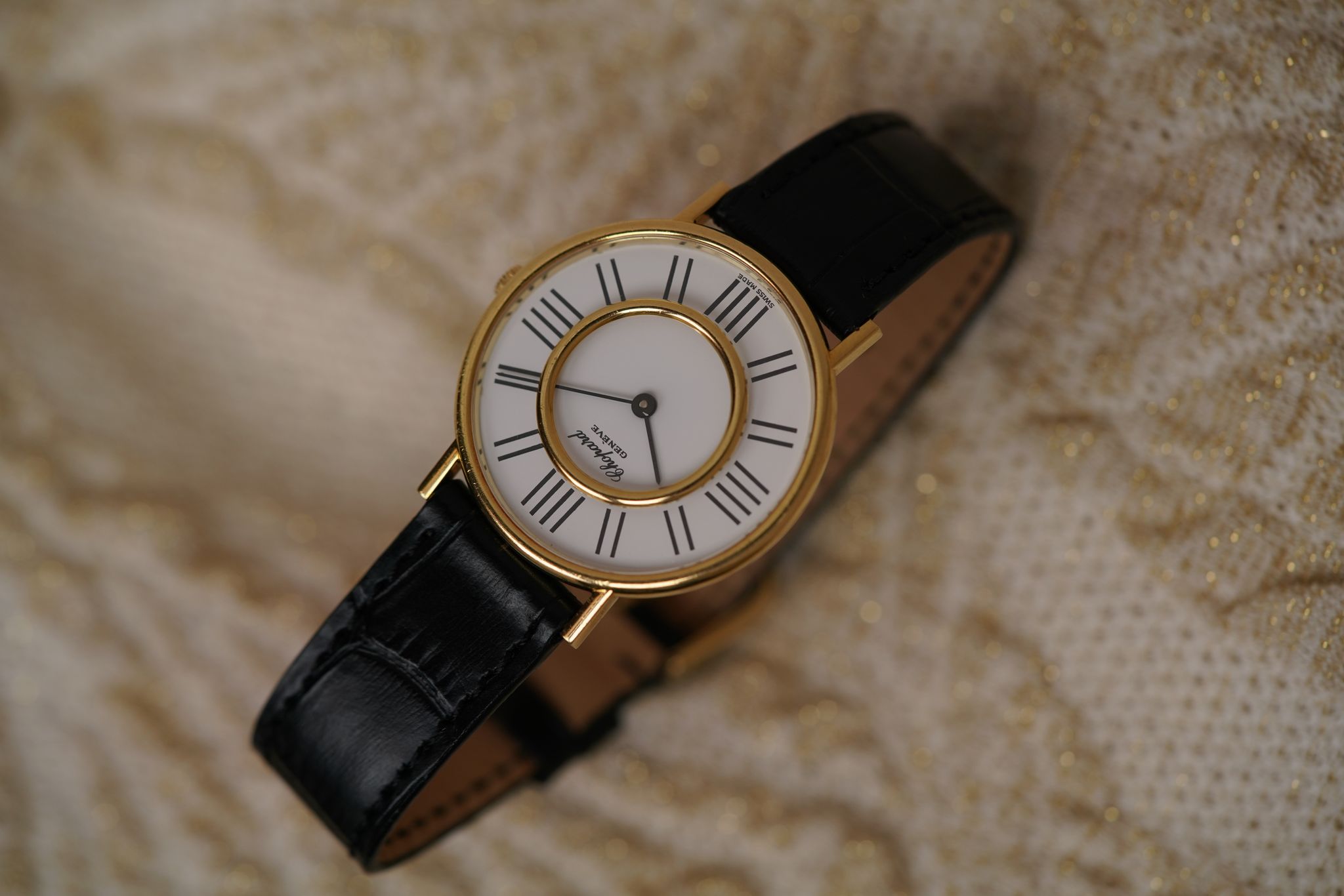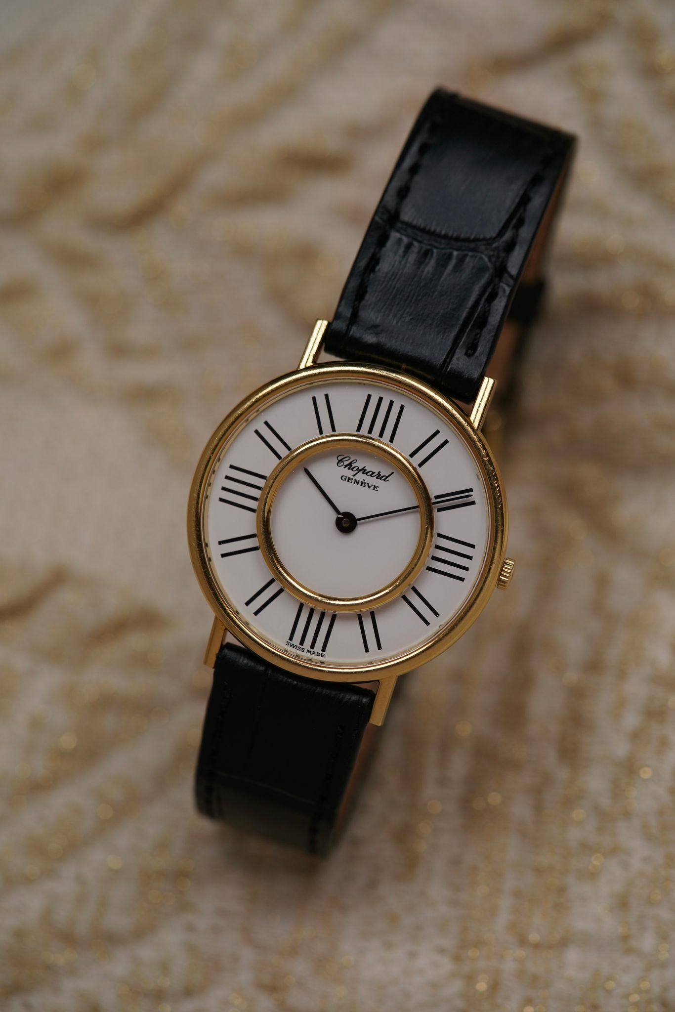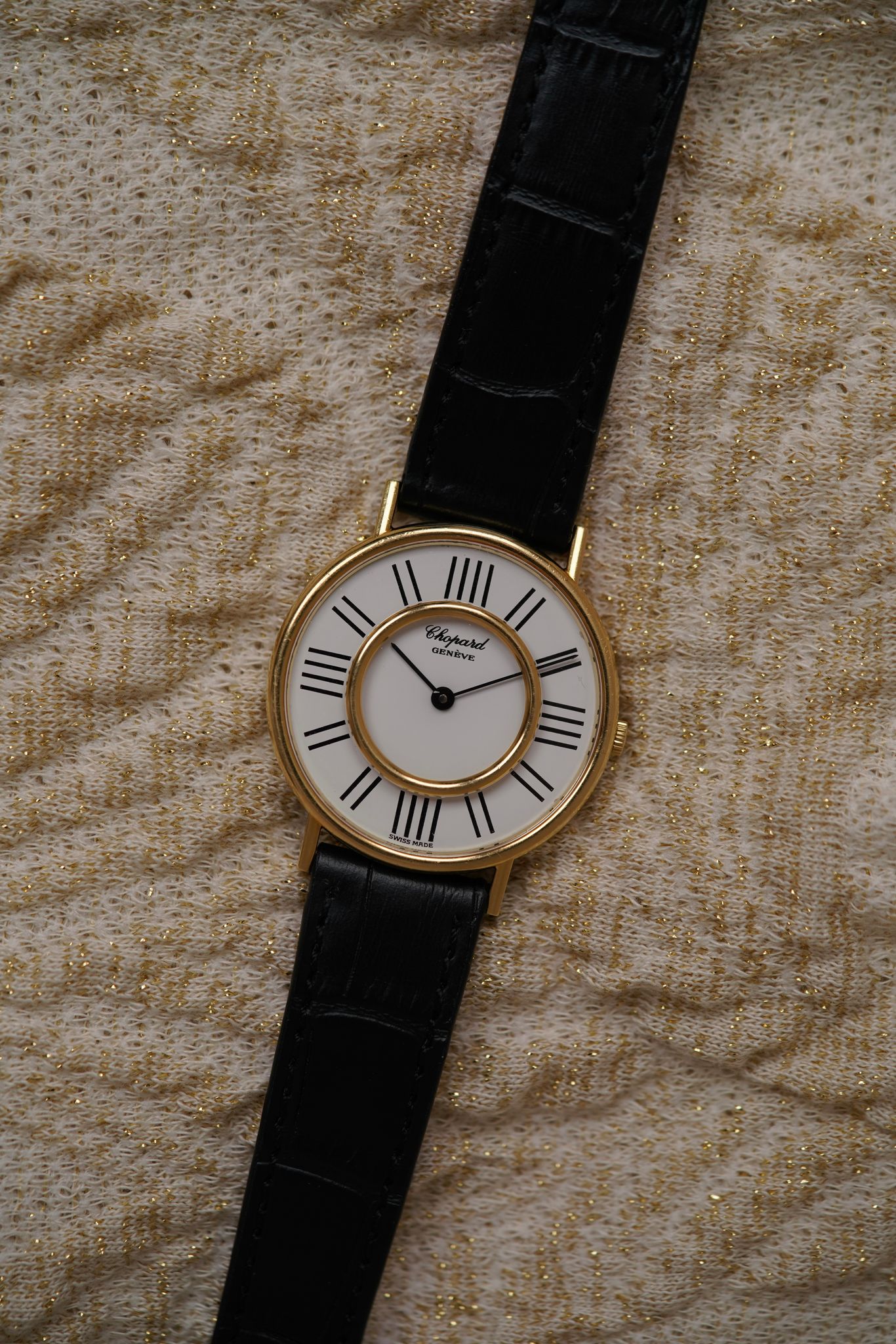 A large 18k yellow gold Chopard Genève dress watch — elegant and sculptural, with a dial that’s a study in symmetry. Elongated black markers radiate around a double-ringed bezel design, a rare “double glass” construction that frames time within time.
