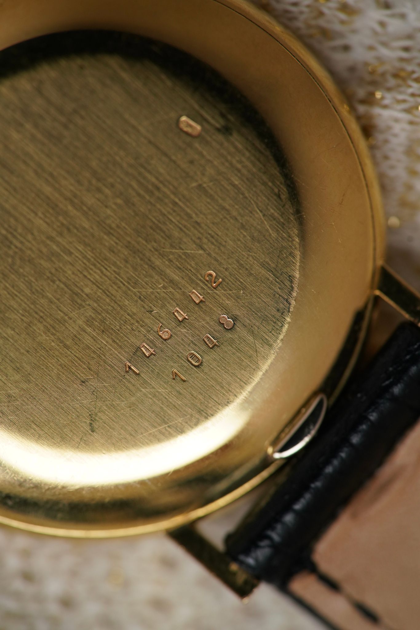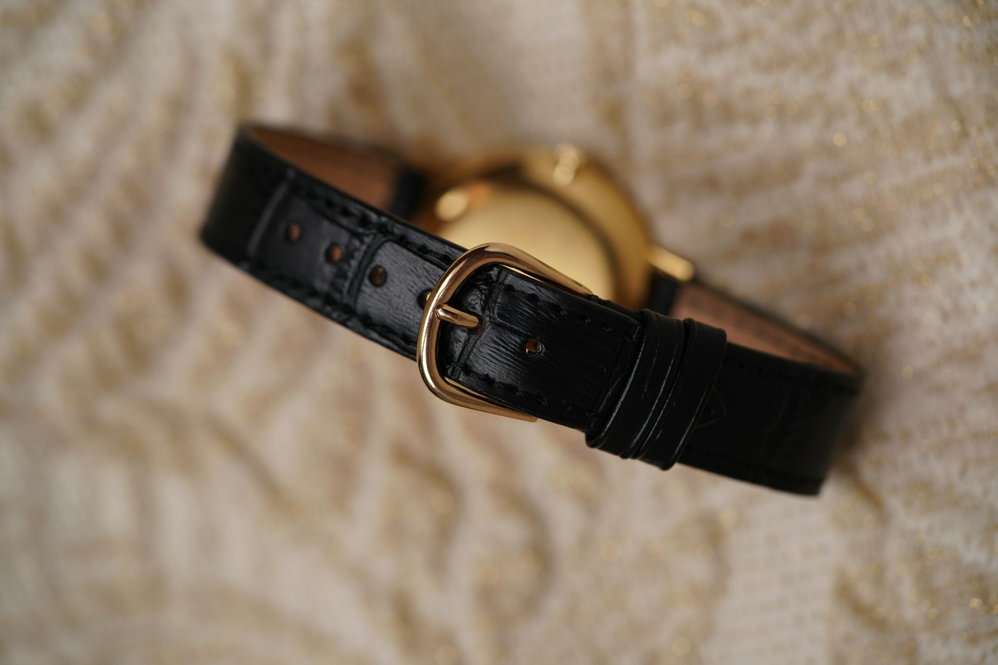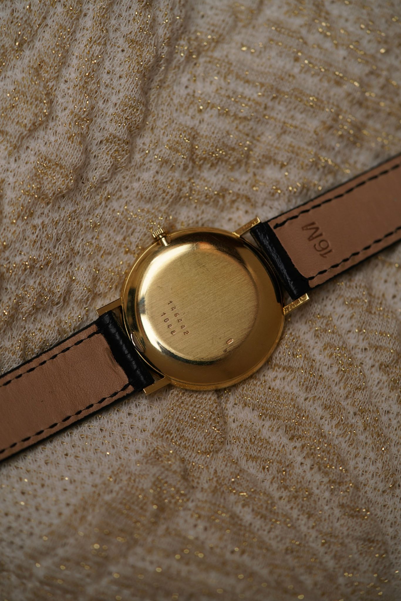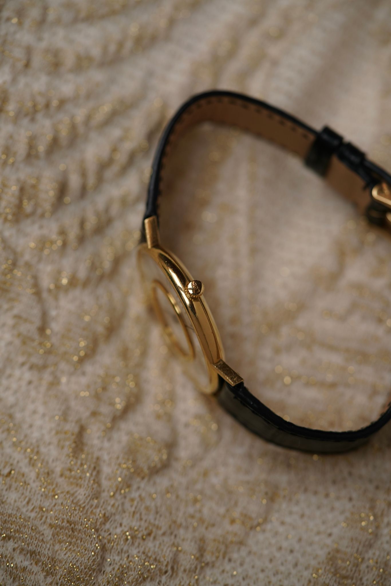 A large 18k yellow gold Chopard Genève dress watch — elegant and sculptural, with a dial that’s a study in symmetry. Elongated black markers radiate around a double-ringed bezel design, a rare “double glass” construction that frames time within time.
