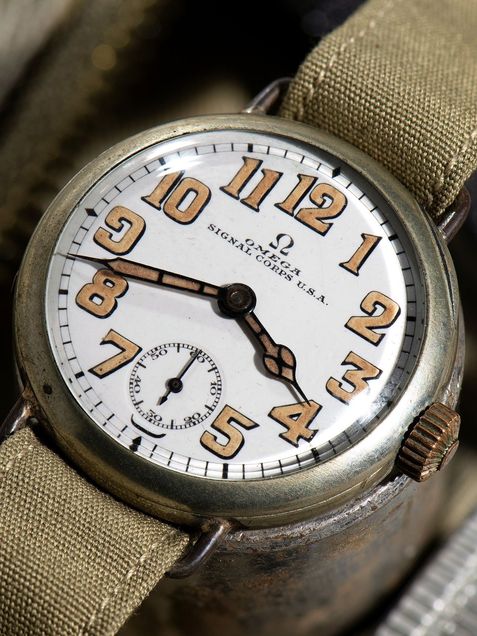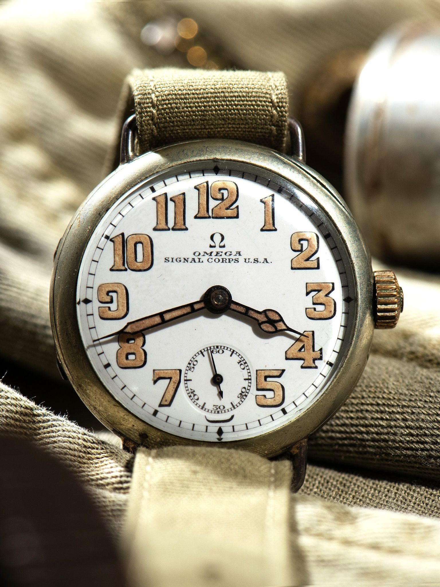 This Omega trench watch from 1916 is especially interesting, not only because of the aforementioned history but also because of a few extra words on the dial—Signal Corps USA. The Signal Corps was a specialized military group whose primary charge was to handle communications, which included operating switchboards, taking photographs, managing aviation, and even training the Army's first combat pilots. At the time, the US Army's Chief Signal Officer put out the call for a wristwatch designed specifically for the Signal Corps. Among the specs was that the "workmanship and material throughout shall be first class", that it should have a white enamel dial with white or blue Arabic numerals, and that there should be a wristlet included. Seven Swiss brands answered the CSO's call, including Zenith, Tissot, Cyma, Ulysse Nardin, Rode, Moser, and of course, Omega.