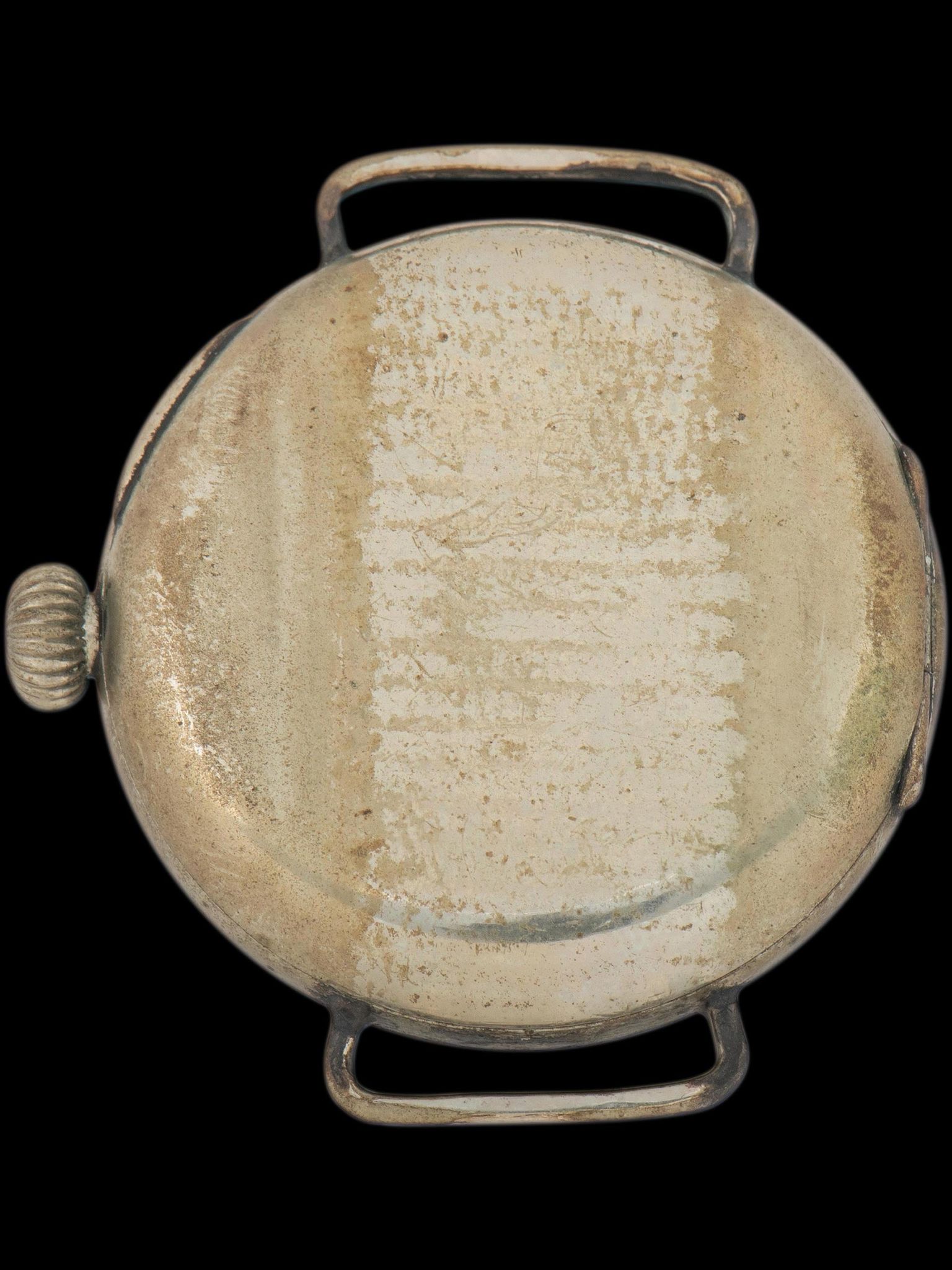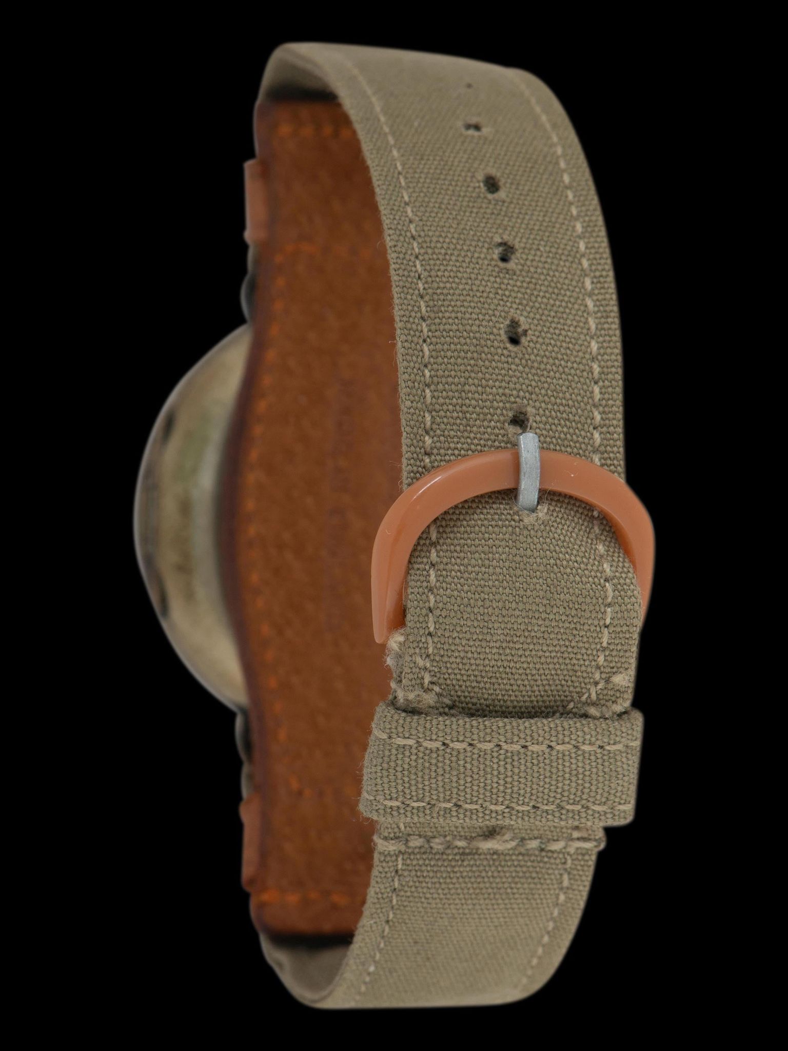The original oxidized nickel case with fixed strap bars is in exceptional condition, especially considering its age, with very few signs of age and honest wear throughout. The onion-style crown appears to be original to the watch. The watch comes supplied on a vintage canvas and pigskin bund-style strap featuring a brown bakelite buckle.