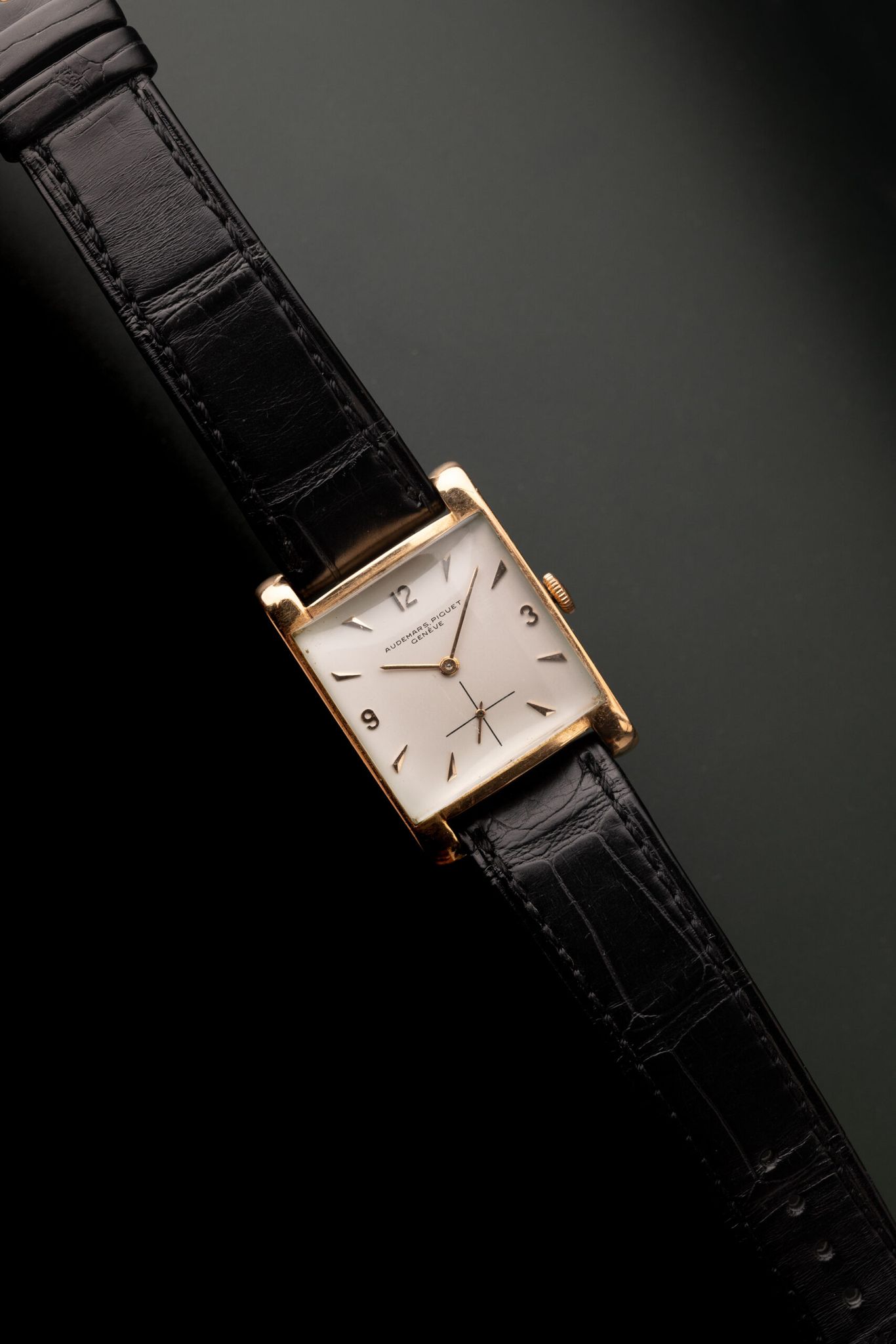 The Art Deco 1930’s AP Tank features a metal square dial in lacquered ivory mated to a rectangular 18k gold case, whose face features gold needle hands, raised golden 12 – 3 – 9 hours and polygonal dagger indices. Hoisted into the small frame is Audemars’ 18 jeweled movement, Caliber 9/10RS.