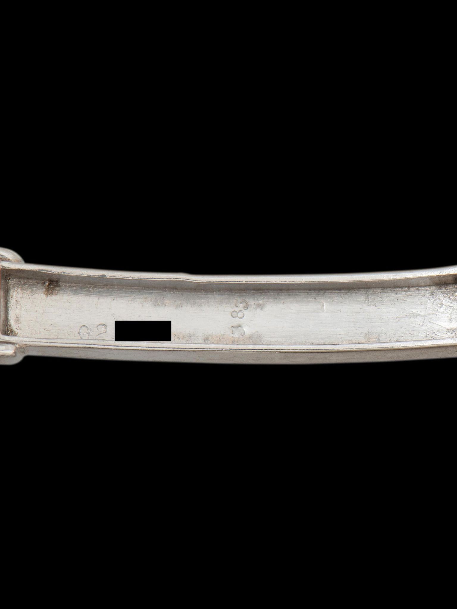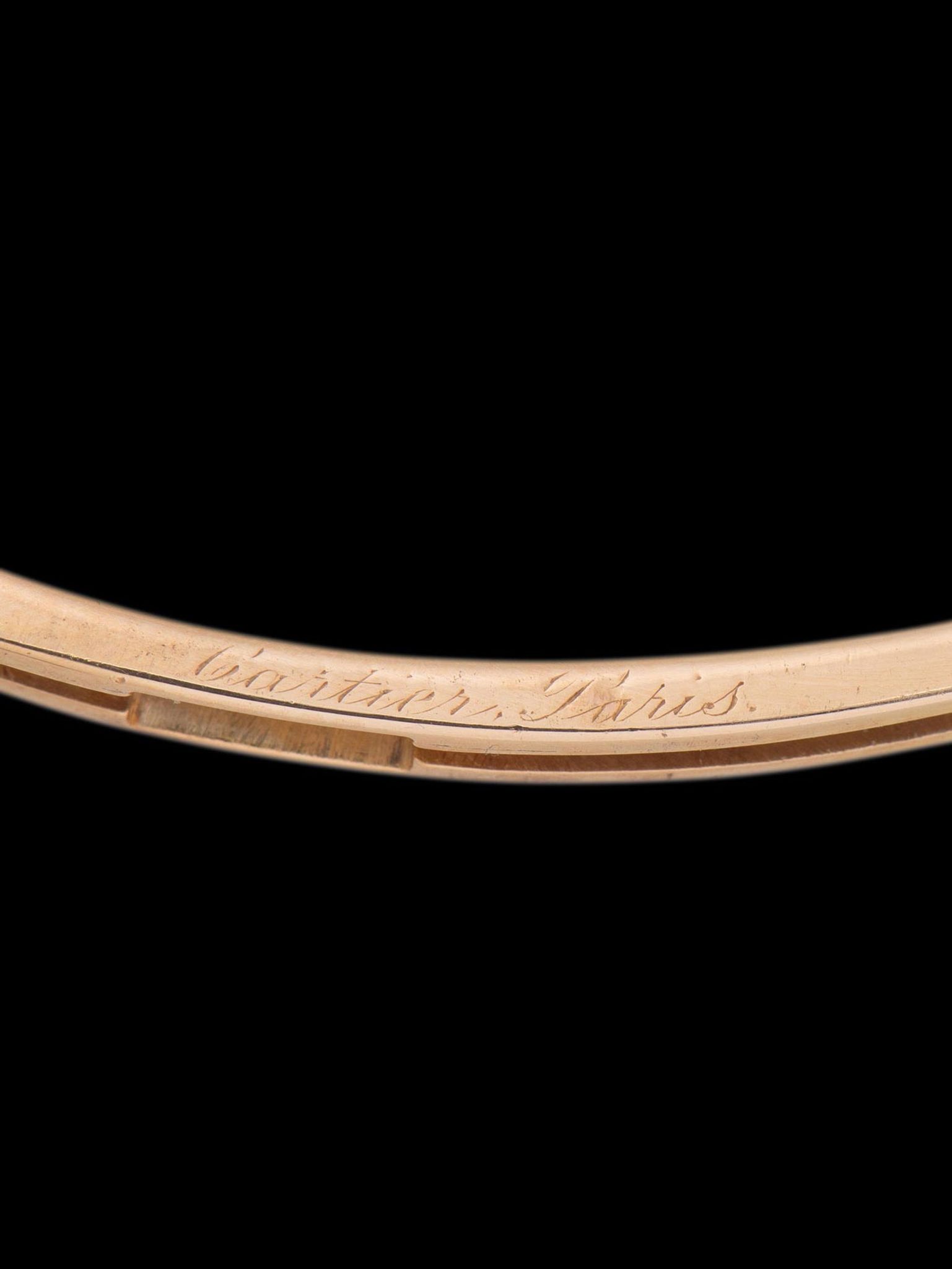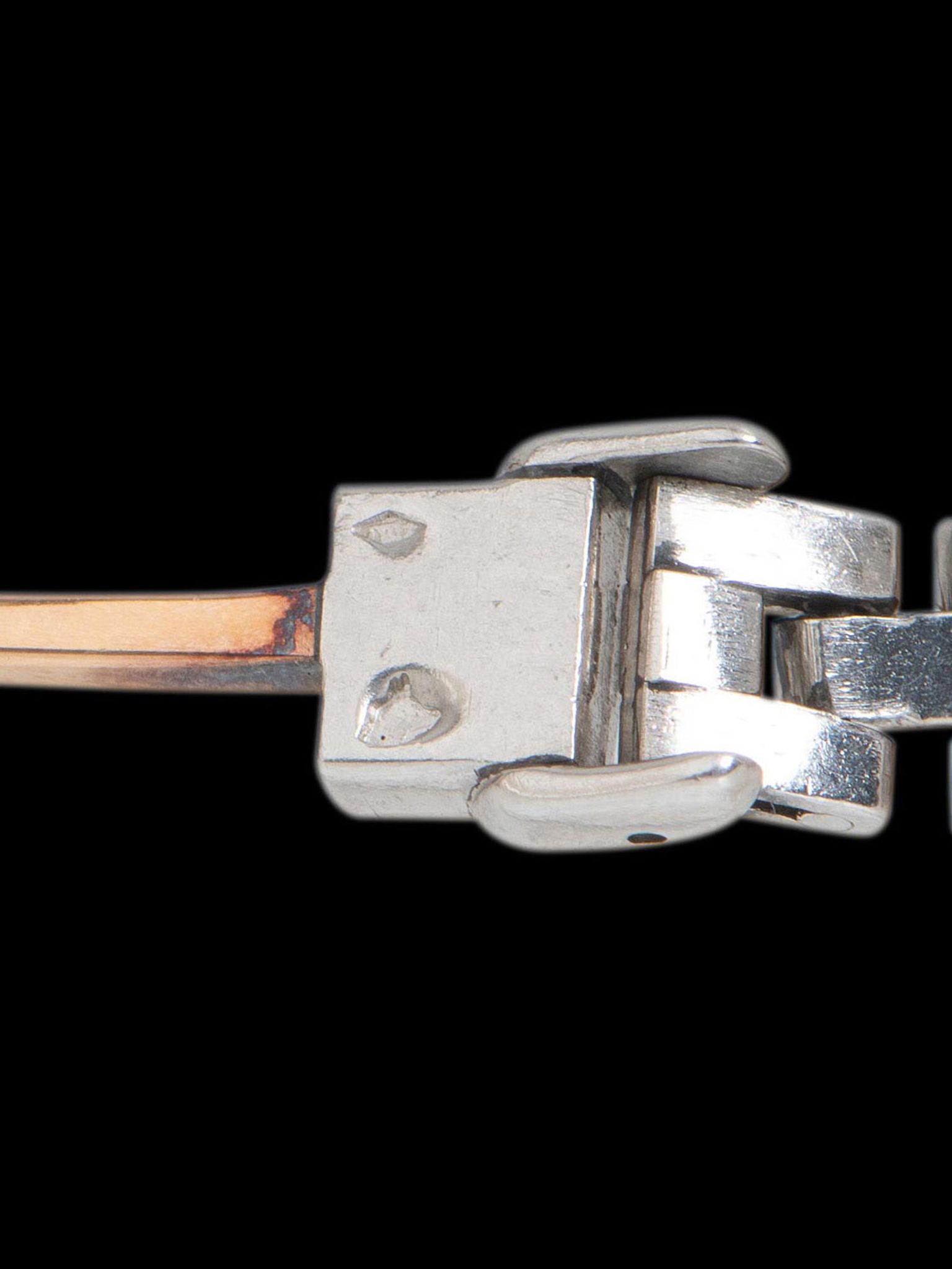 The miniature platinum case is in exceptional condition, especially for its age, displaying honest signs of gentle use. The back of the case retains its original serial number under the backwind crown. Continuing past the case is the integrated platinum bracelet which features the "Dog Head" French platinum hallmark on a set of links on each side of the bracelet. Inside the bracelet clasp features an independent serial and is hallmarked as well. The clasp blades are made of 18K rose gold, which was deliberately used because the copper content in rose gold gives the alloy a natural springiness, the blades are hallmarked accordingly for 18K rose gold and also signed "Cartier Paris". The watch will fit up to a 6 1/4-inch wrist.