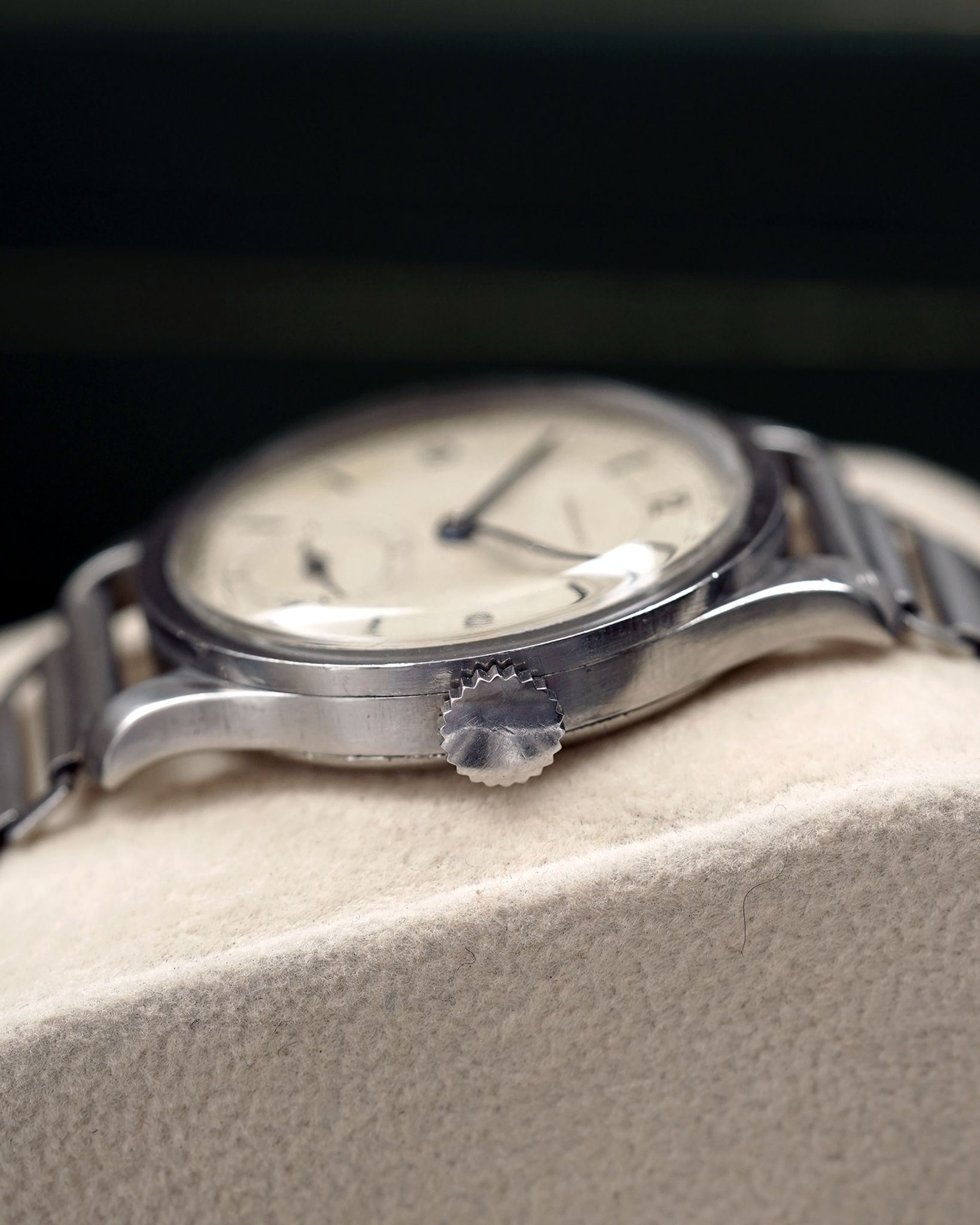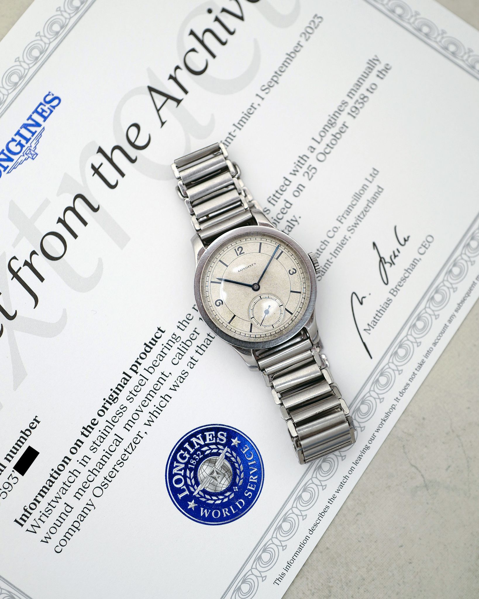 According to the Longines extract from the archives, the original serial number 5'593'xxx identifies a wristwatch in stainless steel bearing the reference 2326. It is fitted with a Longines manually wound mechanical movement, caliber 12.68Z. It was invoiced on 25 October 1938 to the company Ostersetzer, in Italy.