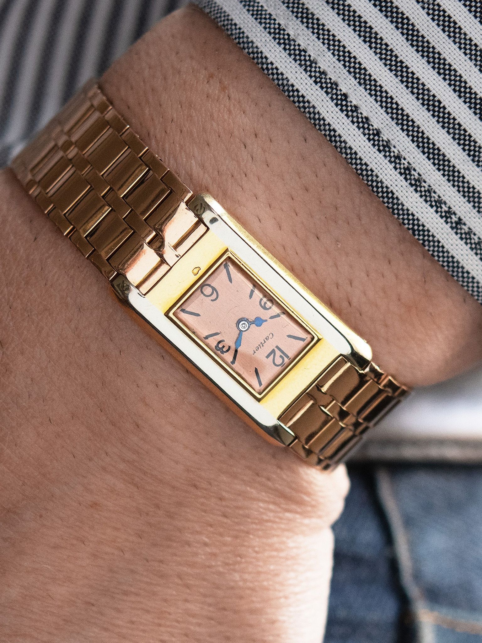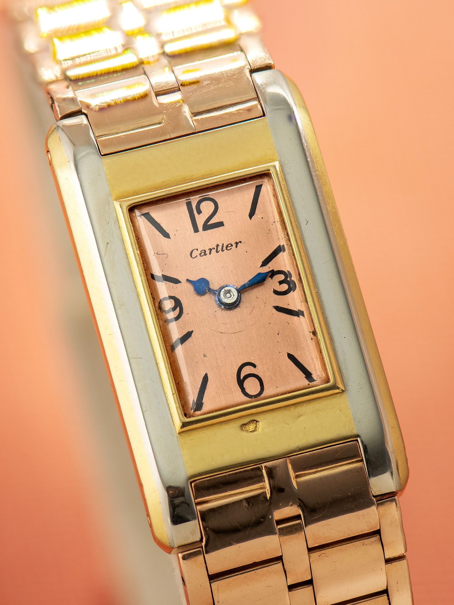This extravagant, unique, and beautiful Cartier Tank Allongée from the 1940s employs the iconic cal. 409 Duo-Plan movement, which accomplishes a very symmetrical aesthetic with the backwind design. More interestingly, however, is the construction of the case itself, consisting of a seamless 18K yellow gold and 18K white gold two-tone construction. Completing this tri-metal design is the 18K rose gold bracelet, which perfectly complements the bright salmon-colored dial.