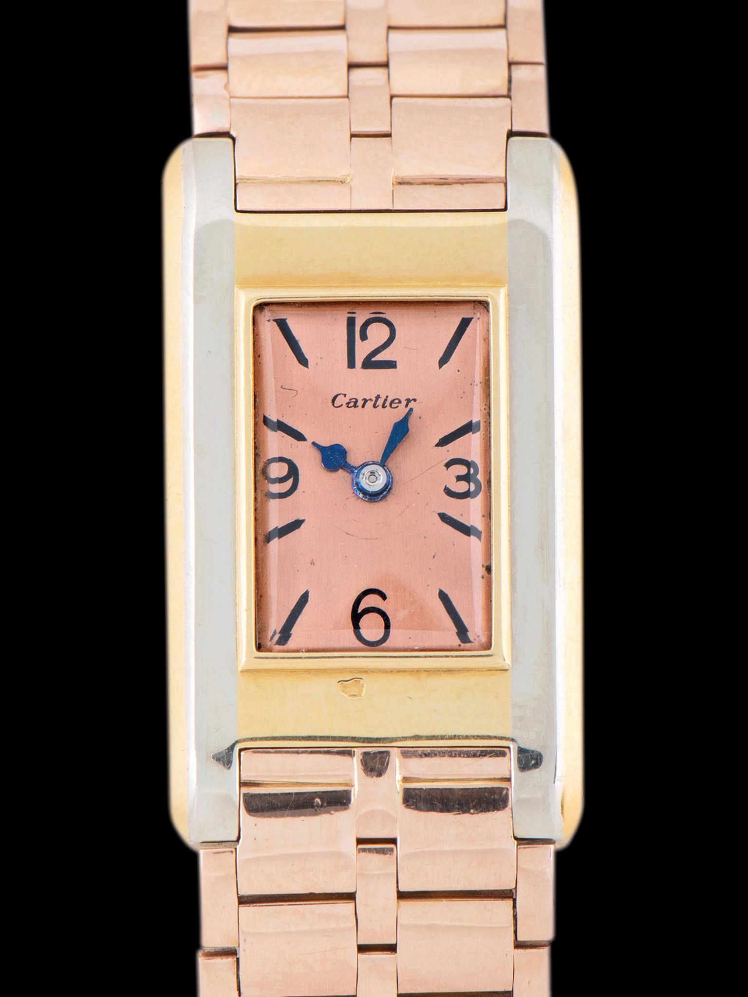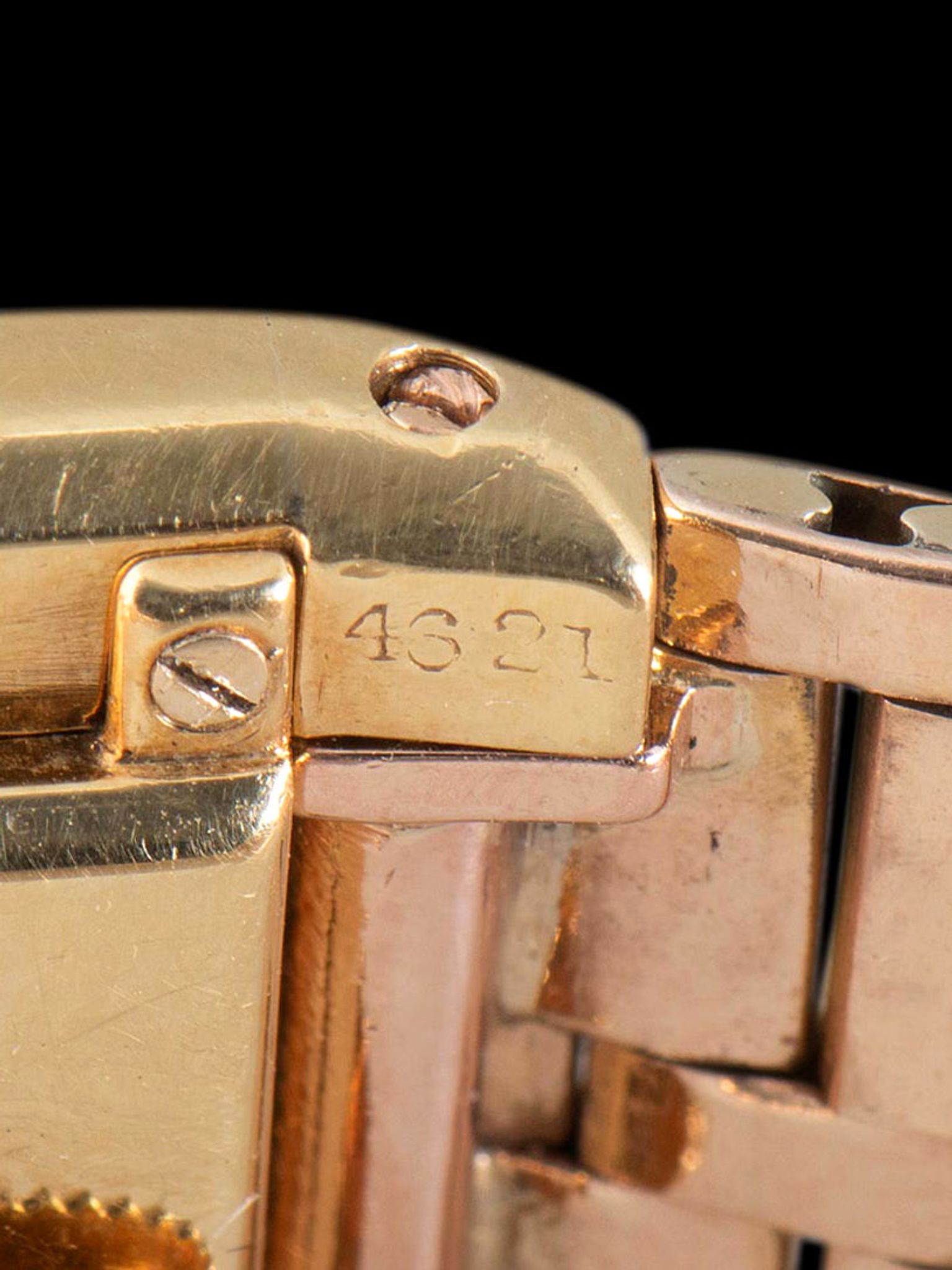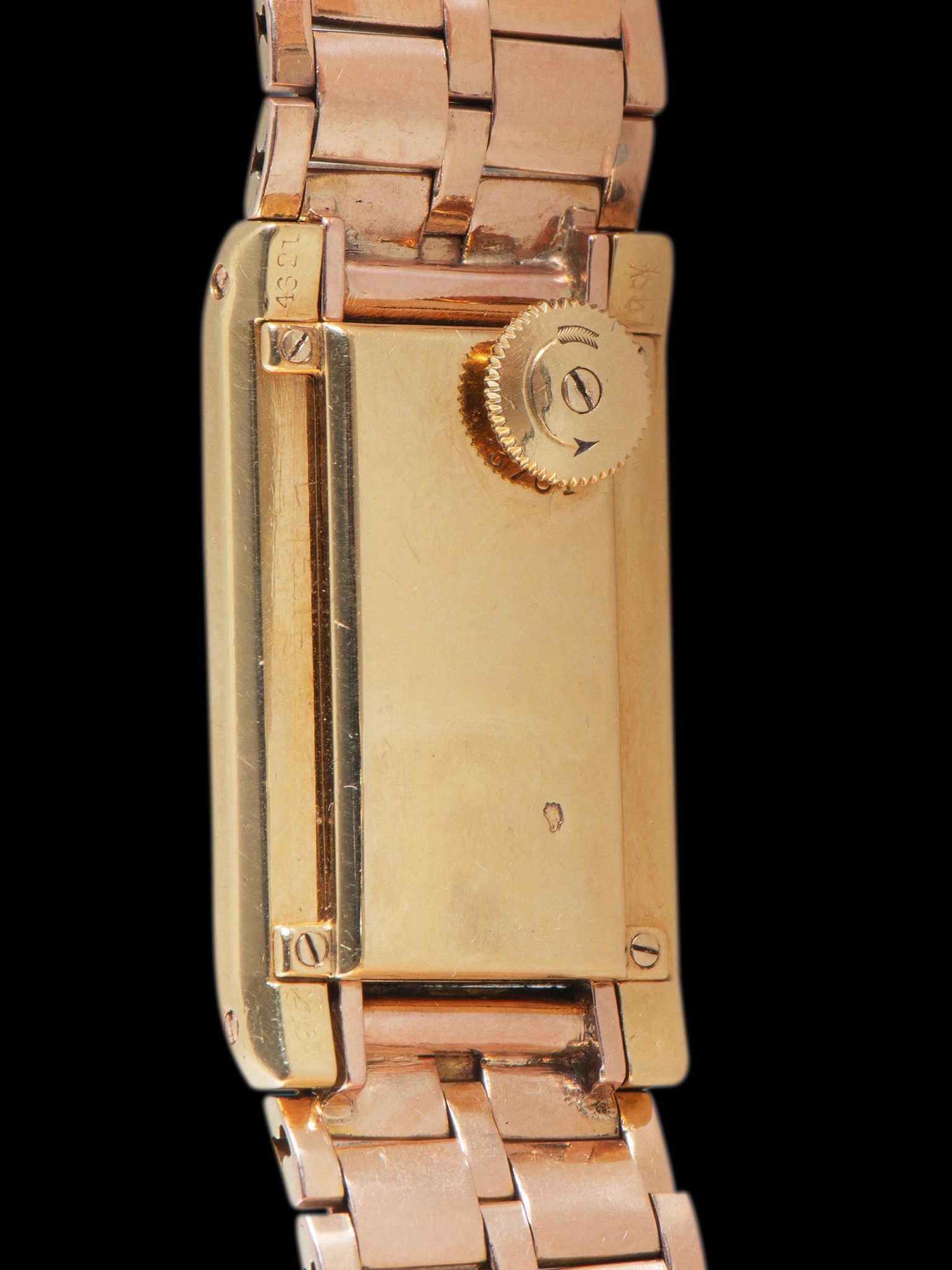 The impressive 18K yellow gold and 18K white gold construction is beautifully executed and remains extremely well-preserved, showing evidence of only very gentle polishing in the past and nominal signs of use. The hallmarks present on both the front and back of the case remain deep and fully present. The Cartier inventory number is located on the top right lug and remains present and legible, accompanied by two other hand engravings on the top left and bottom right lugs as well. The sloped-glass crystal is in great condition with minor marks from wear present. The 18K rose gold bracelet also features an 18K white gold deployant clasp, keeping with the multi-color tone theme of the watch. The bracelet was sourced with the watch and we believe it to either be original or custom made for the watch soon after it was originally purchased as it appears to be of Cartier make or closely resembling similar Cartier bracelets of the era, however, it does not feature Cartier stamps or hallmarks. The bracelet is currently sized to fit a 6 1/2-inch wrist.
