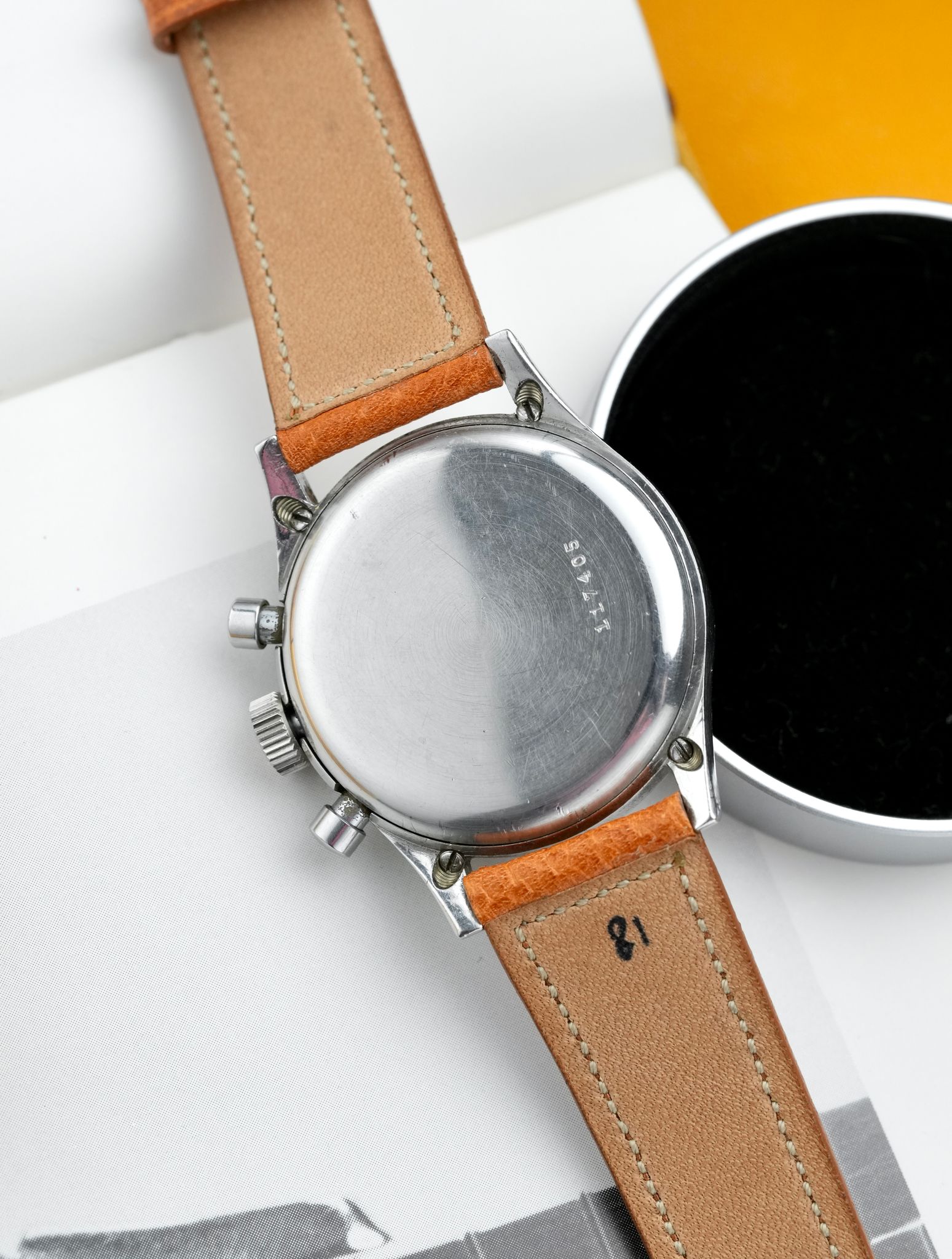 A sensational and extremely well preserved 1940s Gallet Multichron "Clamshell", the first waterproof chronograph, with a beautiful patinated silver multi-scale dial featuring snail telemetry scale and outer tachometer scale, and a broad unpolished and patented two piece 34.5mm screwback case, the feature that yielded this watch its nickname, powered by a manually wound Venus caliber, running well and keeping accurate time.