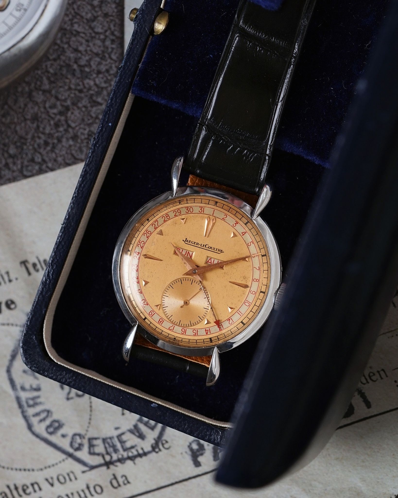This Jaeger-LeCoultre is one of those watches that perfectly captures the quiet confidence of 1940s design. At a glance, it’s refined and understated, but spend a moment with it, and the details begin to unfold. The 36 mm case sits right in that sweet spot between elegance and wearability, its proportions elevated by the unmistakable teardrop lugs that catch the light like sculpted ribbons of metal. Beneath the domed crystal lies a beautifully balanced dial, with twin apertures for day and month, a peripheral date track marked in red, and a needle-thin central hand tracing each passing day.