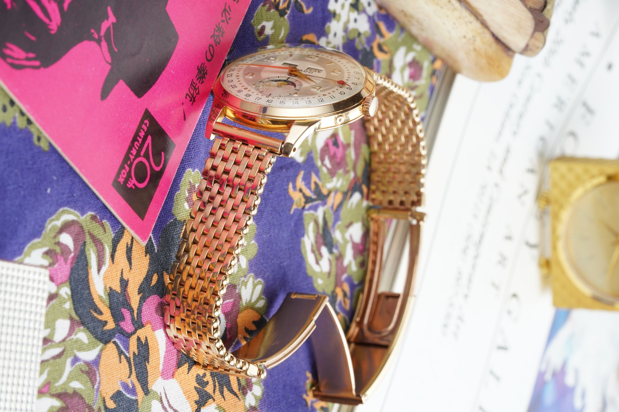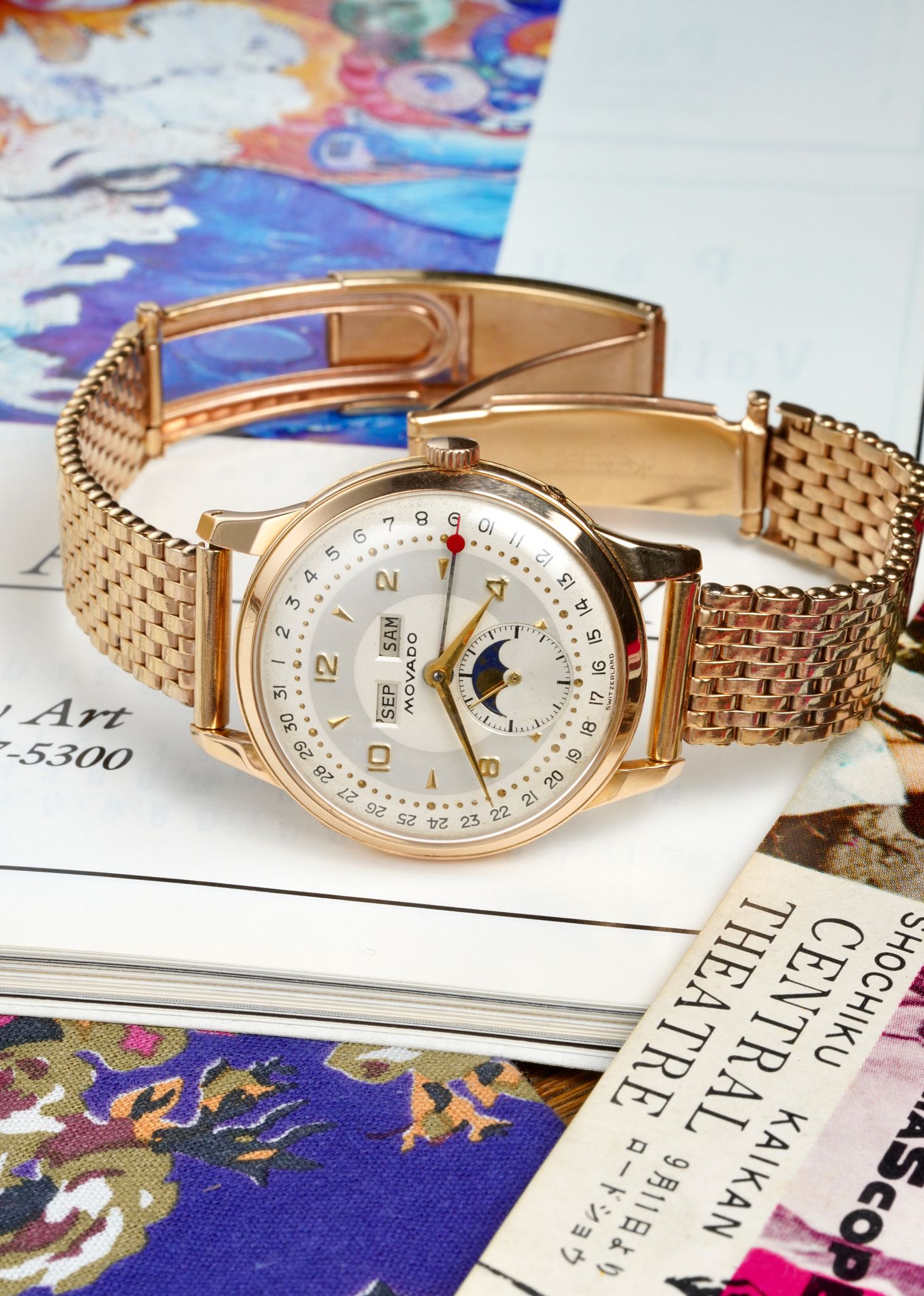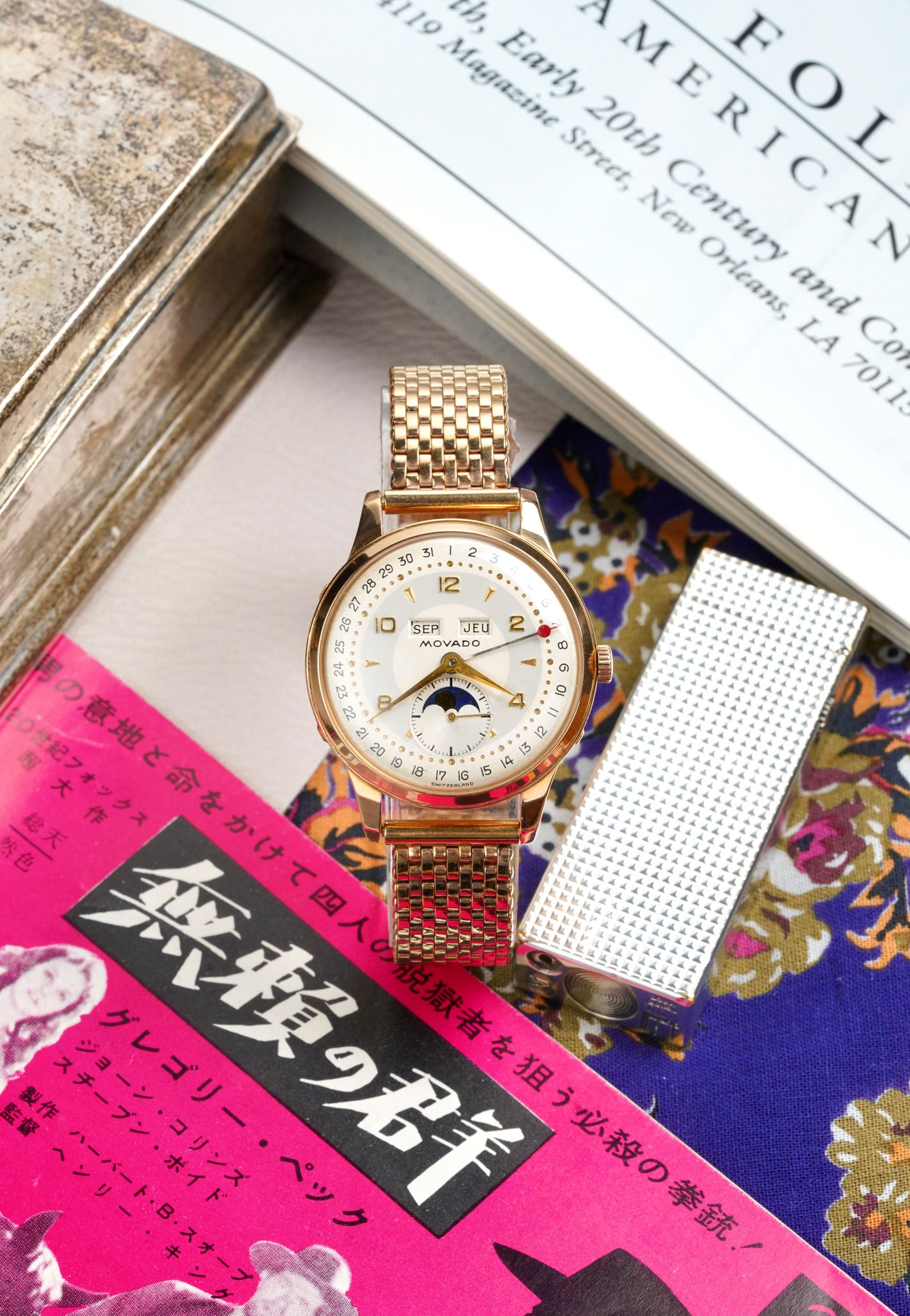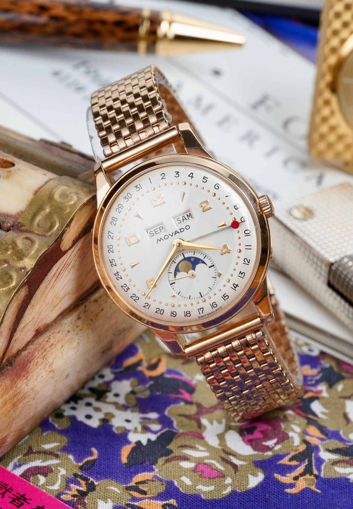 A stunning 1940’s Movado Celestograf in 18K rose gold with an absolutely pristine dial under a domed acrylic crystal paired with a NOS 1940s Kreisler rose gold filled beads of rice bracelet.