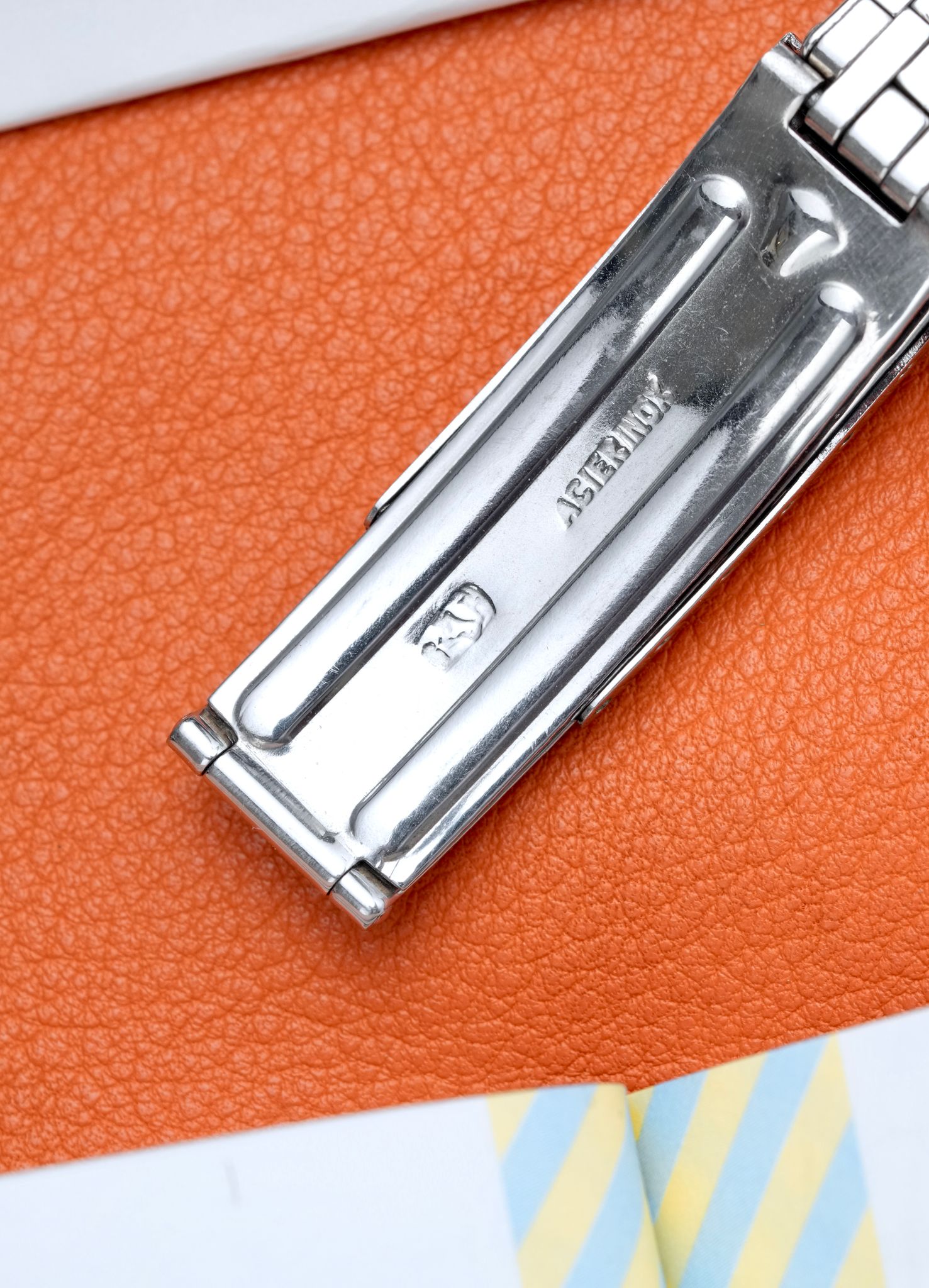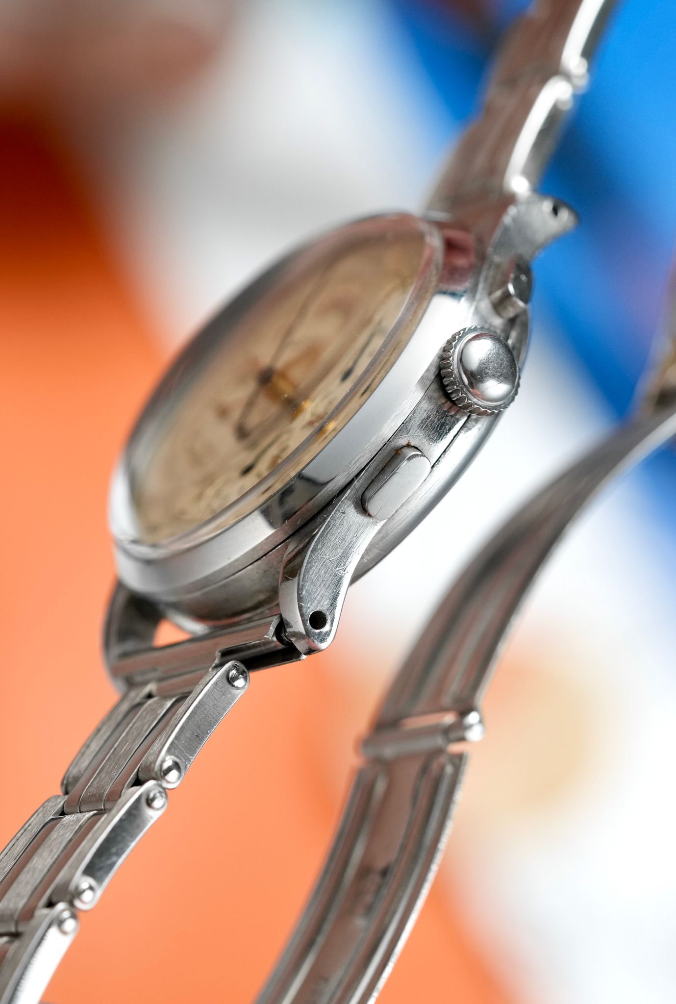 This dials is 100% correct, never having been refinished or altered. The steel example remains unpolished and wears larger than its case size suggests due to its mushroom crown and square pushers.