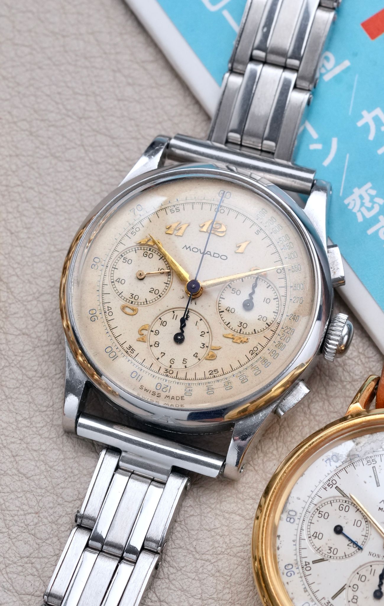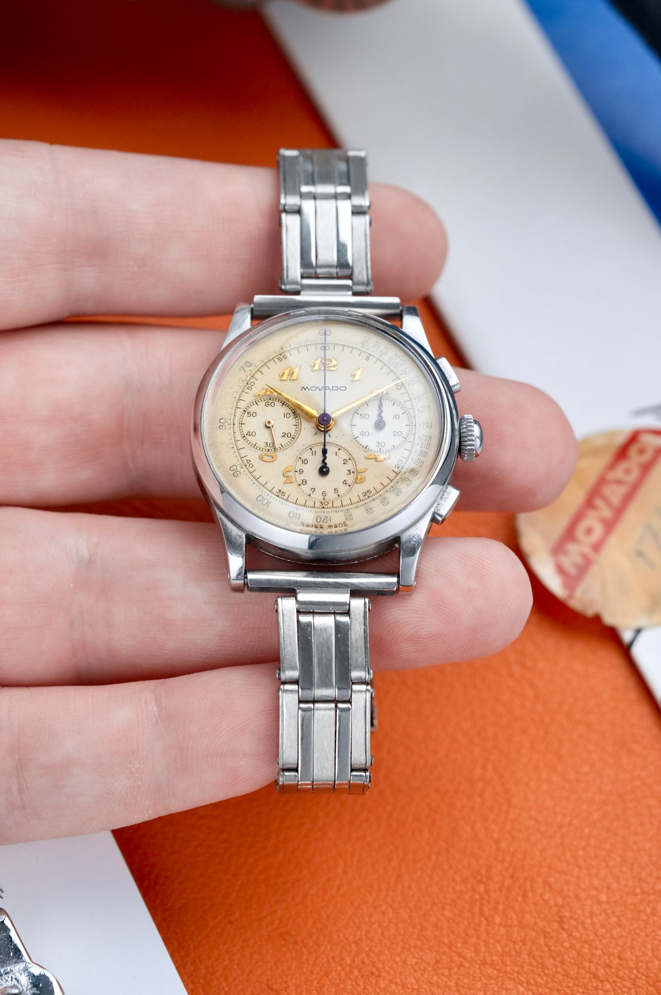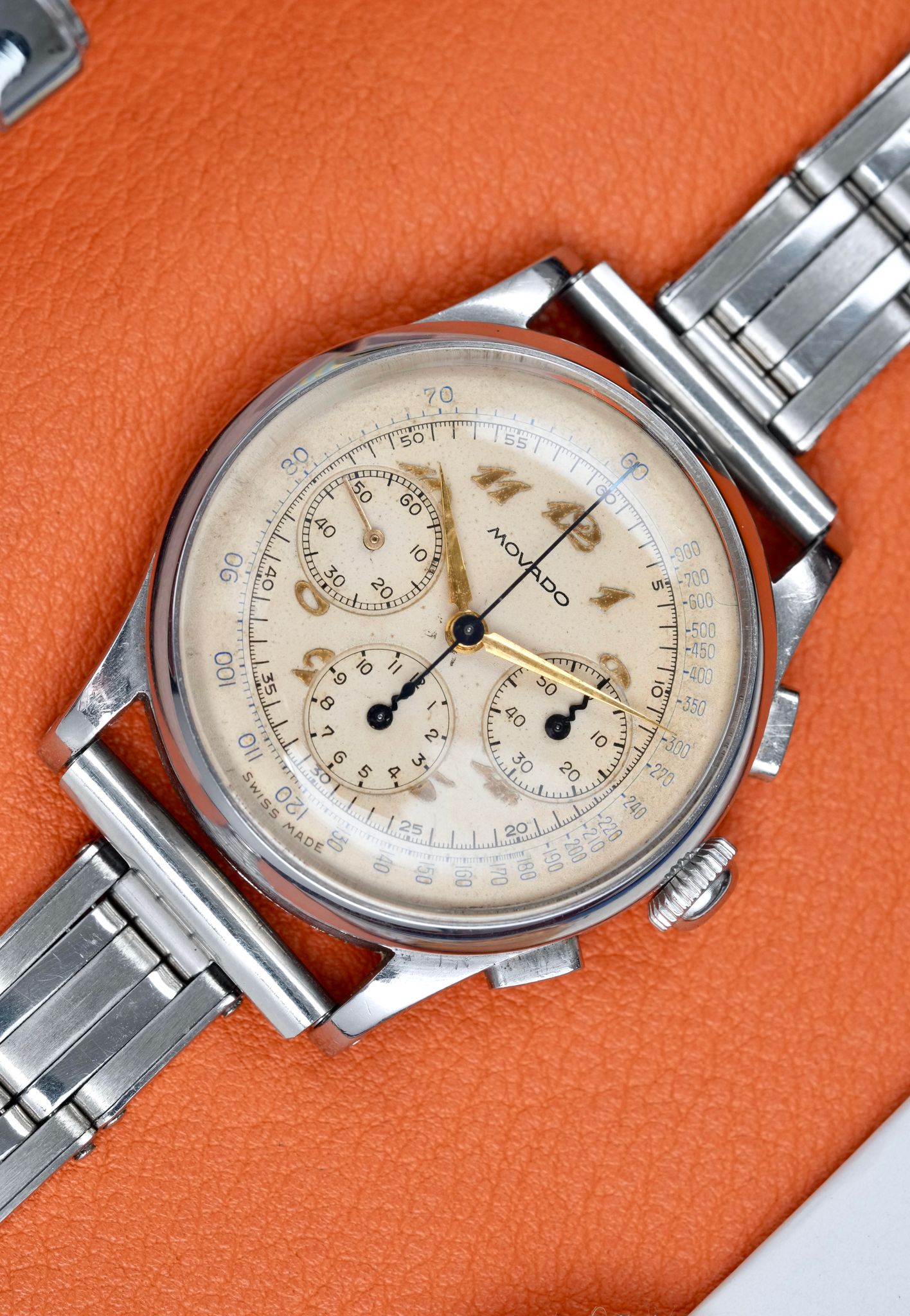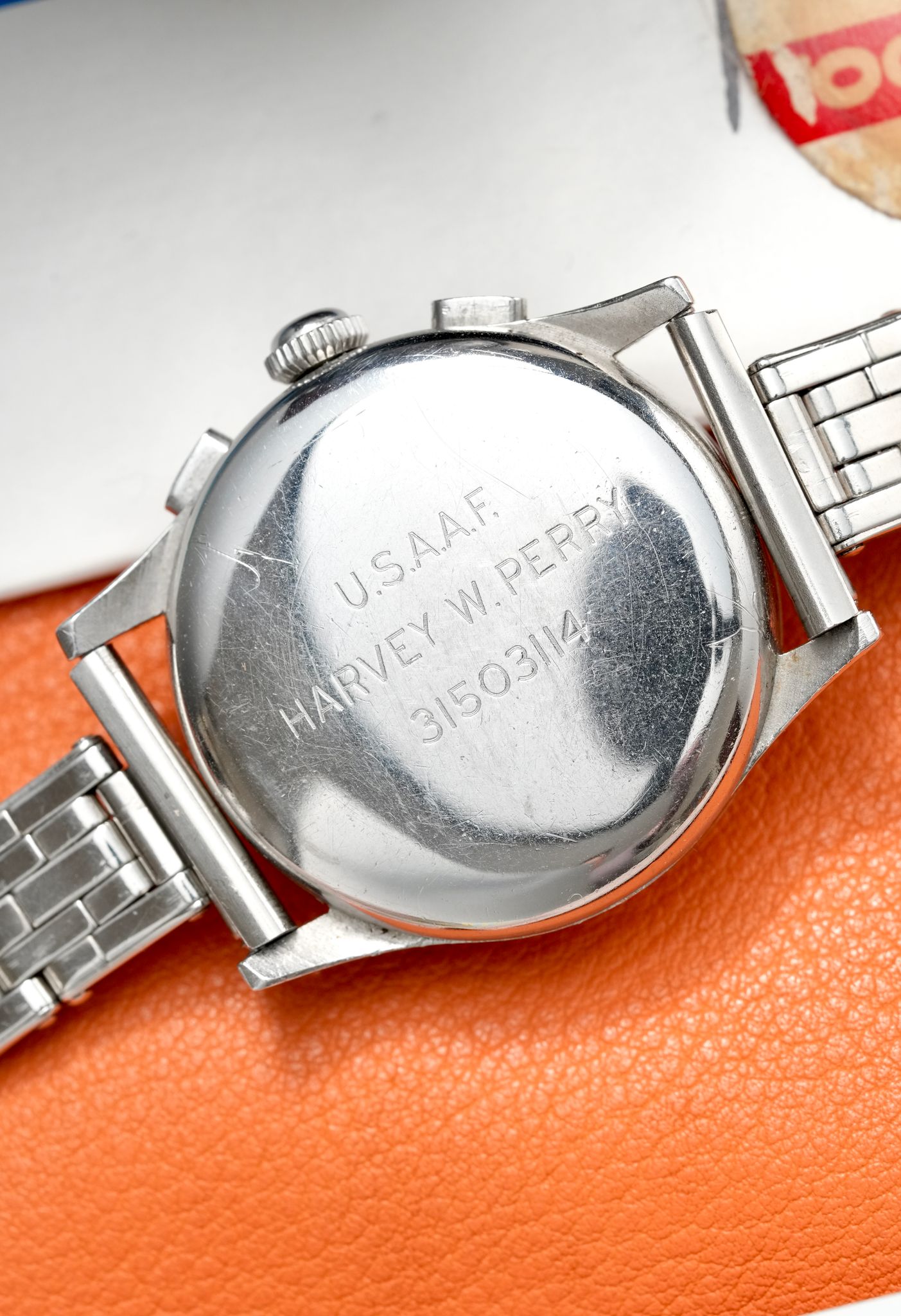 An absolutely exceptional and mega rare 1940s Movado M95 Chronograph with applied gilt Breguet numerals in a 33mm unpolished snapback steel case with square pushers issued to the U.S.A.A.F paired on a period correct riveted Gay Freres bracelet.