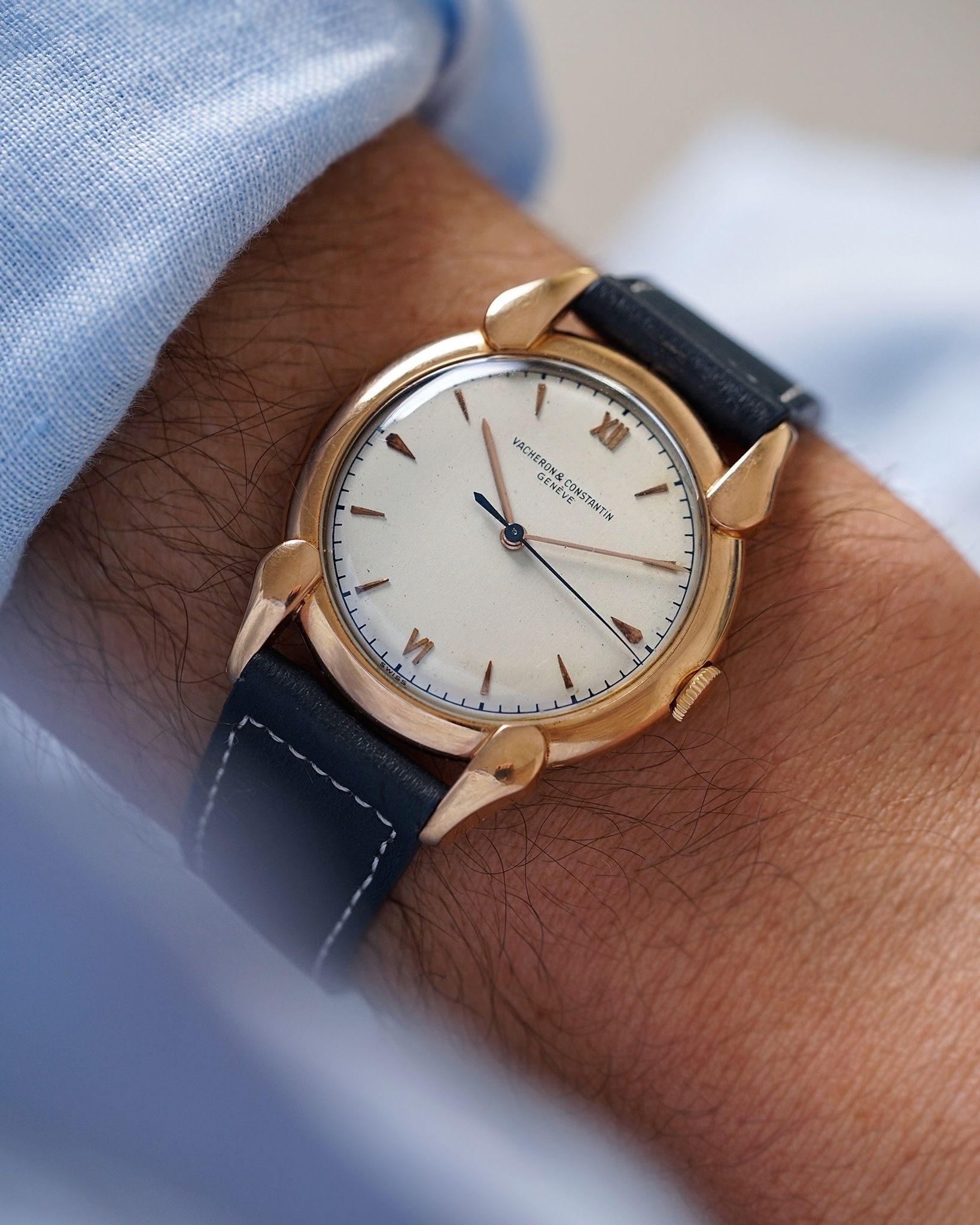 Its nickname, “cow horns,” comes from the sculpted teardrop lugs that give the case such presence, soft curves that have since become a Vacheron signature. While most surviving examples feature intricate honeycomb dials, this watch stands apart with a cleaner, minimalist design that feels both elegant and timeless.