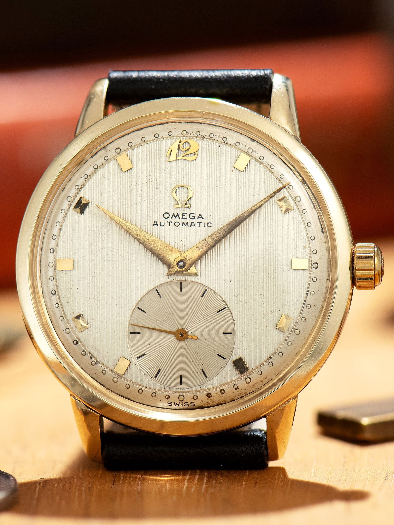 Case in point, this gorgeous 14k gold automatic dress watch from the '40s. It may not have one of the famous monikers on the dial (Seamaster, DeVille, etc) but it makes up for it with a demure, timeless, intricate dial, that in some ways, is even better. The incredible ribbon-style guilloche finish of the dial is absolutely stunning, also uncommonly seen with Omega, and is finished with an elegant Breguet numeral at 12 o'clock.