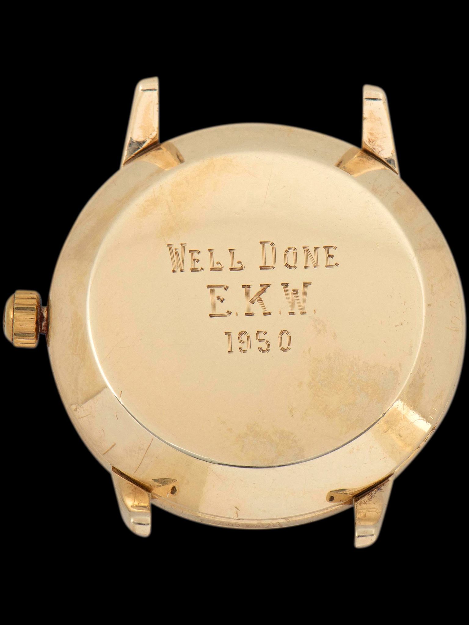 The 14K yellow gold case is in exceptional condition, showcasing the original case dimensions and angles in impressively crisp condition with only light signs of previous polishing present. The Omega crown is believed to be and early OEM Omega replacement. The case back features an engraving that reads "Well Done, E.K.W., 1950". The watch comes supplied on a two-piece leather strap.