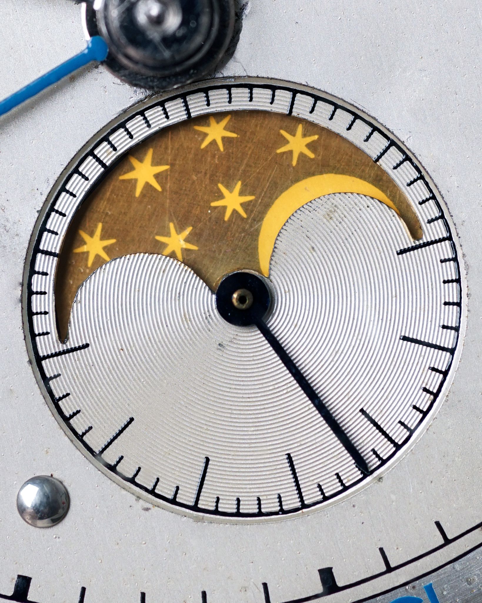 The moonphase disc has aged into a breathtaking warm tropical hue, adding unique character and charm.
