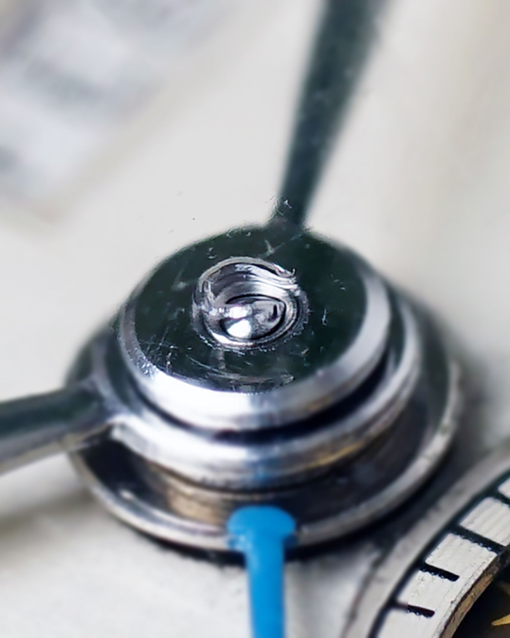 The dial's outer track showcases a striking blue date chapter ring, perfectly complementing the silver hands and round applied markers, all in outstanding condition, just like the vivid blue date hand.