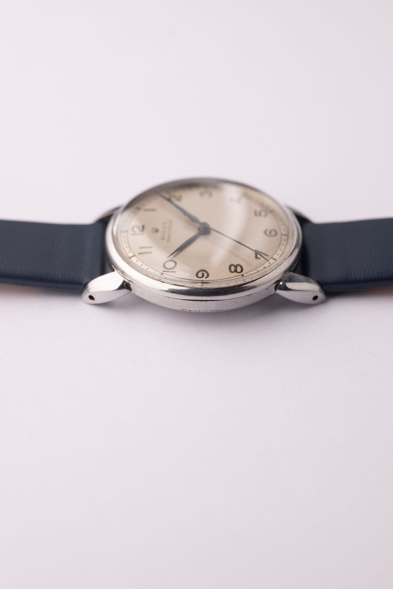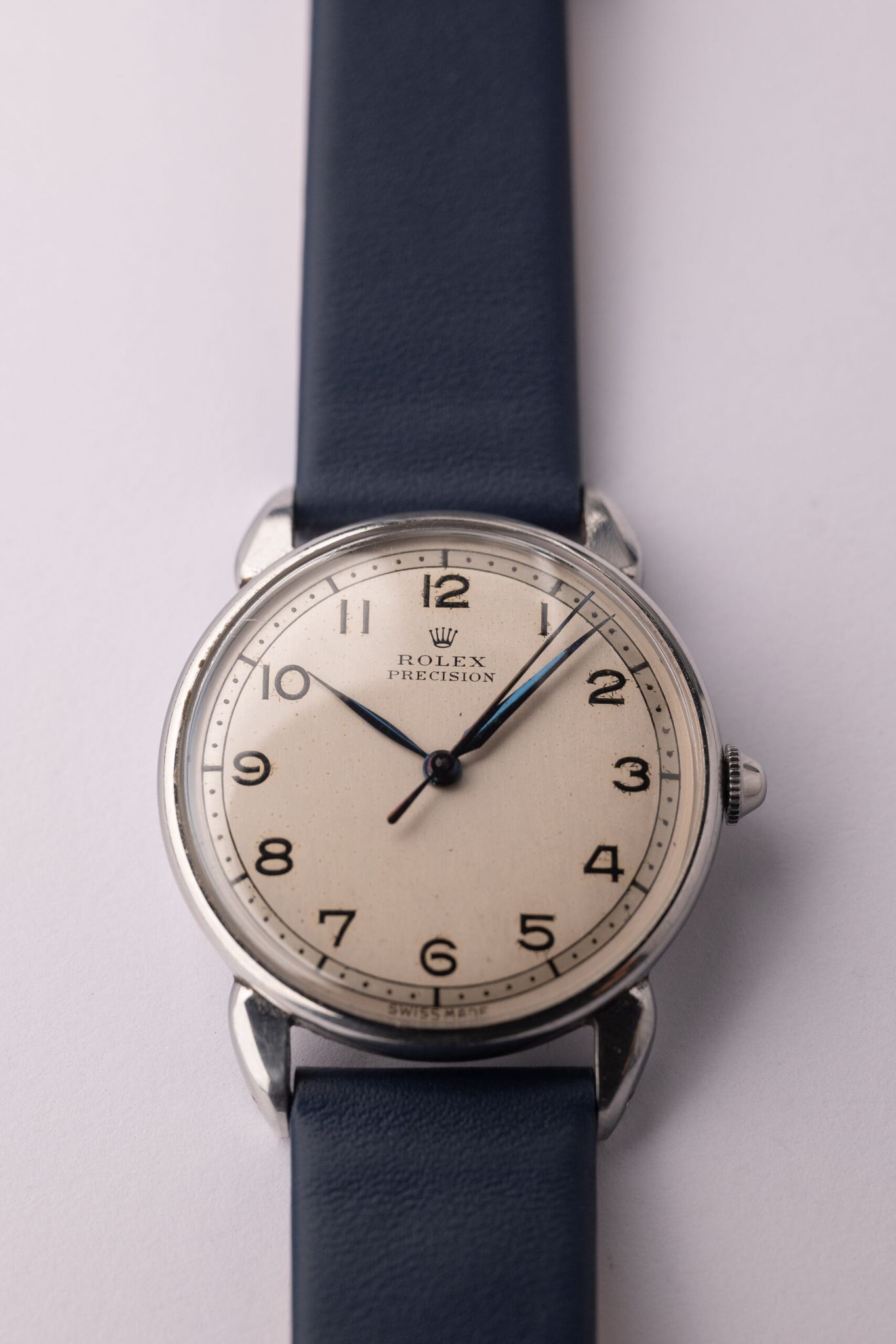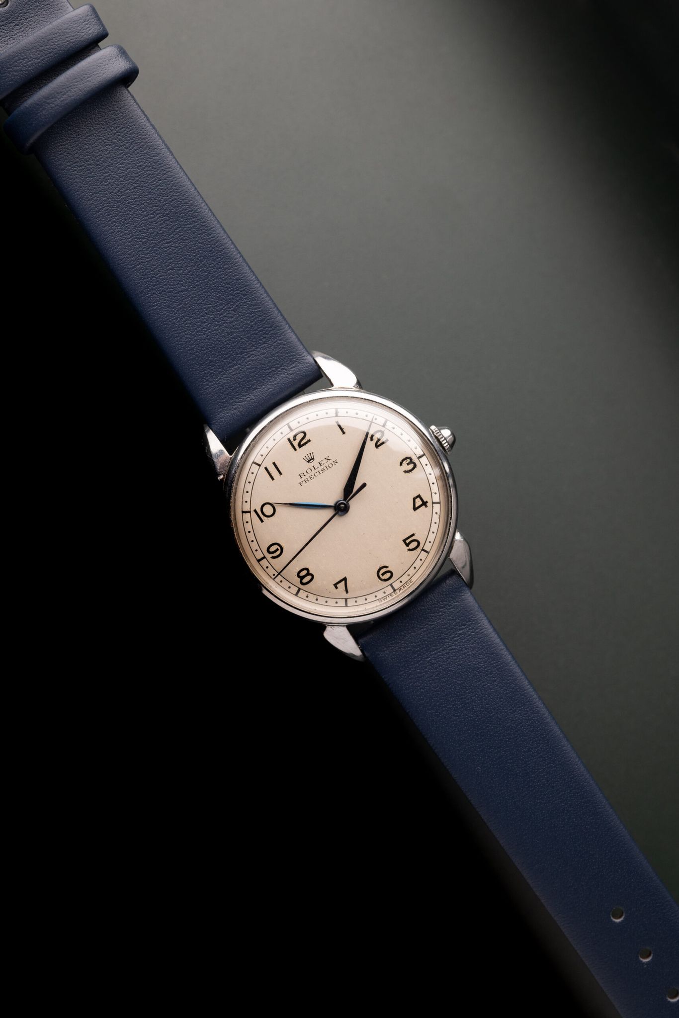 Vintage 34mm Rolex Precision whose grasshopper lugs, blue dauphine hands, and art-deco styling recalls watches of 40’s age. Powered by Rolex’s 17-jewel cal. 1225 and wrapped in blue leather, the 4659 is a rarer early-Precision reference.