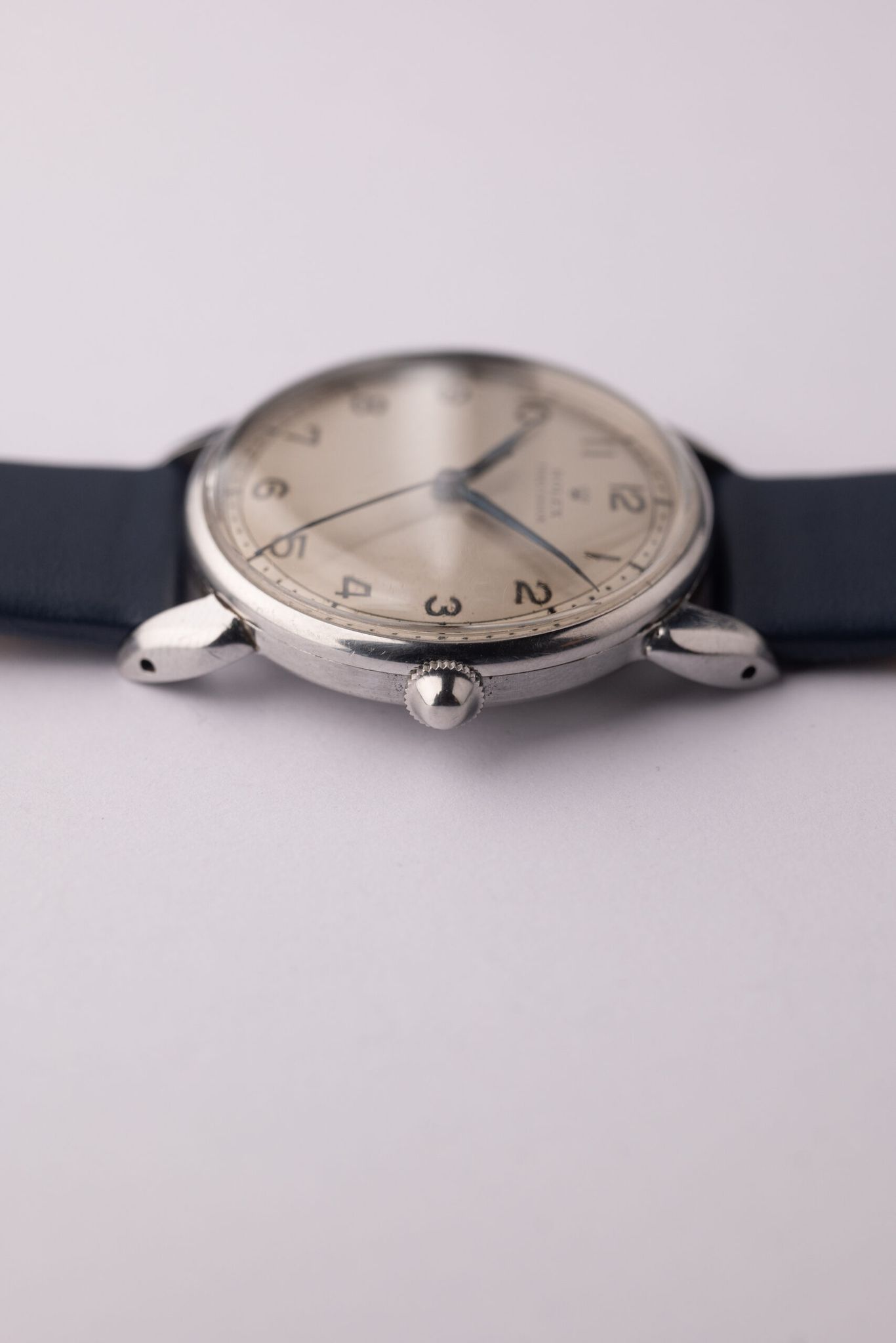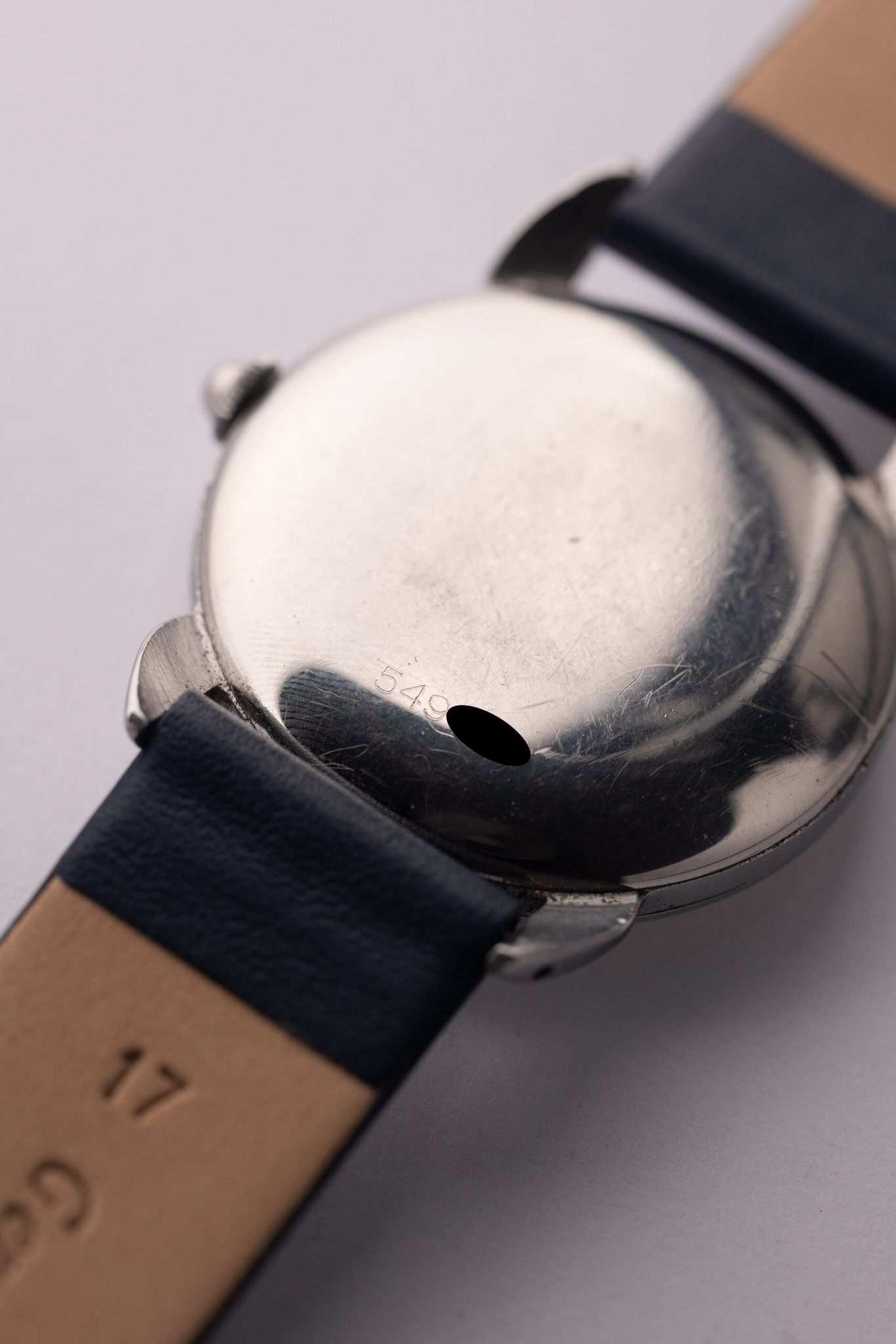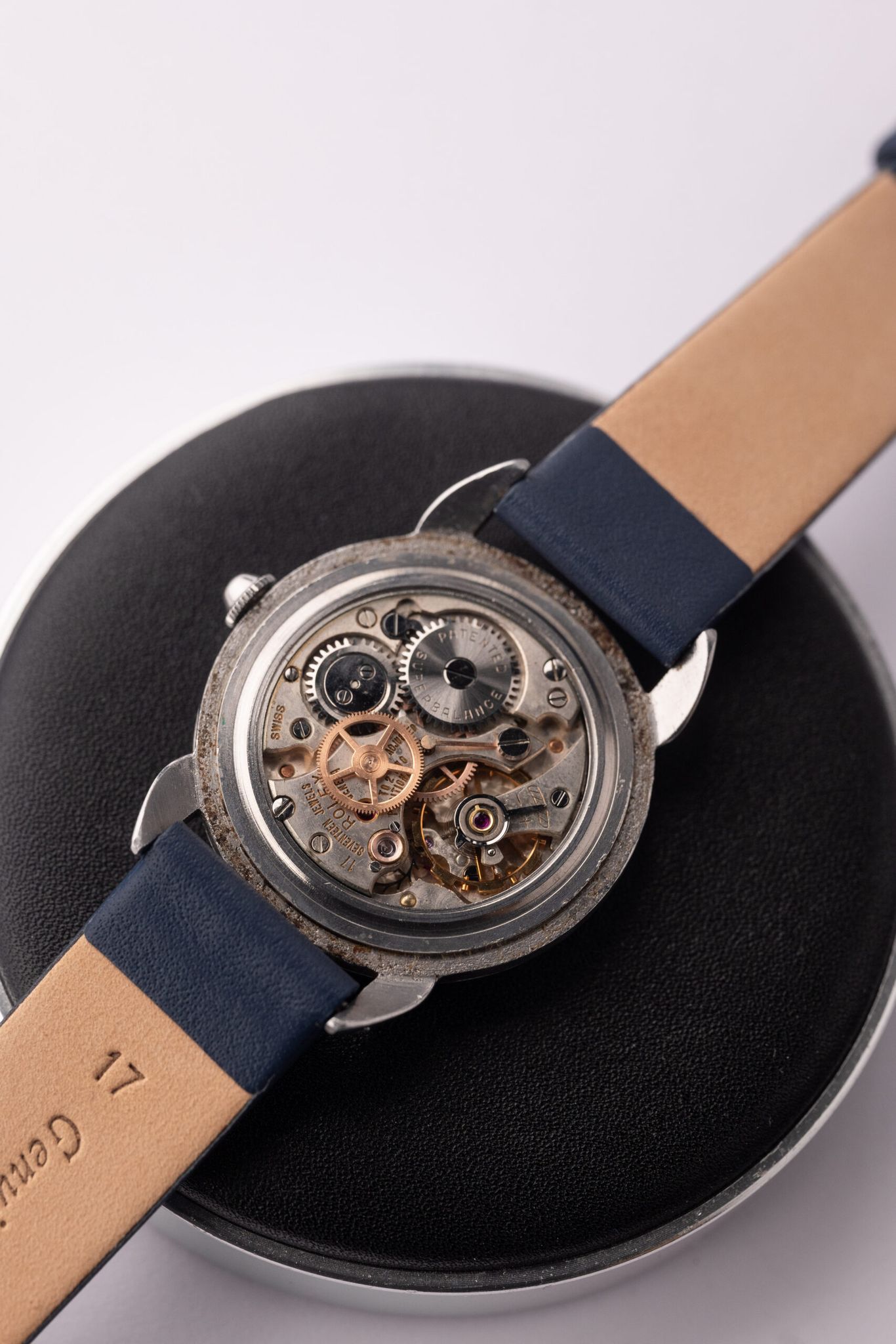 Vintage 34mm Rolex Precision whose grasshopper lugs, blue dauphine hands, and art-deco styling recalls watches of 40’s age. Powered by Rolex’s 17-jewel cal. 1225 and wrapped in blue leather, the 4659 is a rarer early-Precision reference.