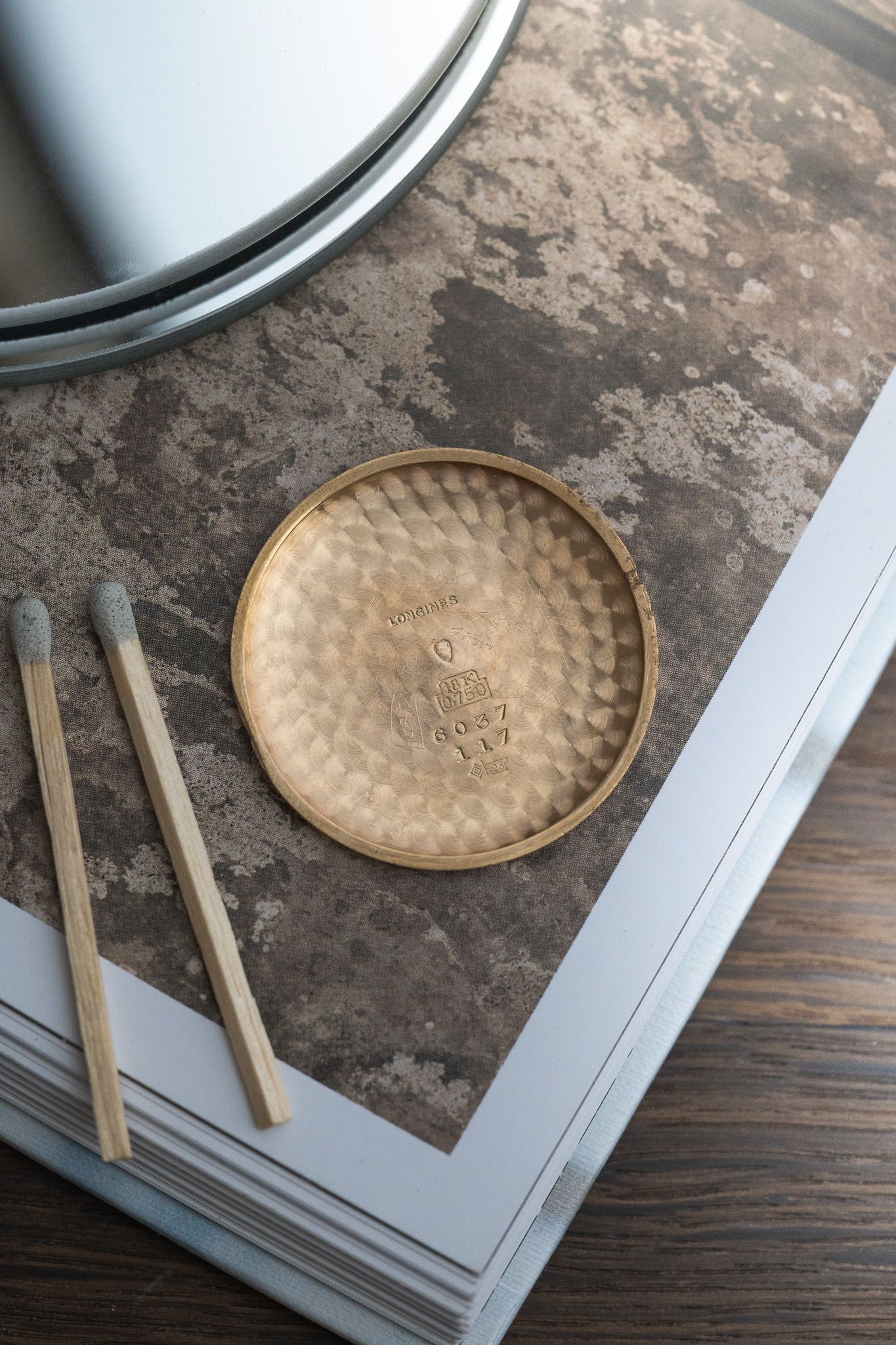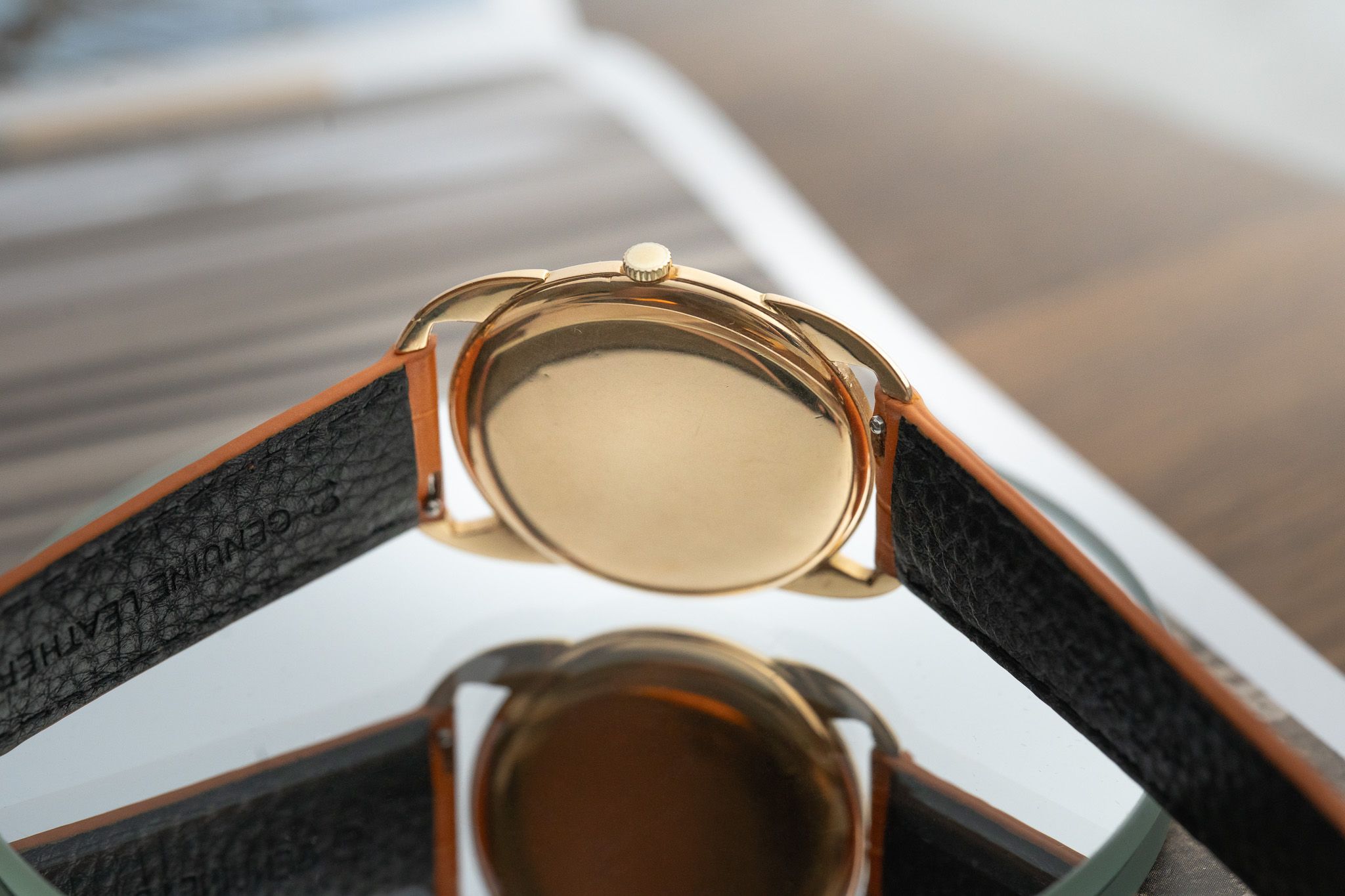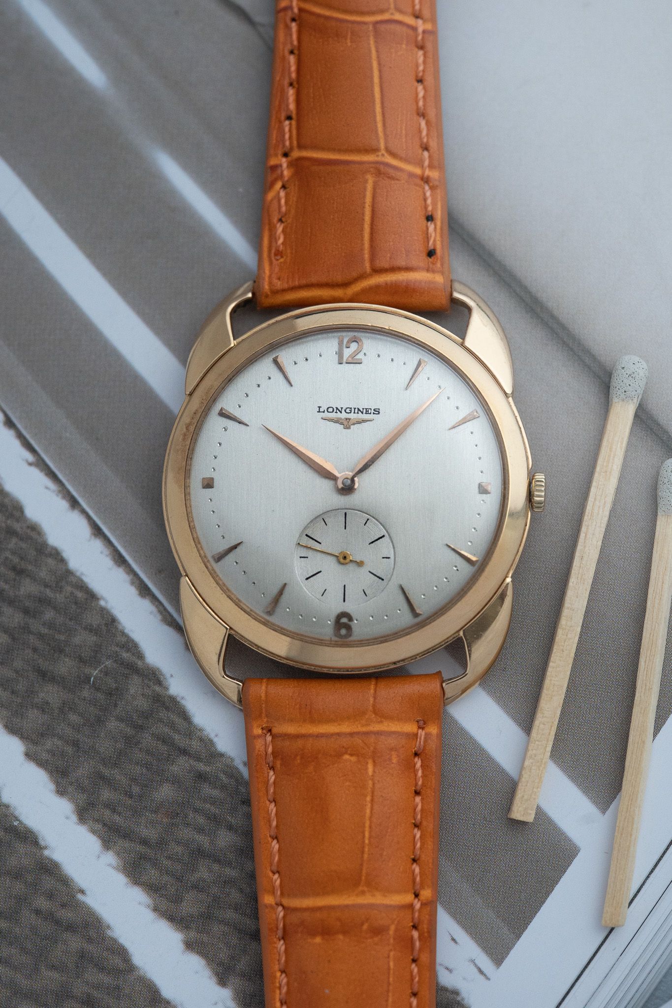 This 1949 men's Longines is a stunning example of post-war Swiss watchmaking, housed in an oversized 36mm solid 18k yellow gold case, an impressive size for the era.