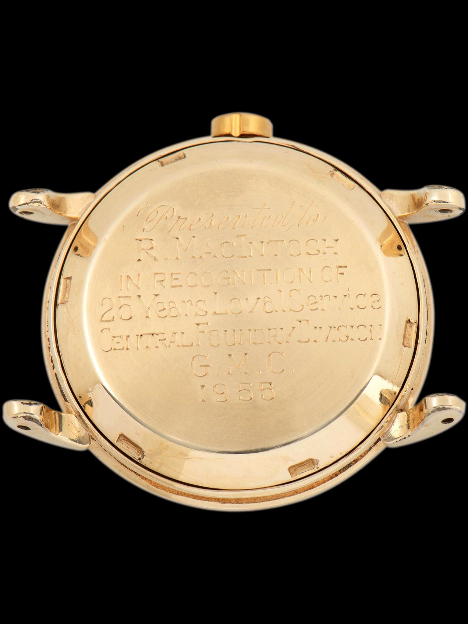The incredible Seamaster-esque 14k yellow gold-filled case is in remarkable overall condition, retaining thick factory dimensions with only minimal signs of previous use. The case retains its original gold Omega signed crown. The screw-down case back shows some signs of wear, and features an engraving that reads, "Presented to R. MacIntosh in recognition of 25 years of loyal service. Central Foundry Division. GMC. 1955." The watch comes supplied on a two-piece handmade leather strap.