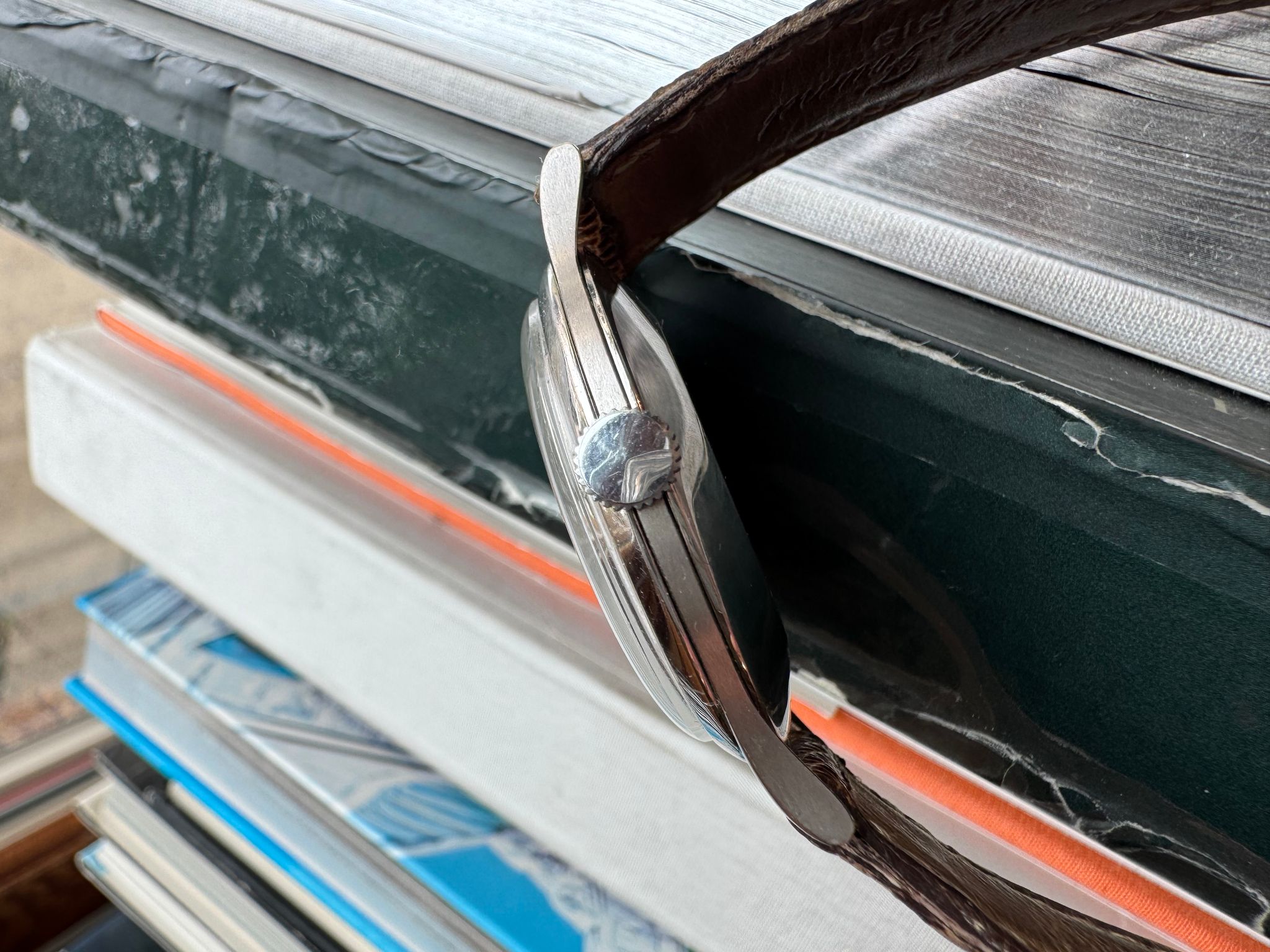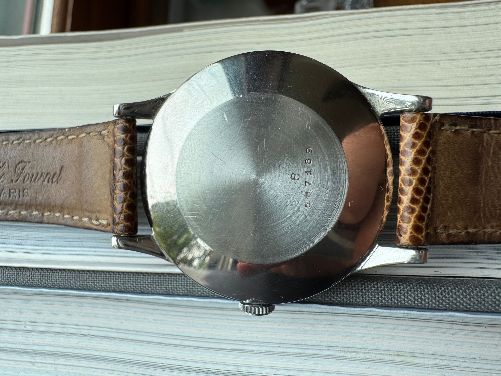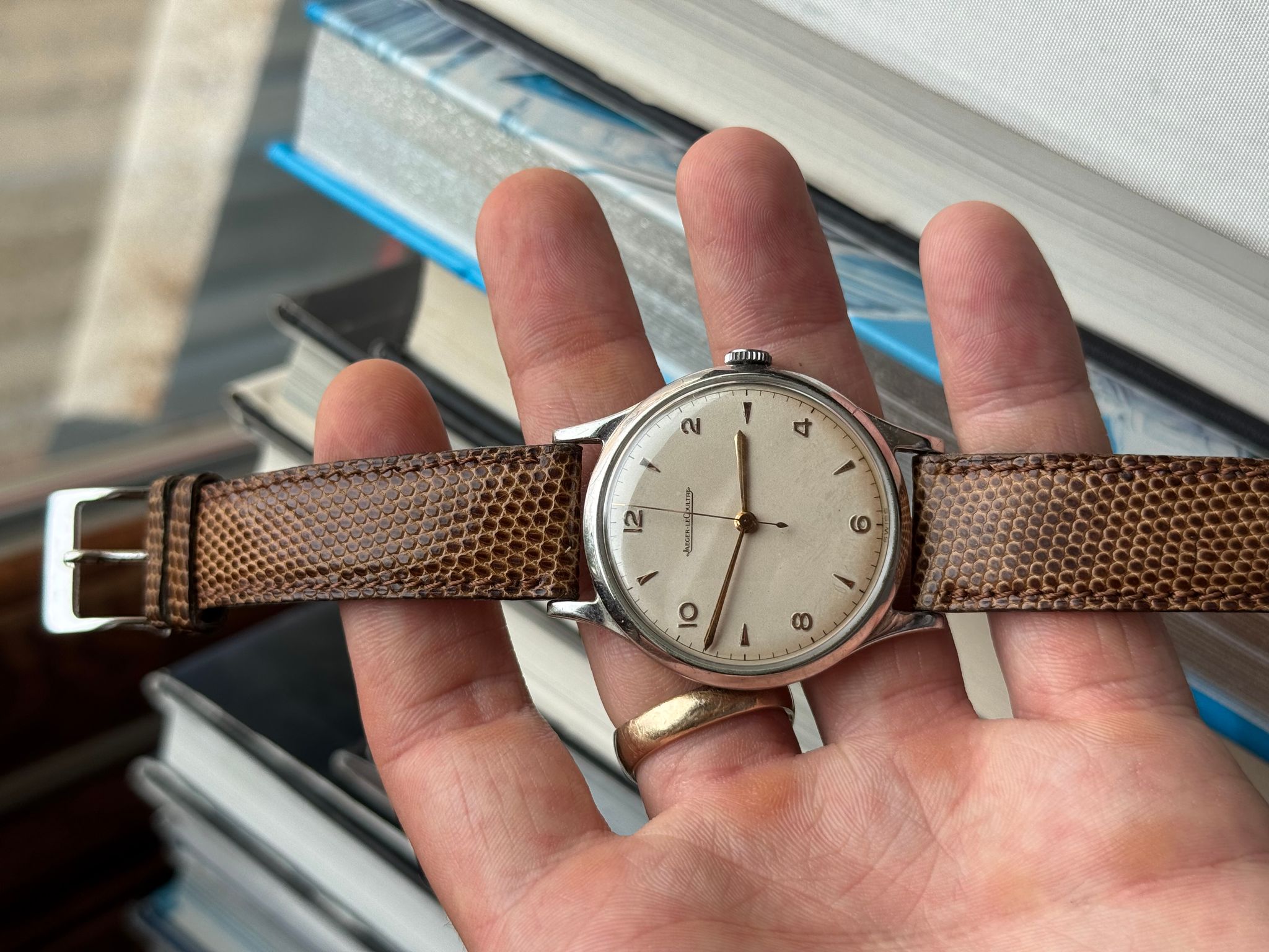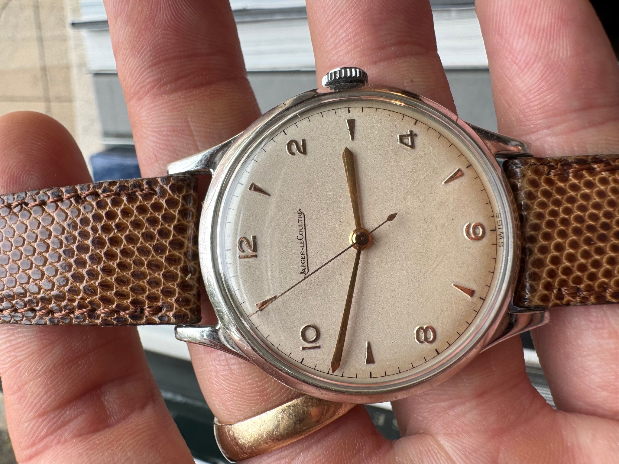1950’s Jaeger LeCoultre 36mm Steel Manual Wind Watch Cal 478. Watch features an aftermarket band/buckle.
