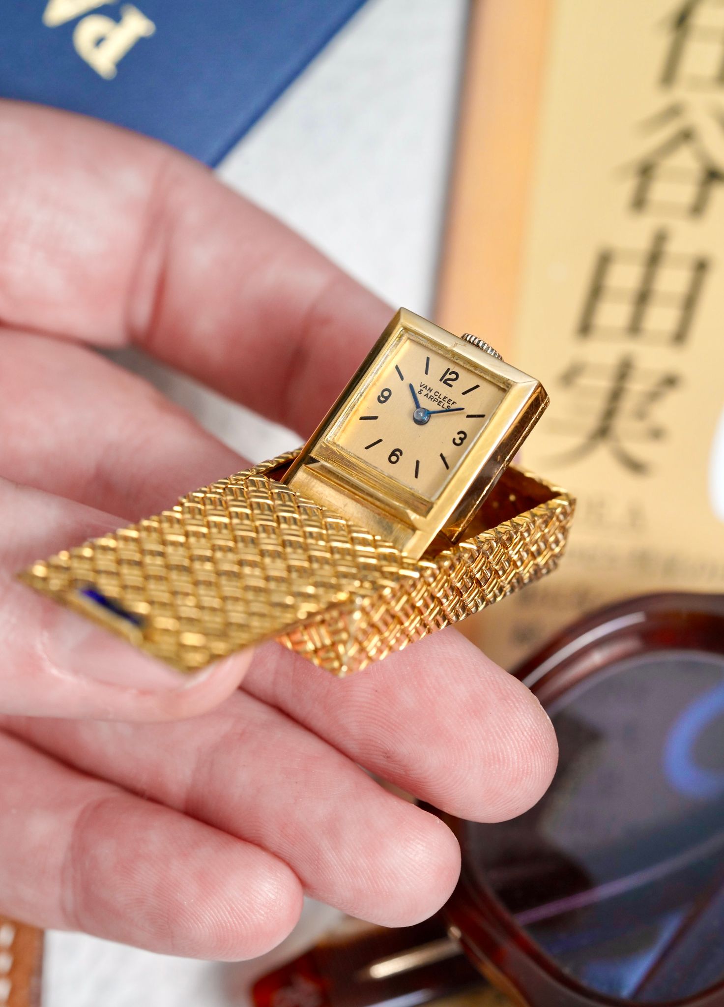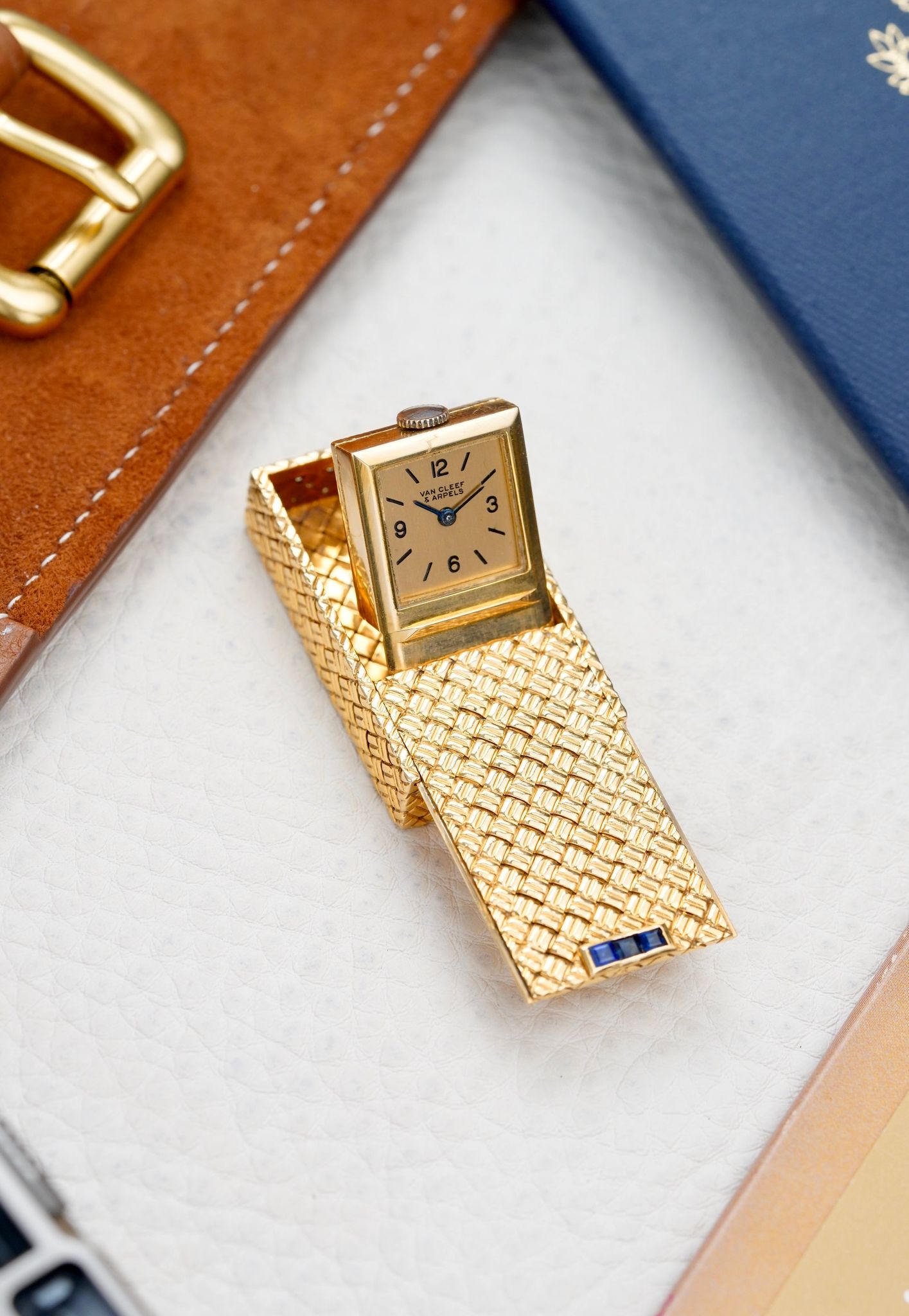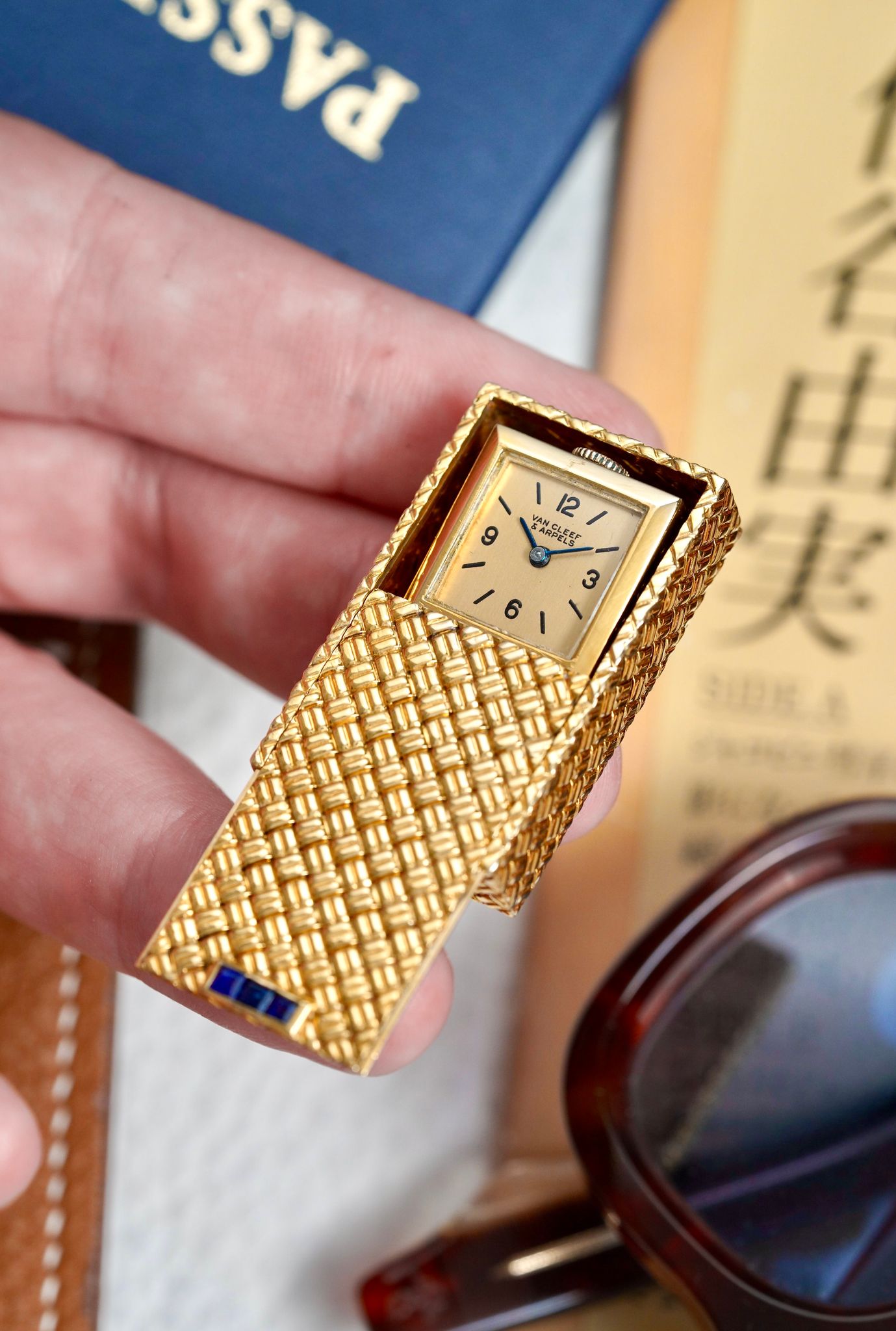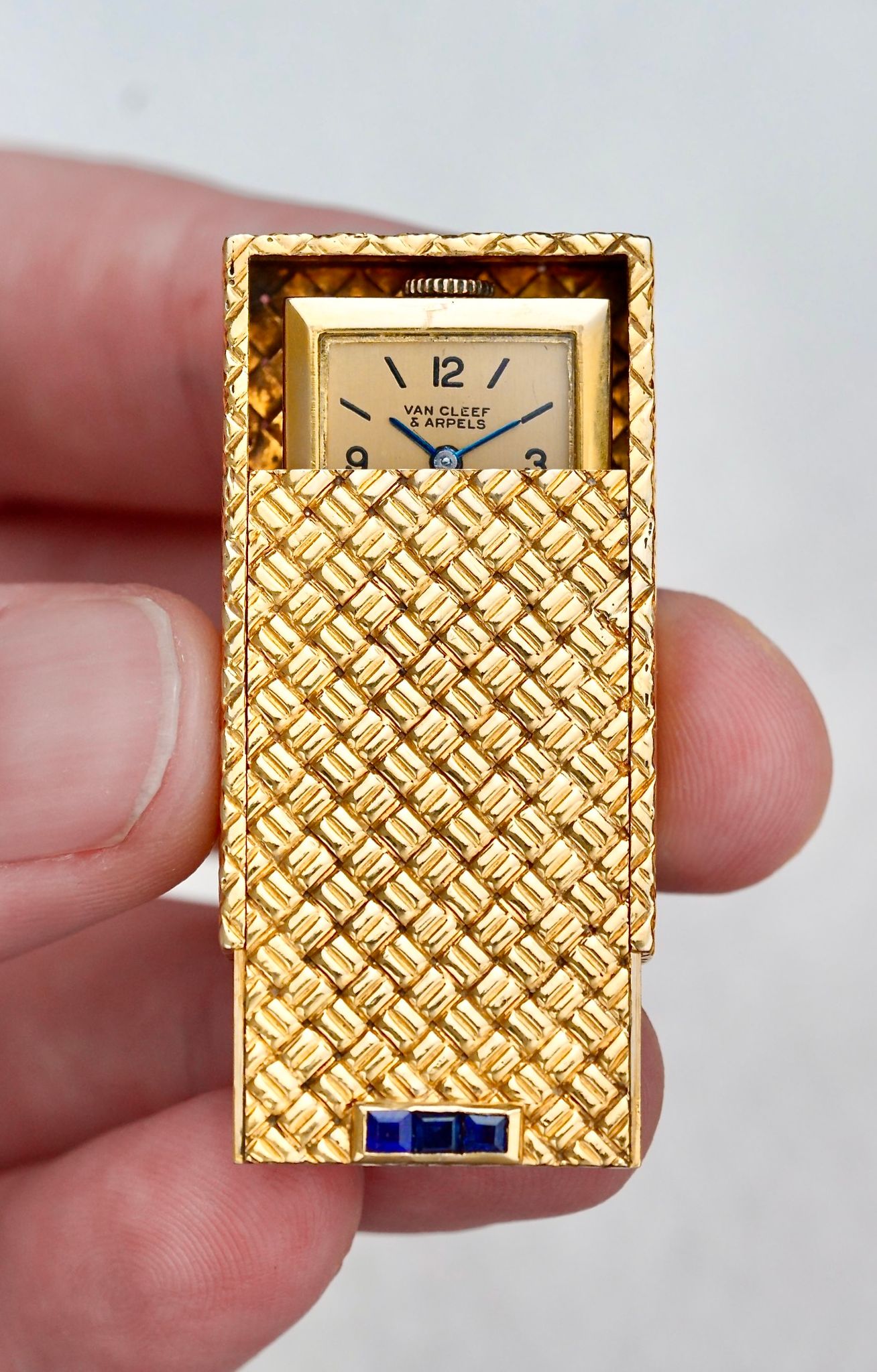 A beautiful 1950s peek-a-boo travel clock by Van Cleef & Arpels for the New York boutique, crafted in woven 18K yellow gold, with a clever sliding system set with three signature sapphires, that reveals the clock within, powered by a manually wound caliber, hand painted dial simply signed "Van Cleef & Arpels".