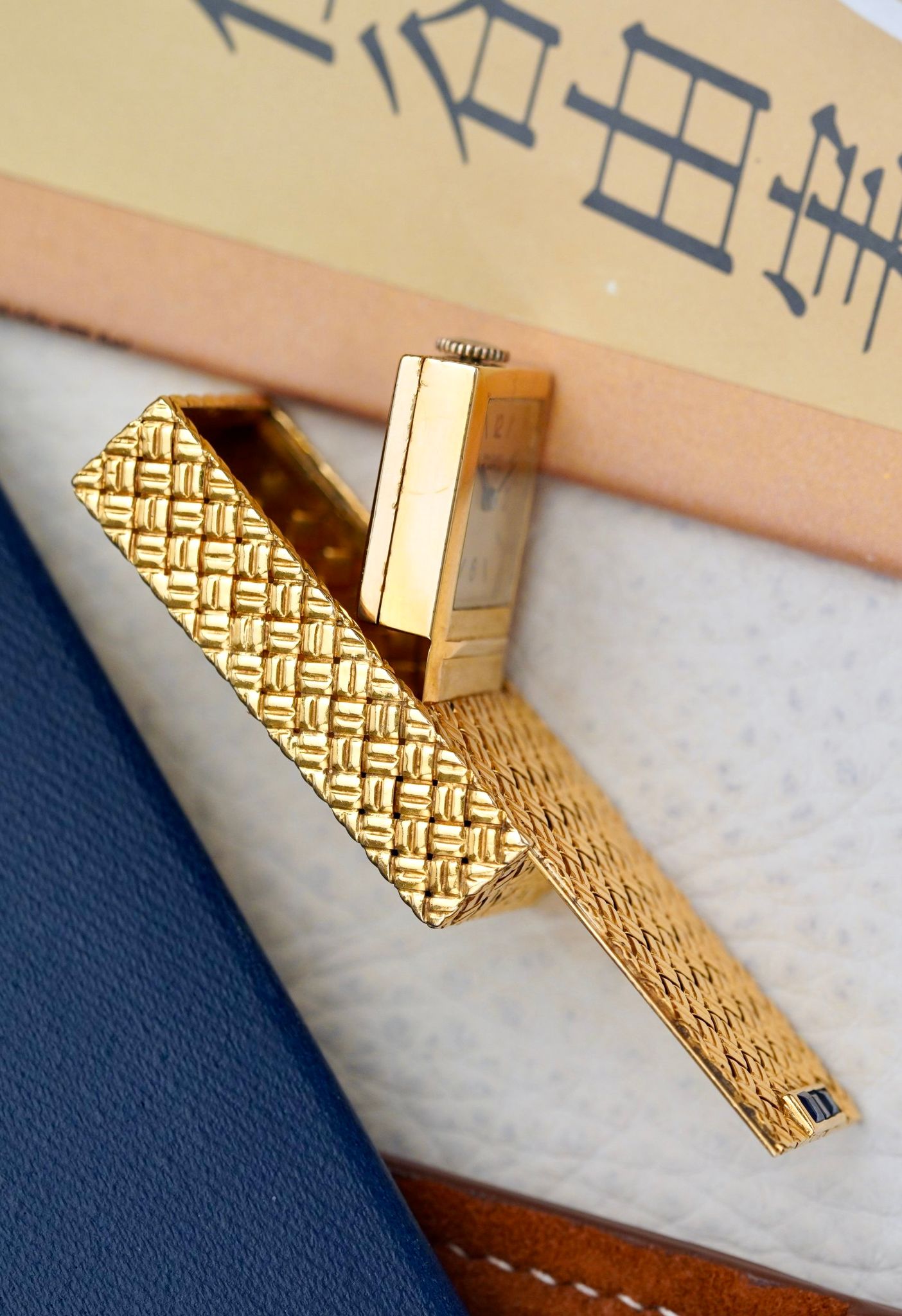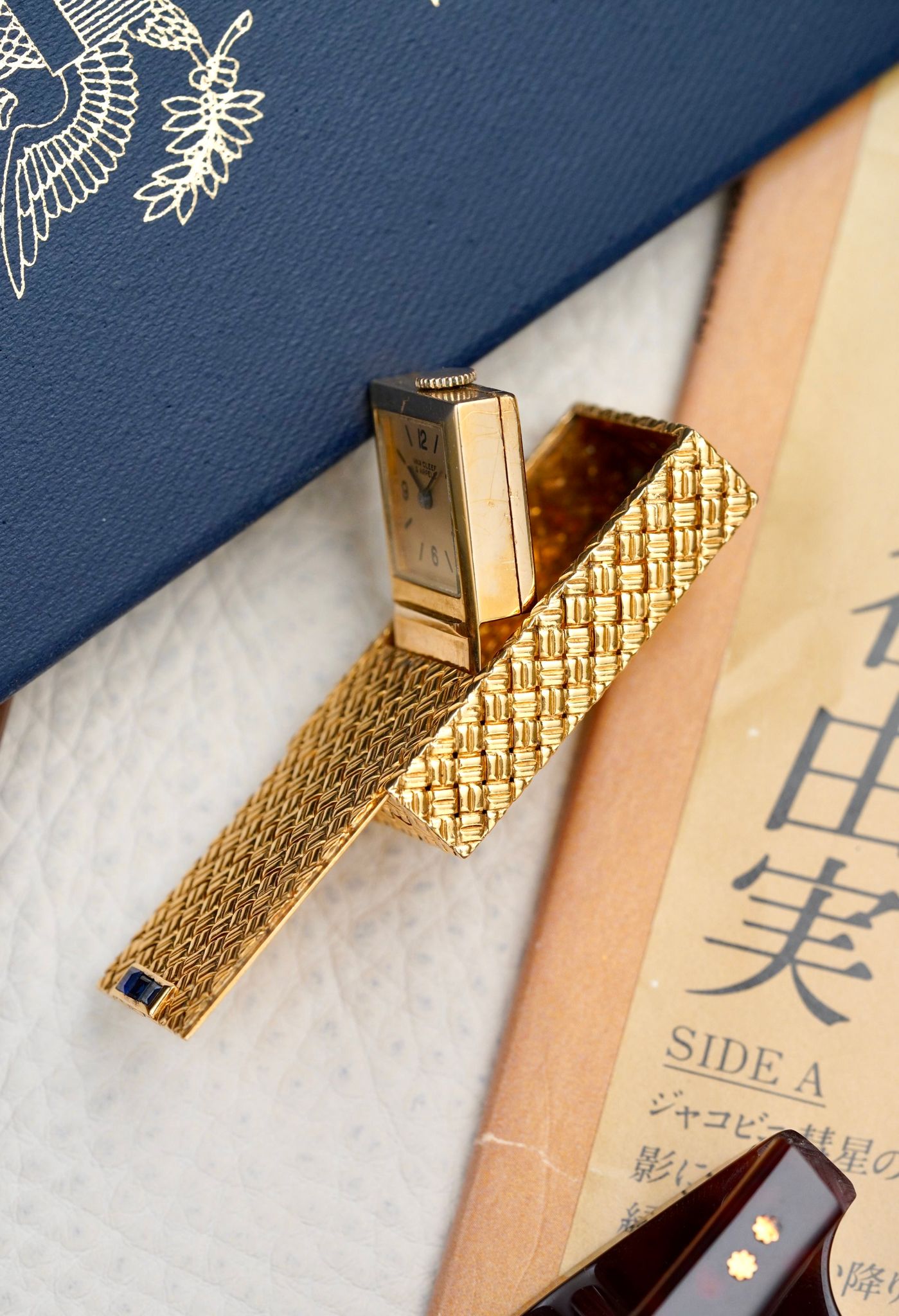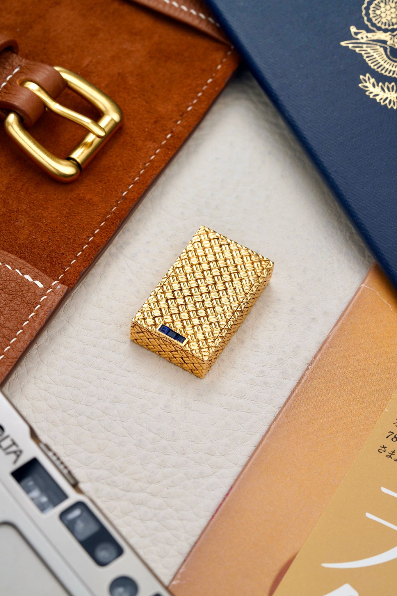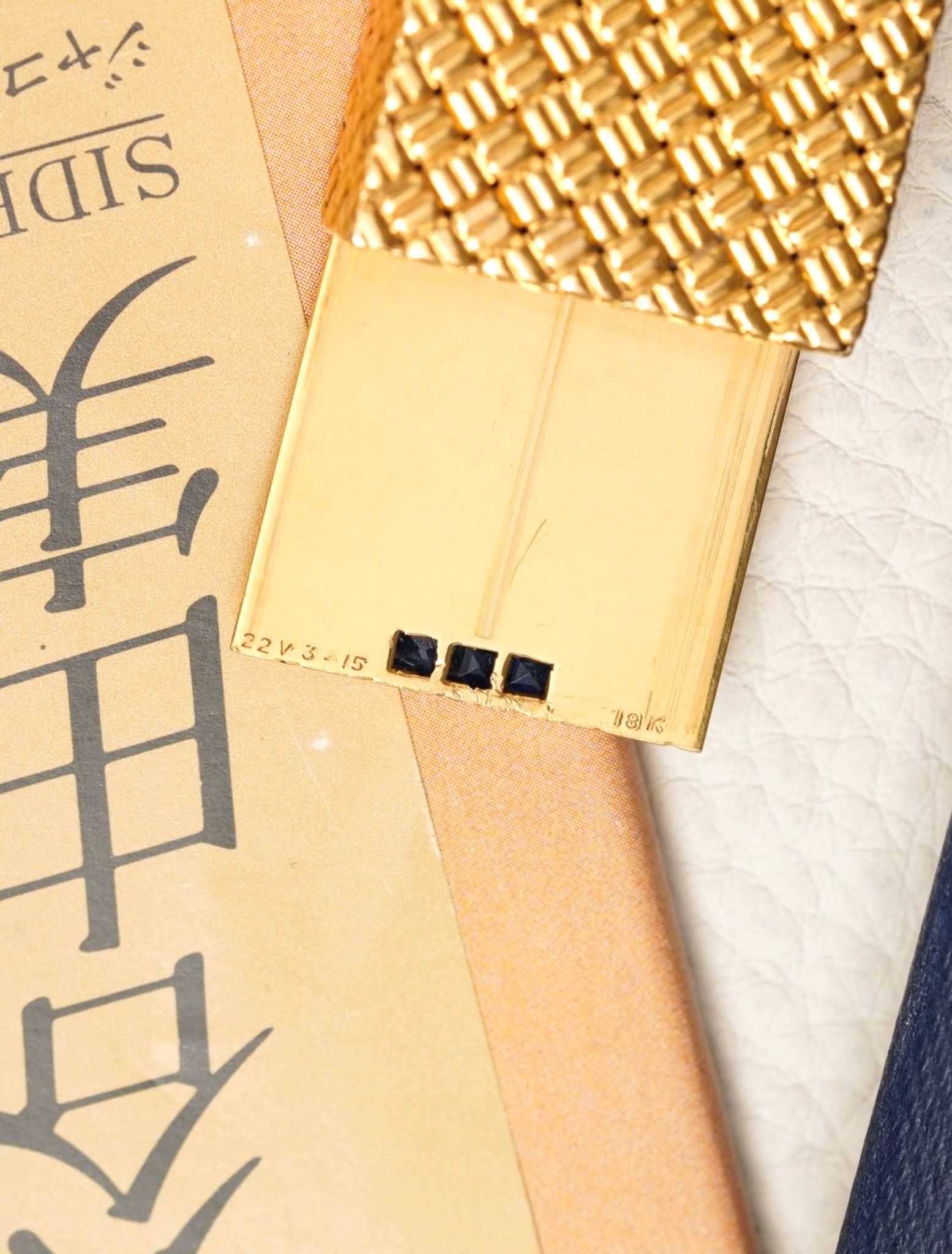 A beautiful 1950s peek-a-boo travel clock by Van Cleef & Arpels for the New York boutique, crafted in woven 18K yellow gold, with a clever sliding system set with three signature sapphires, that reveals the clock within, powered by a manually wound caliber, hand painted dial simply signed "Van Cleef & Arpels".