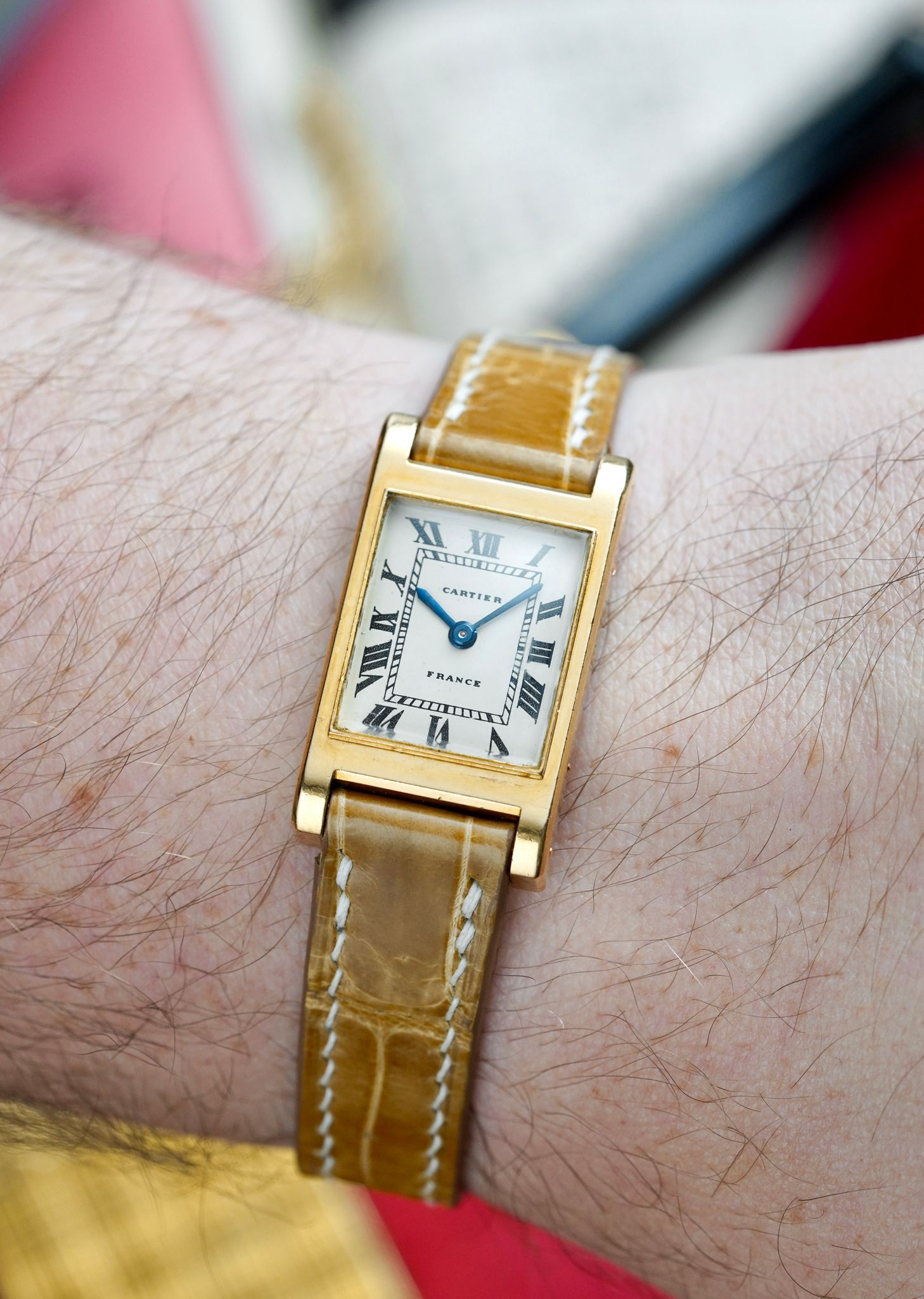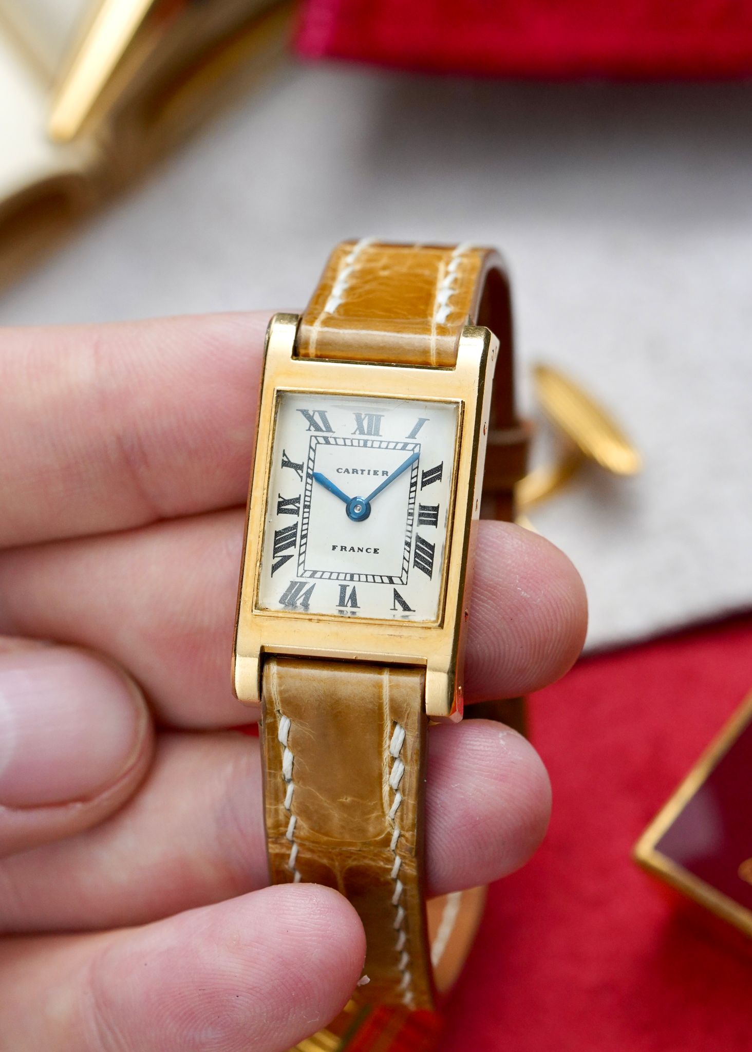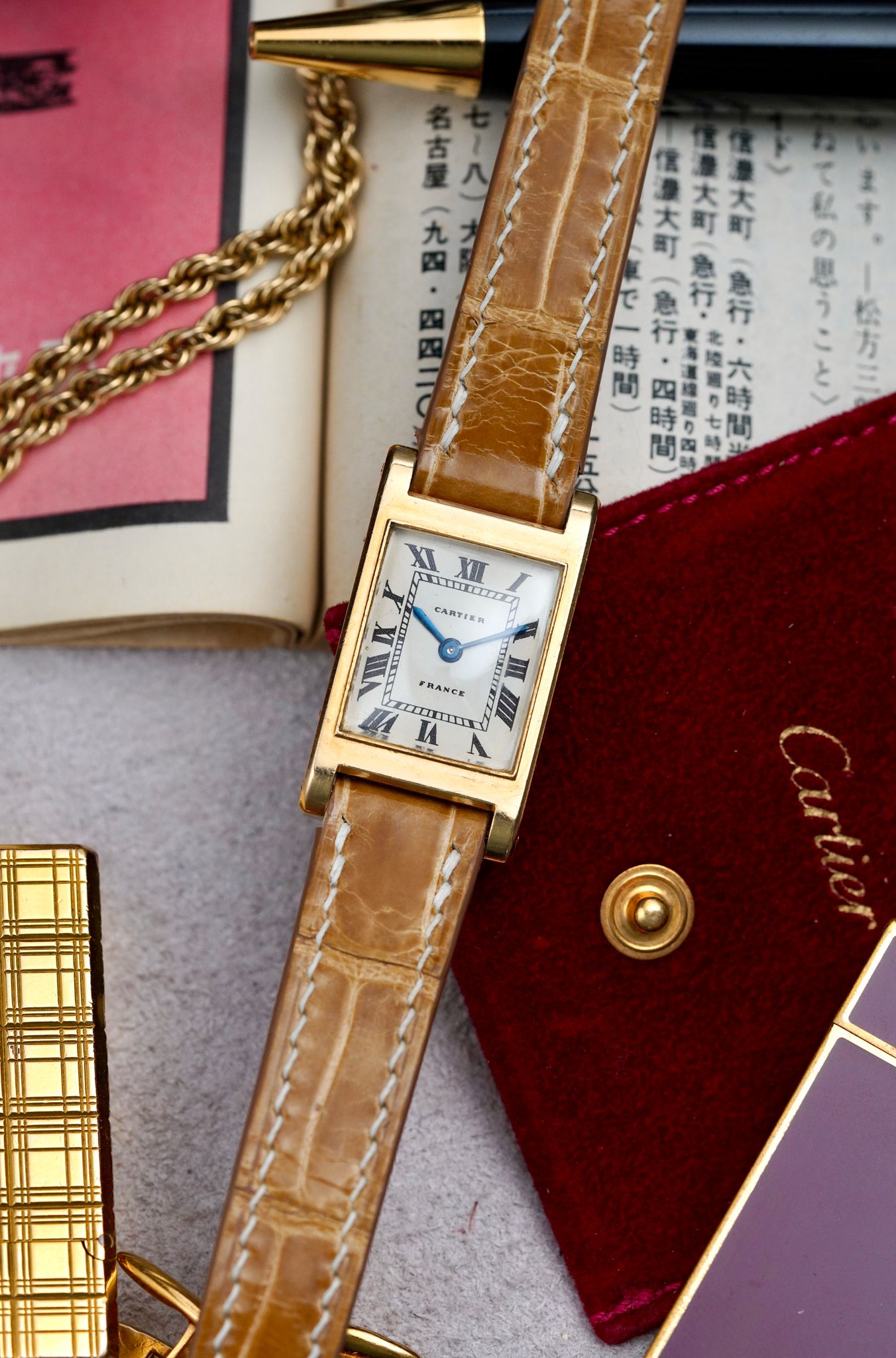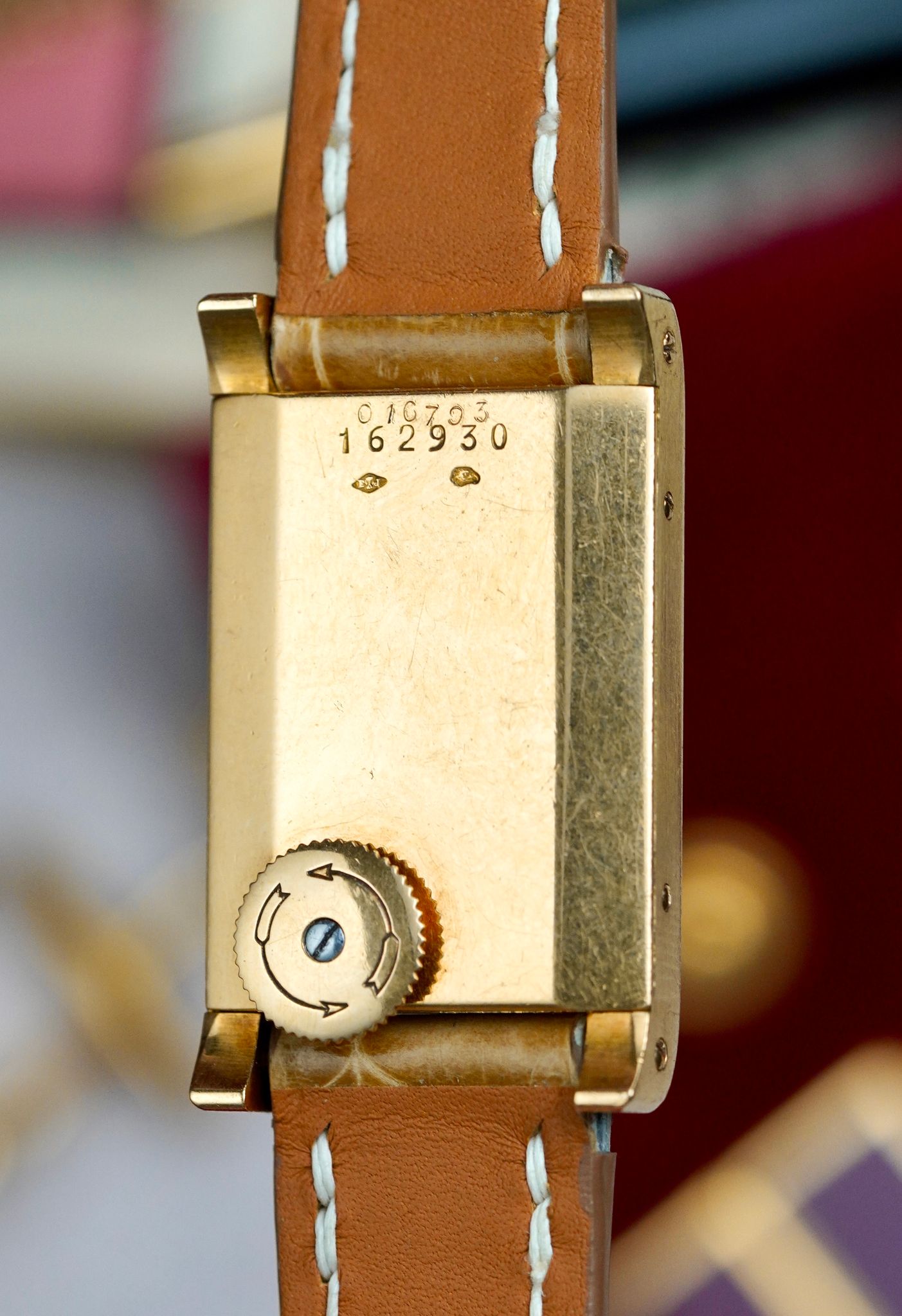 A stunning and rare 1950s Cartier Tank Cornice in 18K yellow gold, absolutely untouched with sharp bevels, a beautiful pearly white “France” dial, JLC Duoplan caliber, bec d’aigle lugs as well as tack Edmond Jaeger and French assay marks.