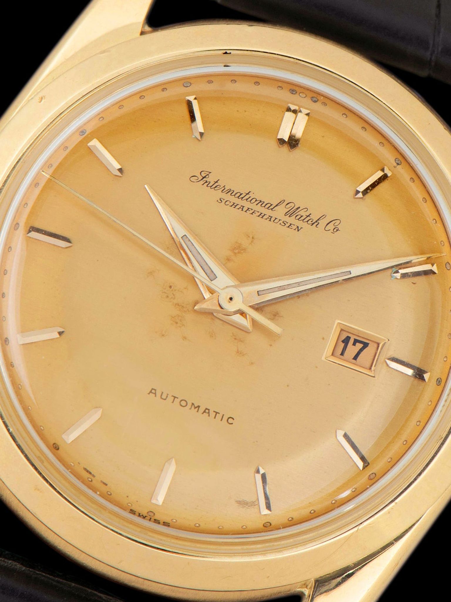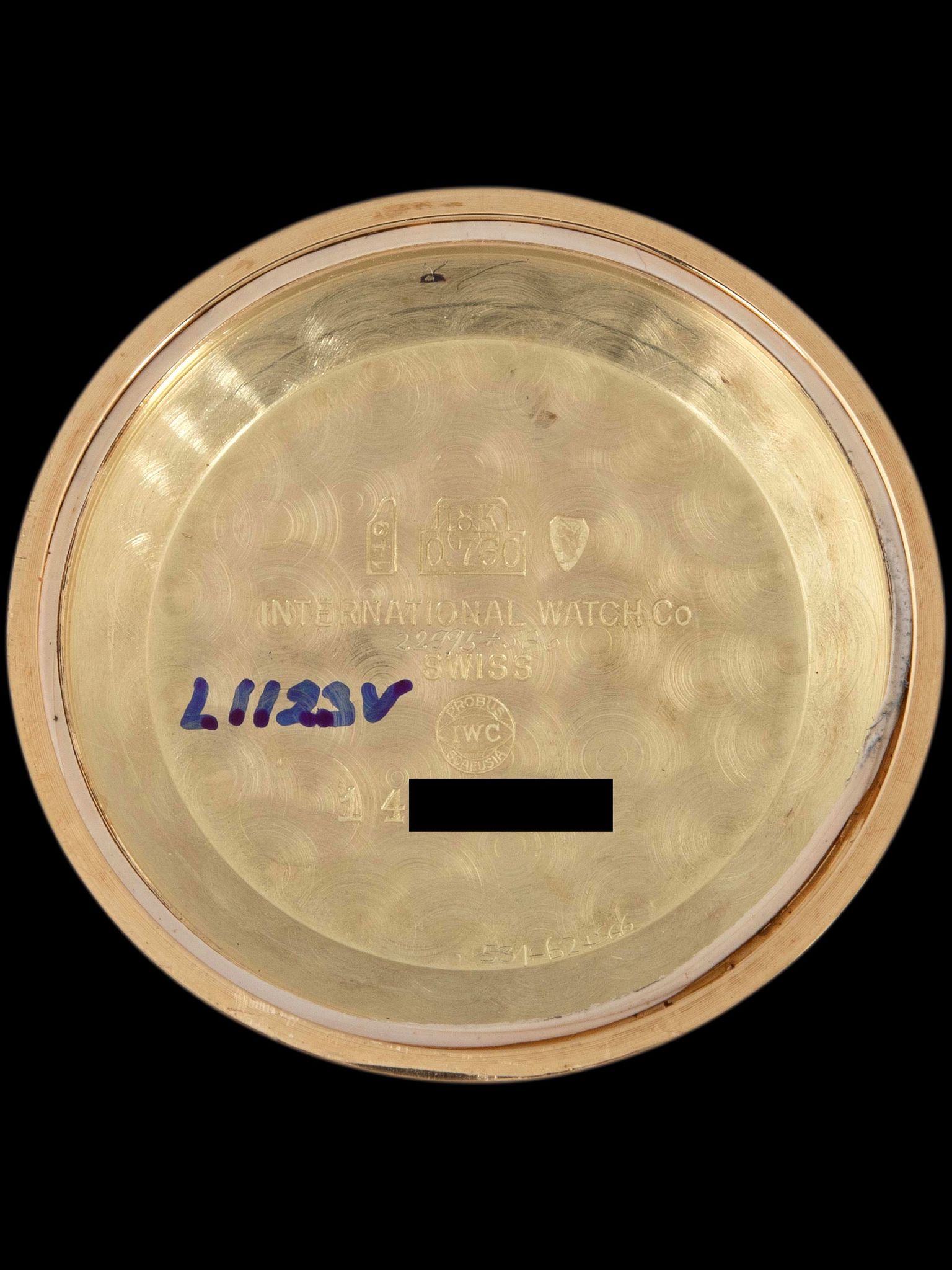 The elegant yet robust 18K yellow gold case features long, broad lugs that extend the overall dimensions of the watch. The case exhibits nominal evidence of previous polishing as the lugs remain extremely thick with strong factory dimensions and angles throughout. Signs of very gentle use are present throughout the case as well. The case retains its original IWC fish logo crown. The snap-on case back is in excellent condition. The watch comes supplied on a 2pc handmade leather strap.