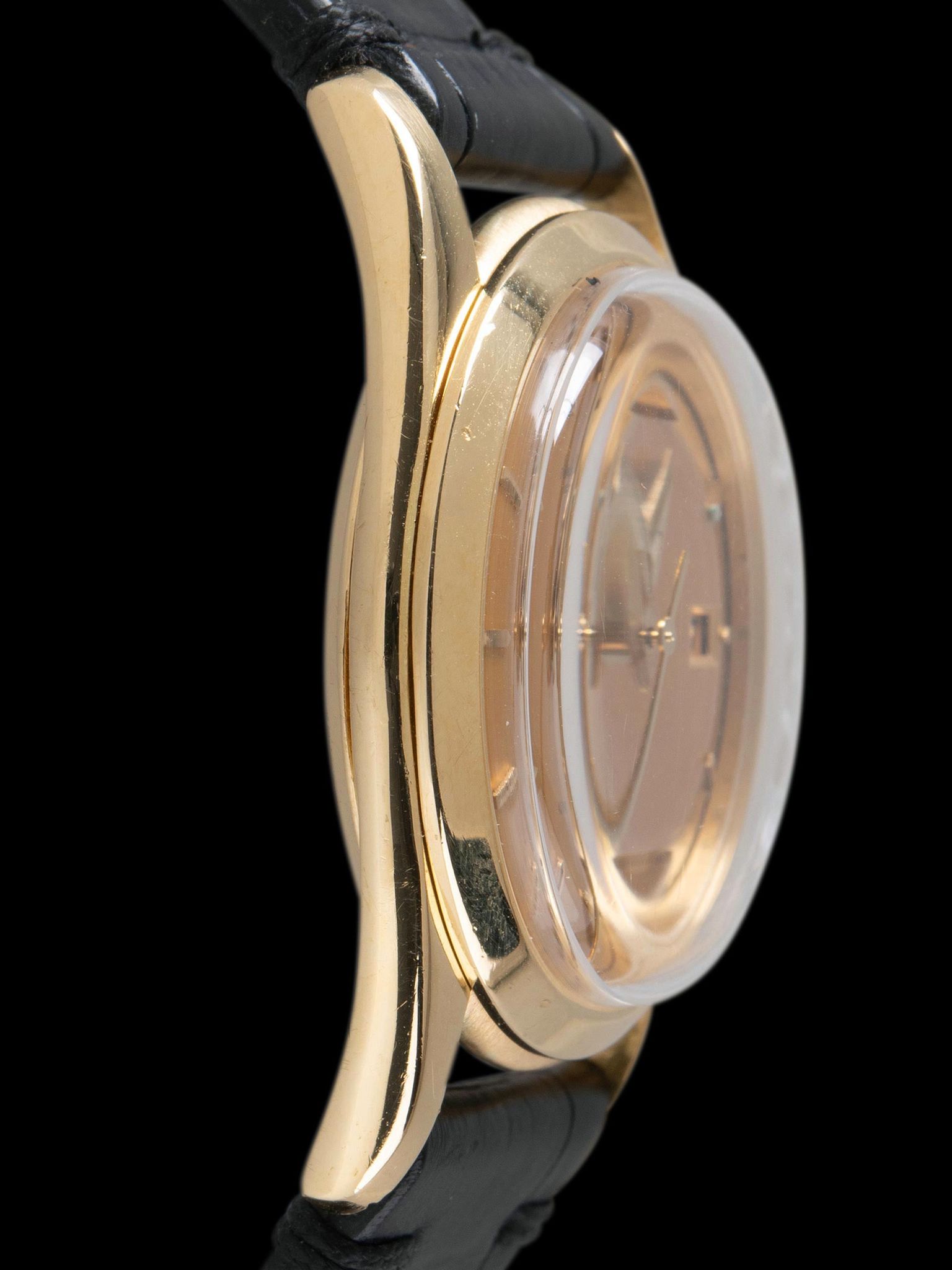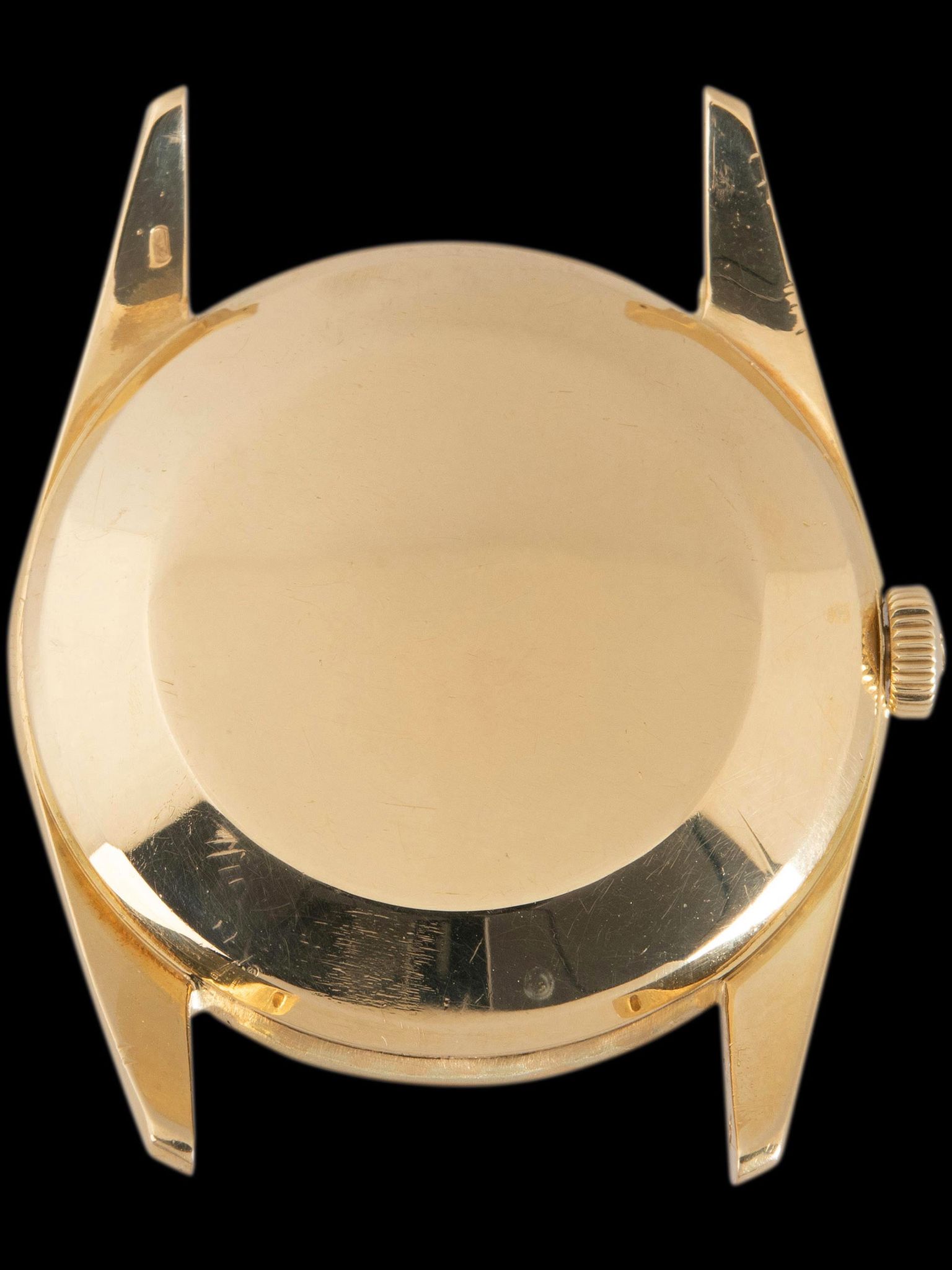 The original satin gold "pie-pan" dial is in wonderful condition with a charming vintage aesthetic, showing some expected elements of age concentrated at the center of the dial. The radium lume plots remain mostly intact throughout the dial though degradation is present under UV light inspection. The original yellow gold dauphine-style hands have been professionally restored with radium and display a pale grey coloration.