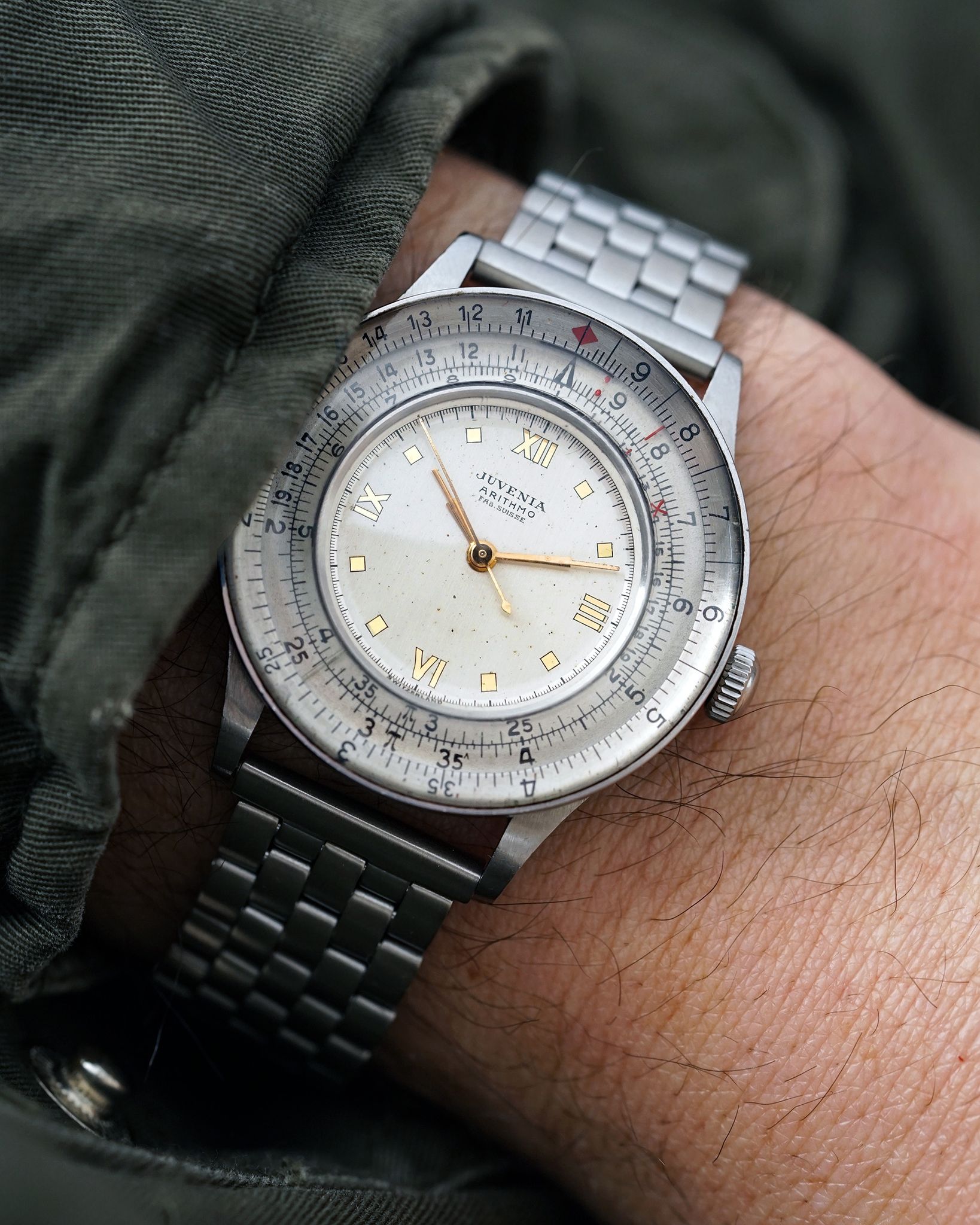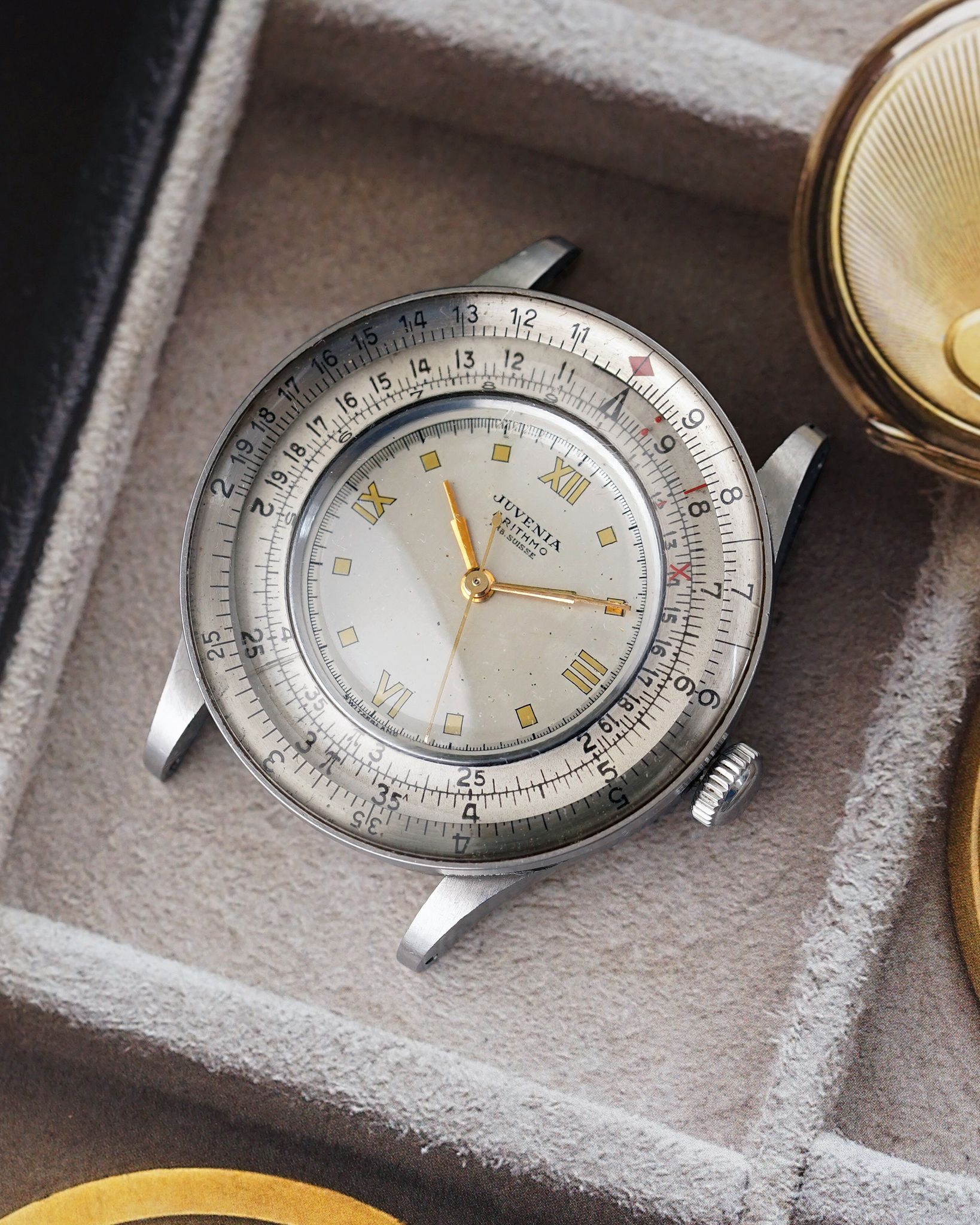 The Juvenia Arithmo, unveiled in 1945, is a remarkable fusion of practicality and design, featuring a slide rule scale paired with a rotating bezel. This ingenious setup allows the wearer to perform a variety of calculations, a concept echoed in the Breitling Chronomat. Once you master the slide rule system, the possibilities are vast—handling complex equations for everything from engineering to trigonometry with ease.
