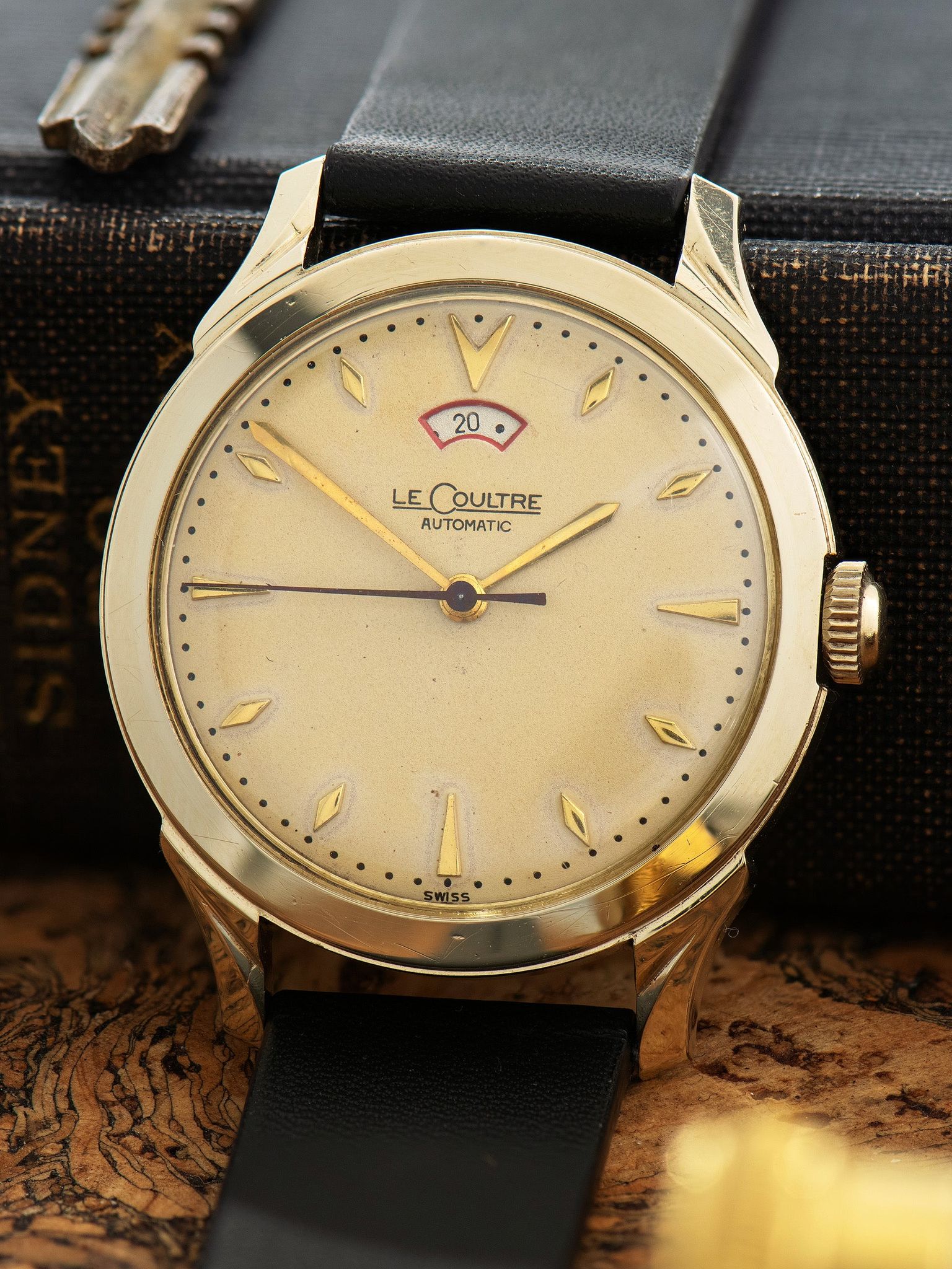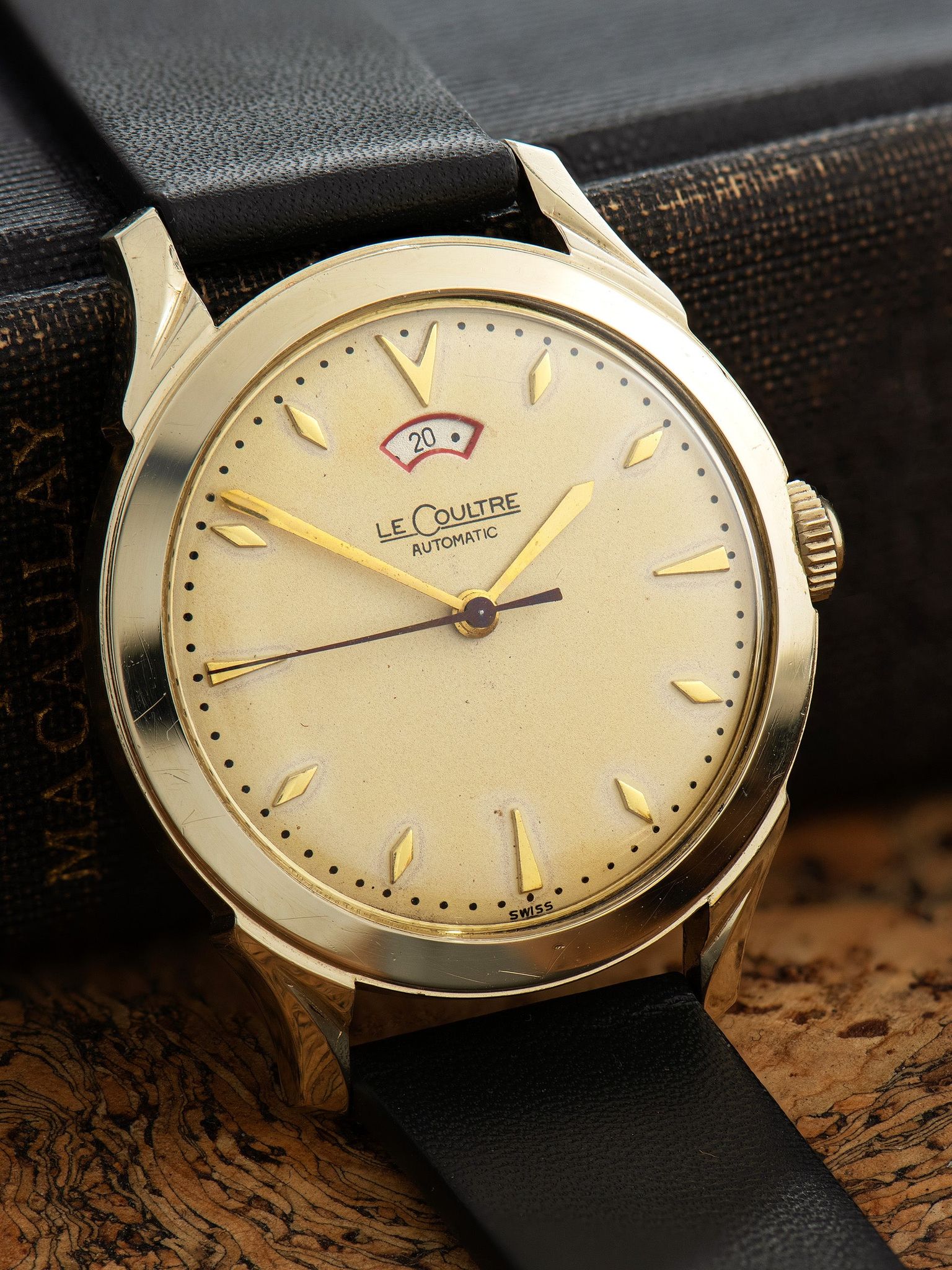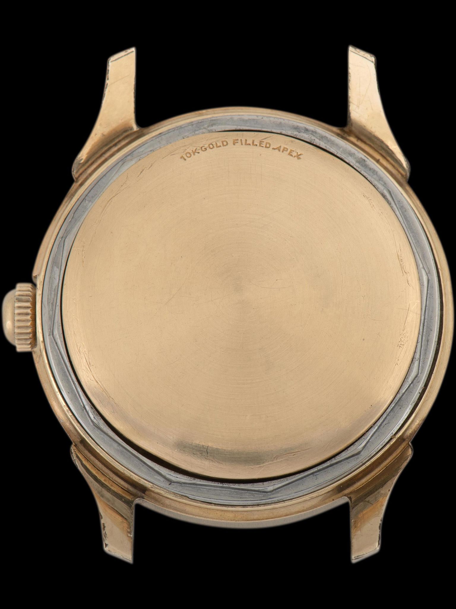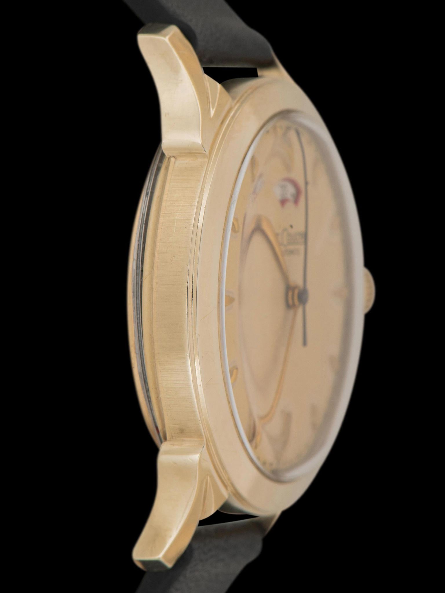 The impressive 10k gold-filled case features beautifully ornate lugs that retain crisp finishing and minimal wear present throughout. The crown is believed to be an early replacement. The case back is in excellent condition with some subtle tool mark wear. The watch comes supplied on a 2pc handmade leather strap.