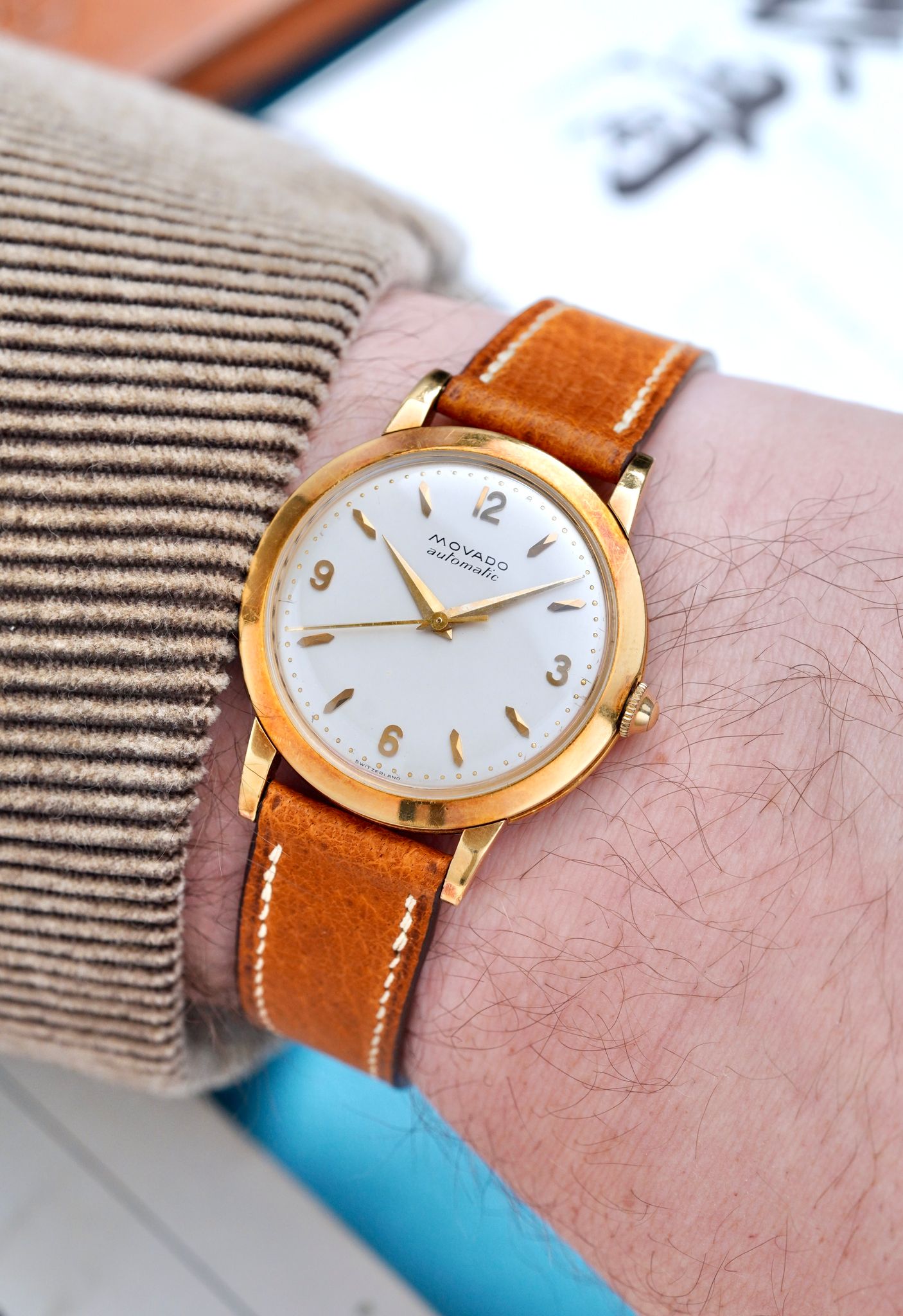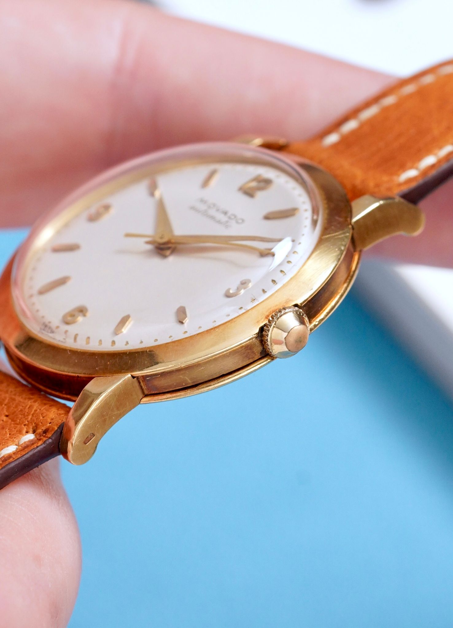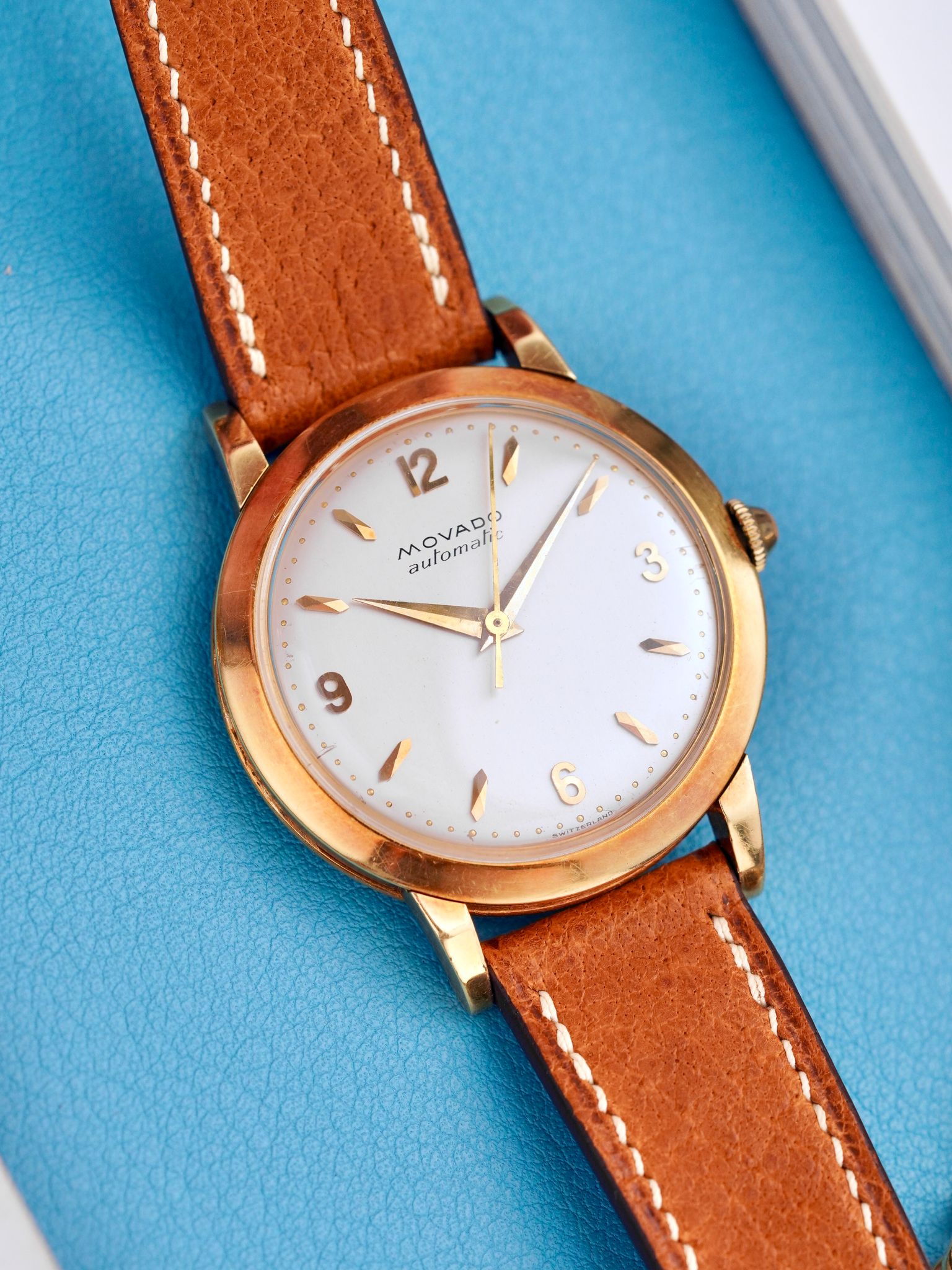 An extremely good looking 1950s Movado Automatic Dress Watch in a 34mm 18K yellow gold sandwich style case, with beautiful applied Arabic numerals and faceted indices, powered by an automatic bumper caliber keeping great time.