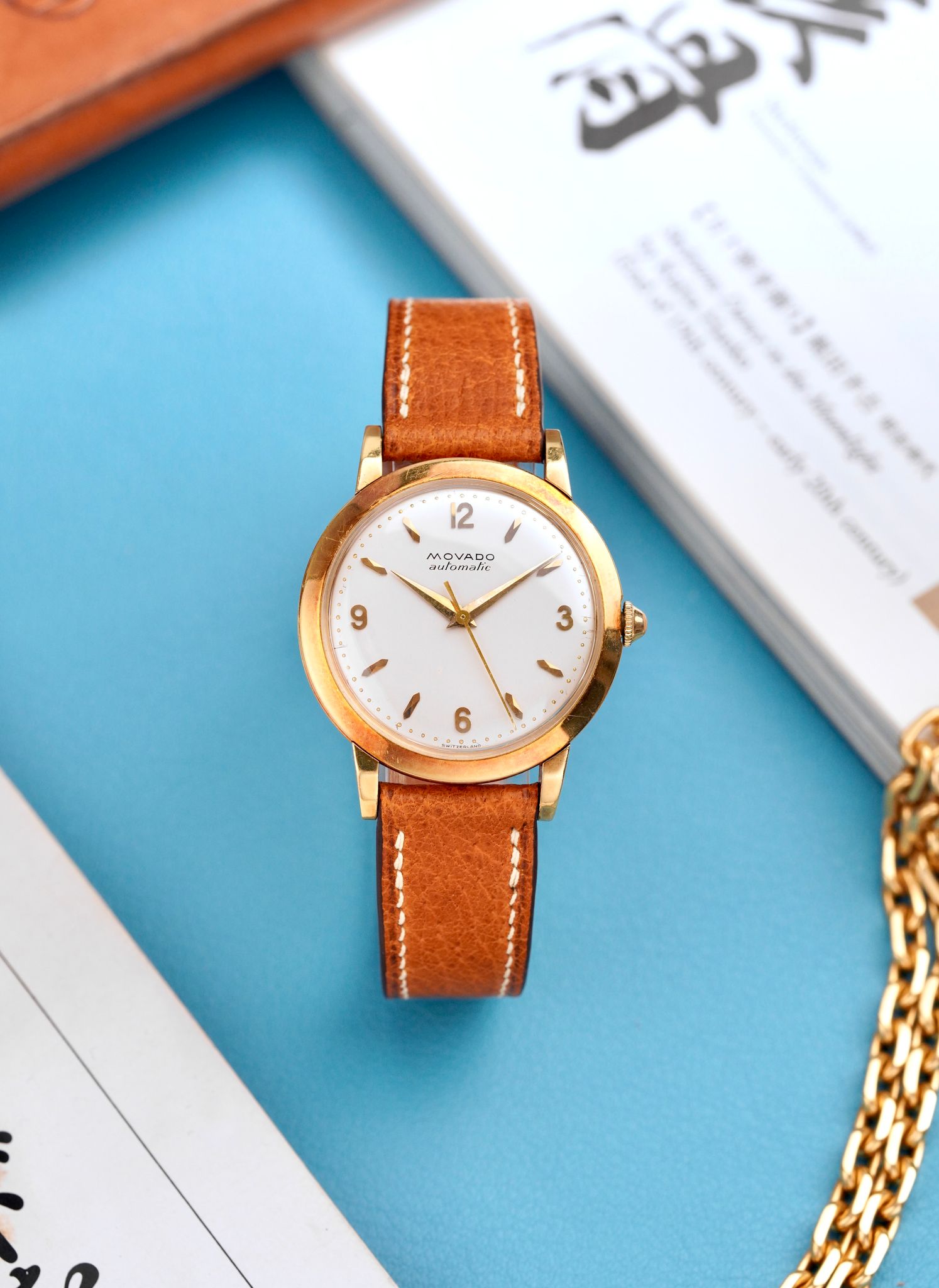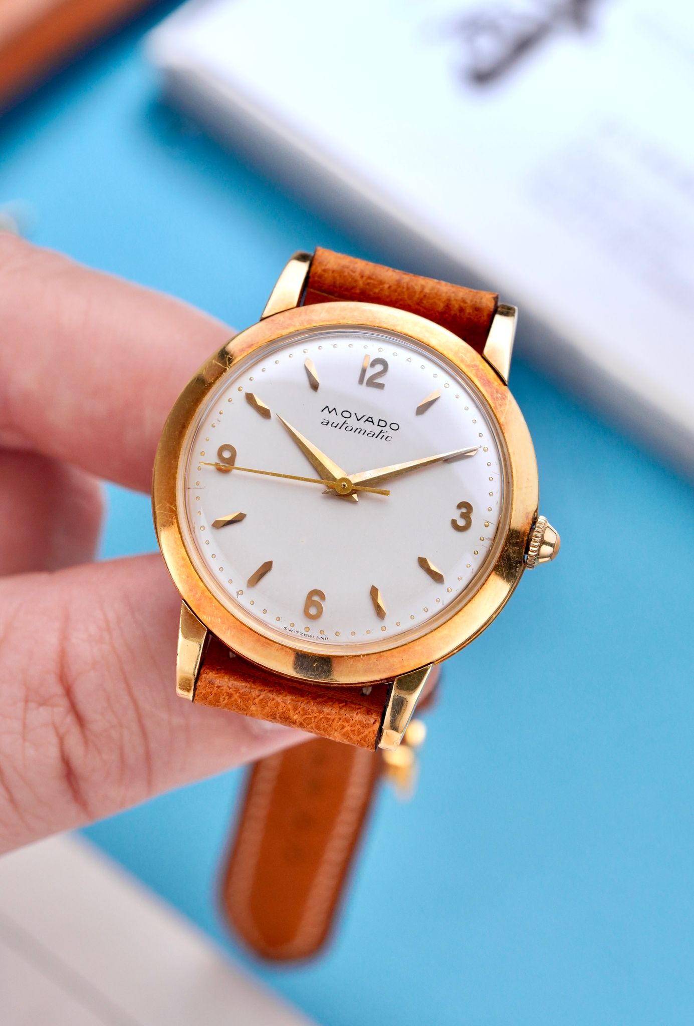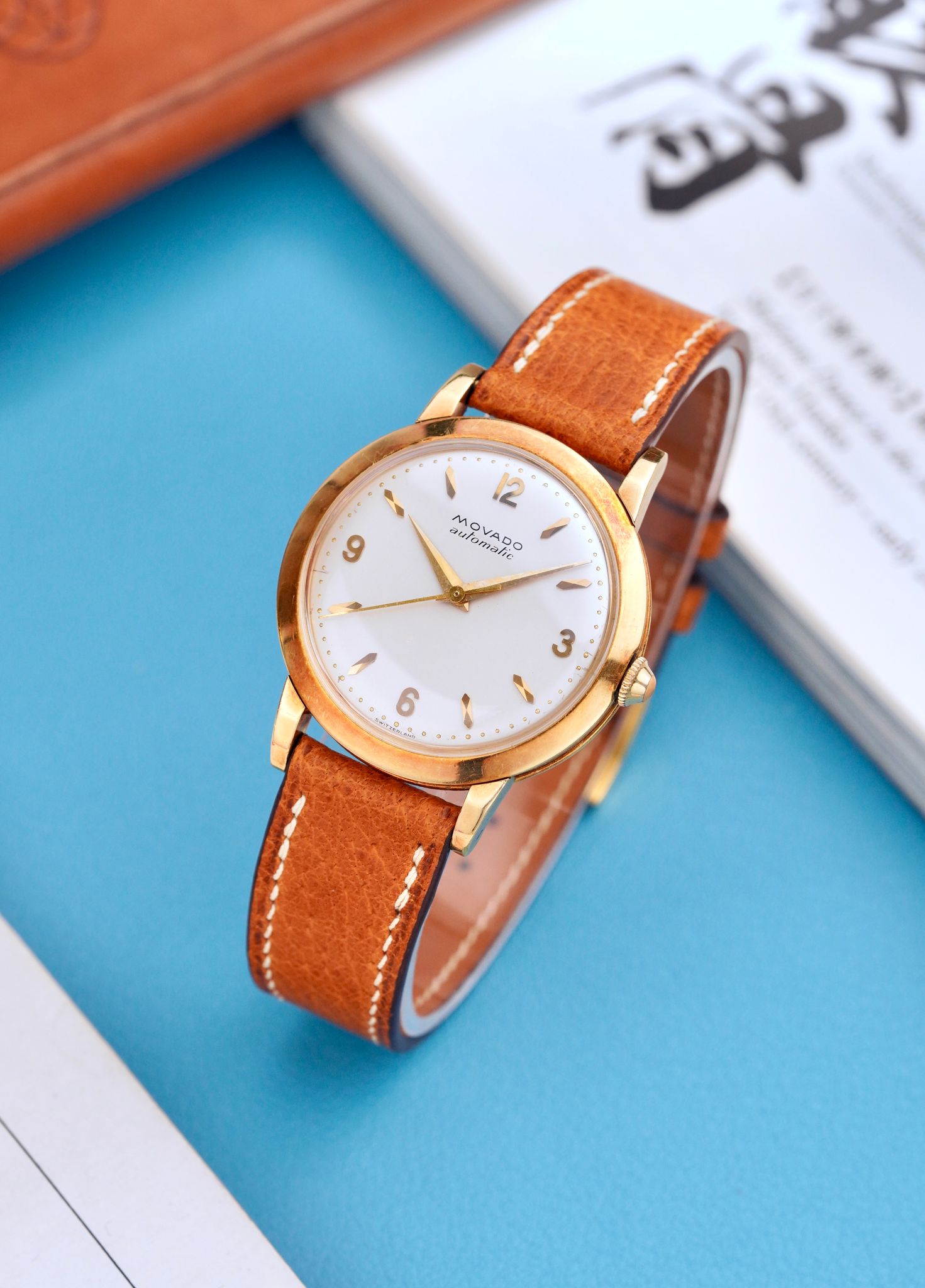 An extremely good looking 1950s Movado Automatic Dress Watch in a 34mm 18K yellow gold sandwich style case, with beautiful applied Arabic numerals and faceted indices, powered by an automatic bumper caliber keeping great time.