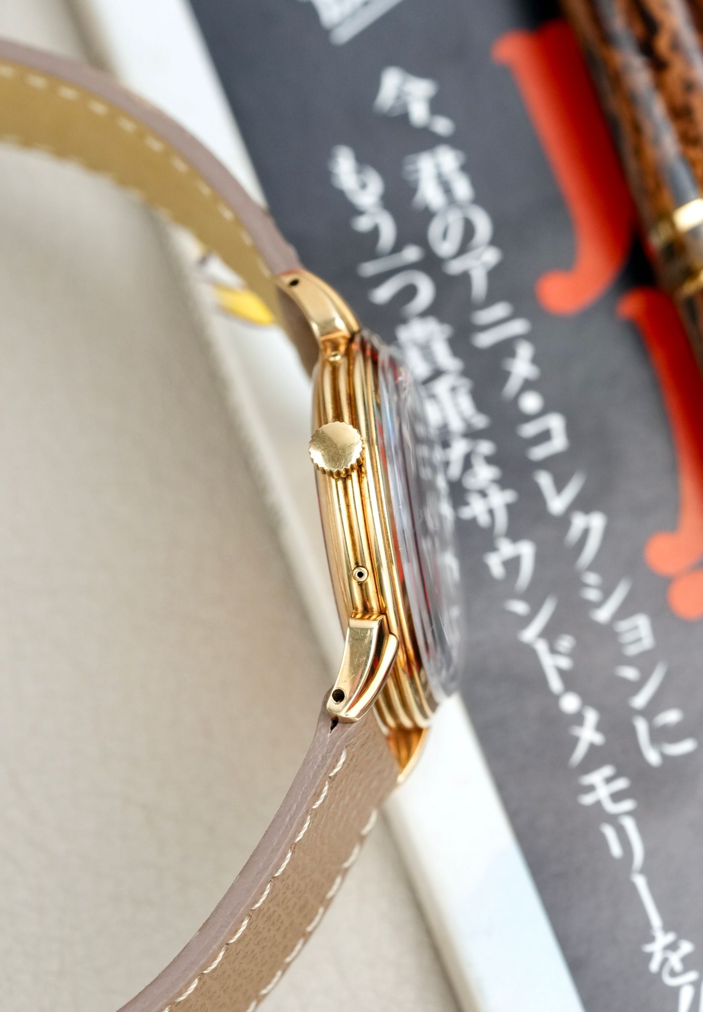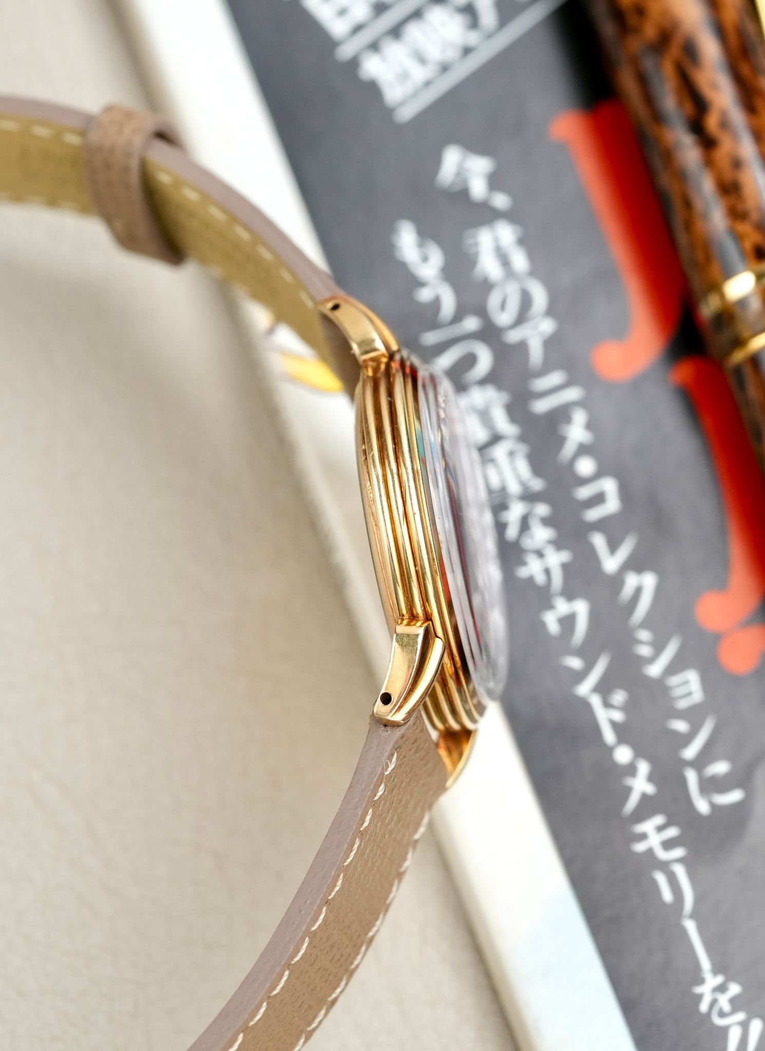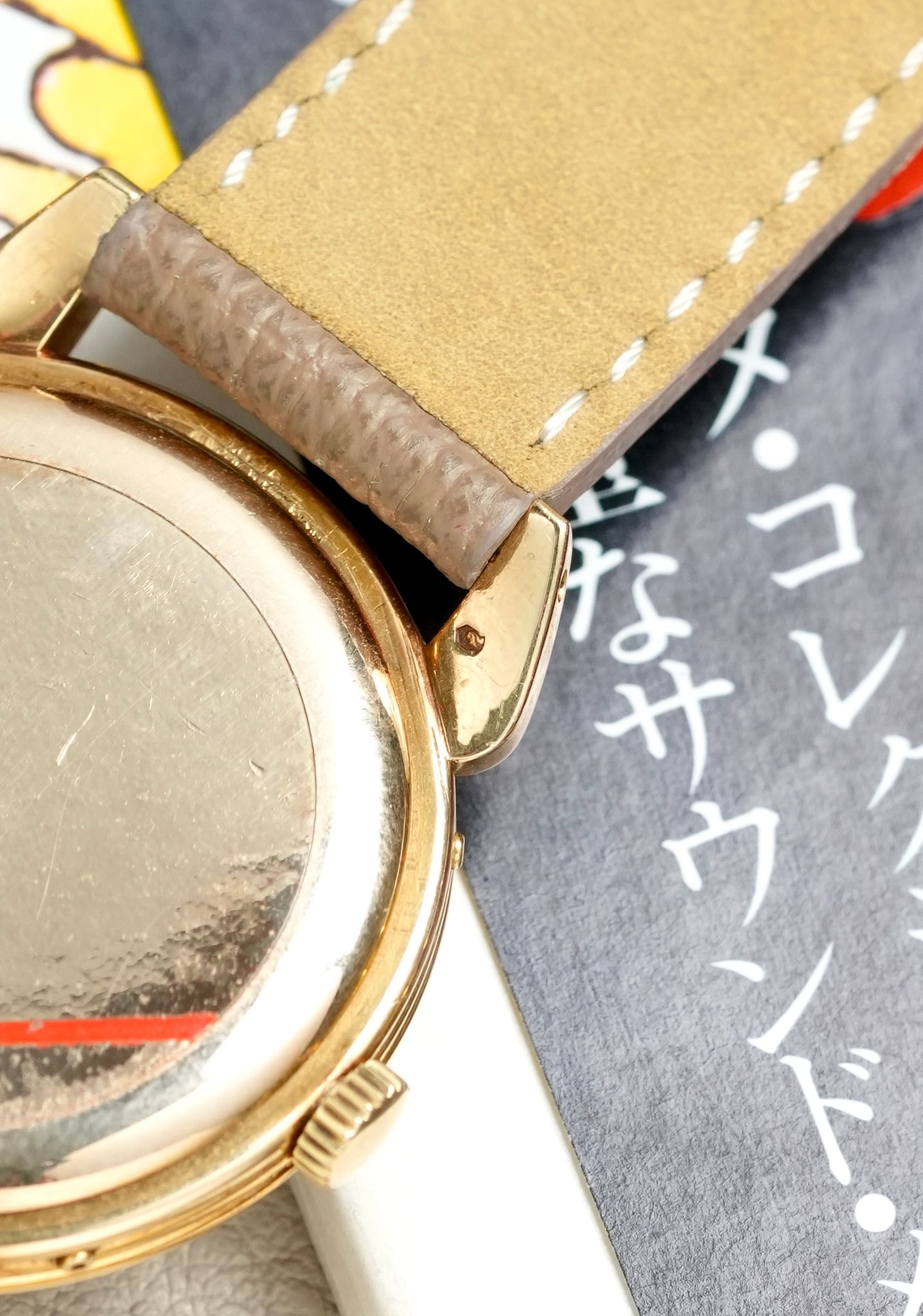 An excellent and barely worn 1950s Movado Triple Calendar in a solid 14K yellow gold Favre Paret ribbed 34.5mm case, signature chicken leg lugs, barely worn with a beautiful unrestored dial sporting applied gilt Breguet indices, gold lollipop date hand, correct stout crown and powered by a manually wound Movado in house caliber, running well and functioning perfectly.