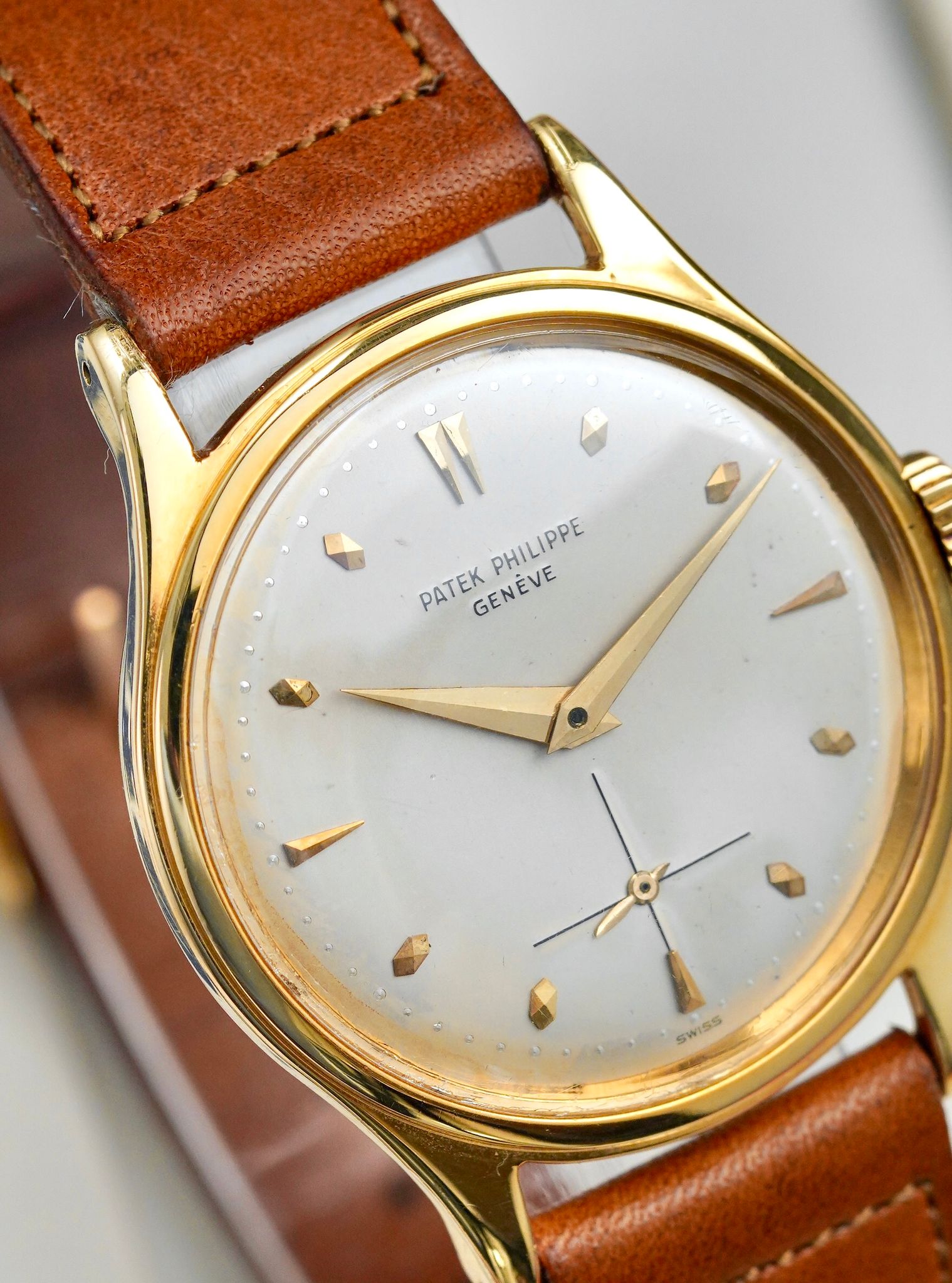 A stellar 1950s Patek Philippe ref. 2509 in 18K yellow gold, this a large for the era Calatrava with a screw down case back, a beautiful dial with hard enamel signatures pronounced and sharp, uncommon stubby sub-seconds register at 6, with faceted and triangle applied indices, all in a case that has most likely been polished but only seldom, which retains even lugs and slab sides and its correct large unsigned crown.