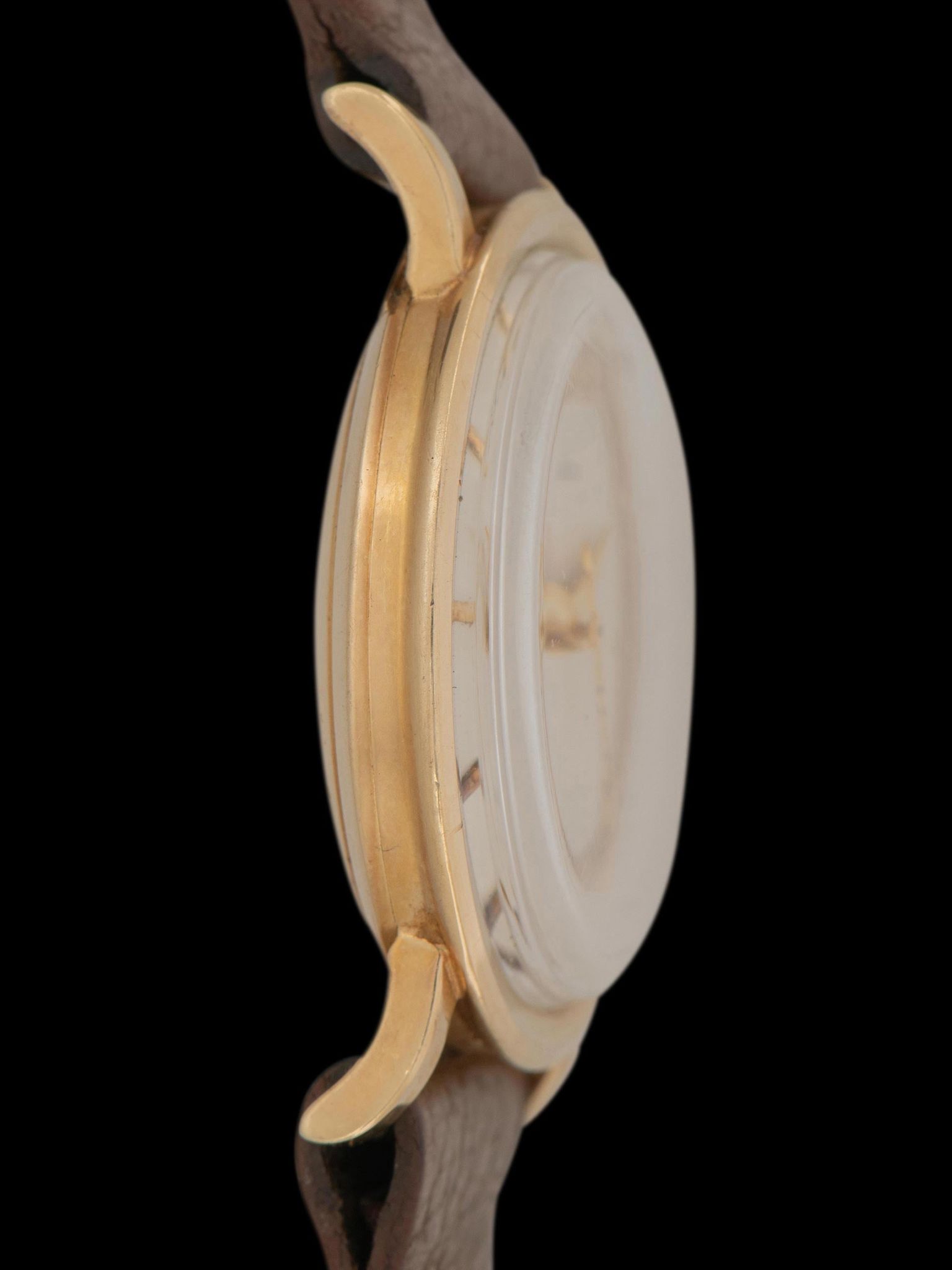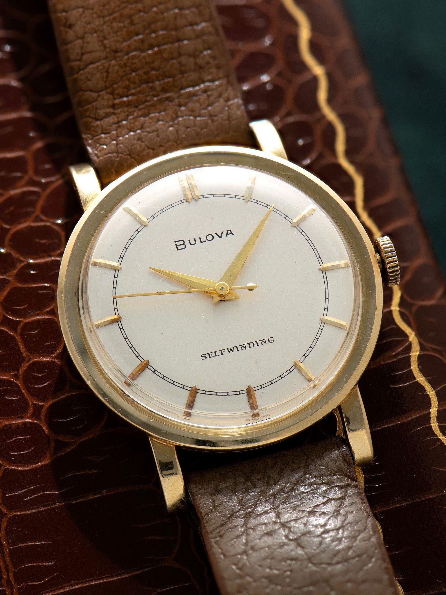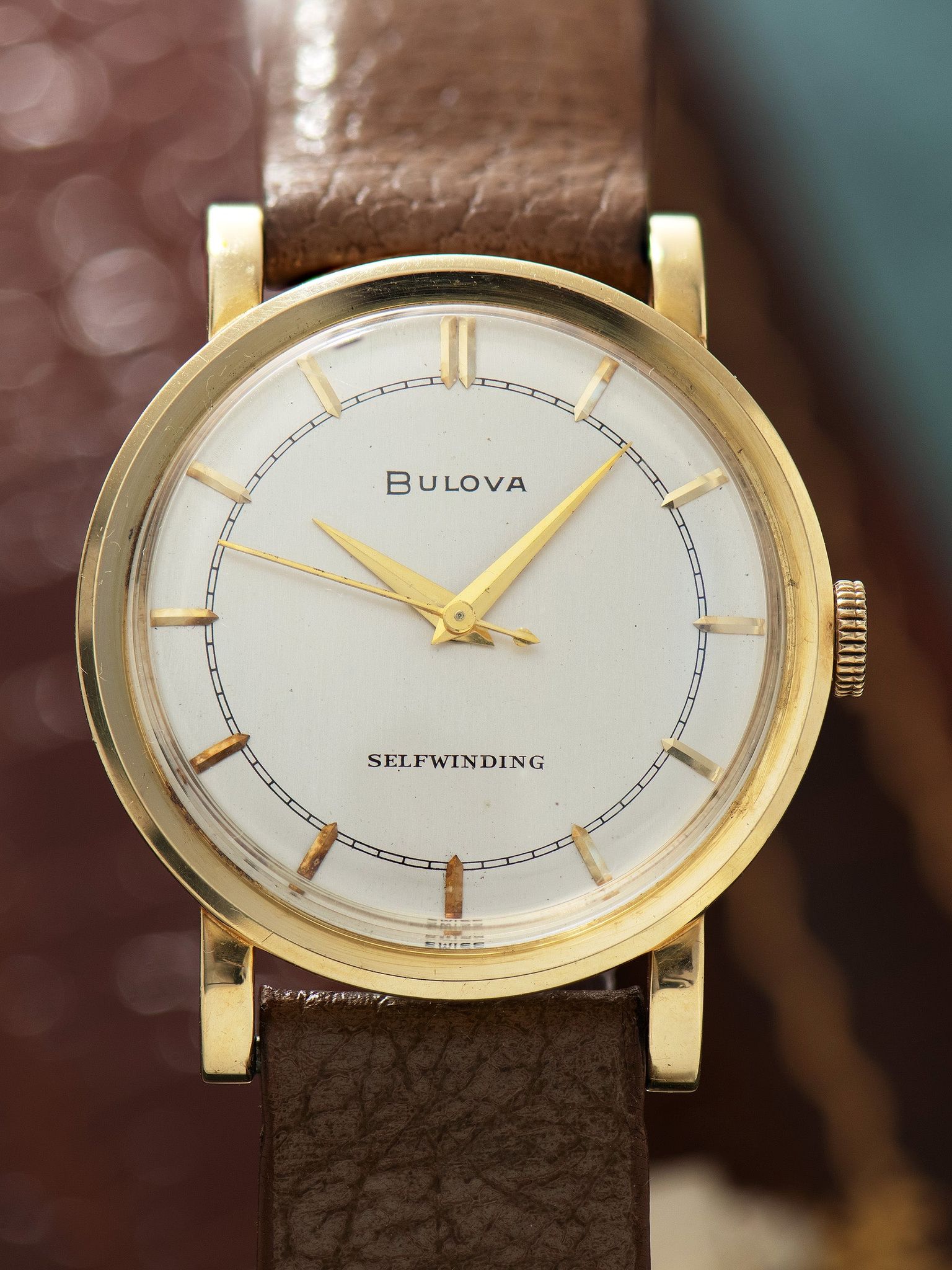 This mid-century model from Bulova was likely one of the brand's premier offerings at the time, cast in a robust 34mm solid 14k yellow gold case with an automatic movement, with a clean aesthetic to the dial.